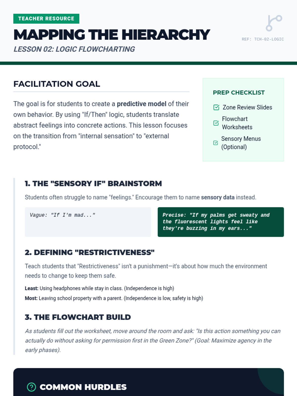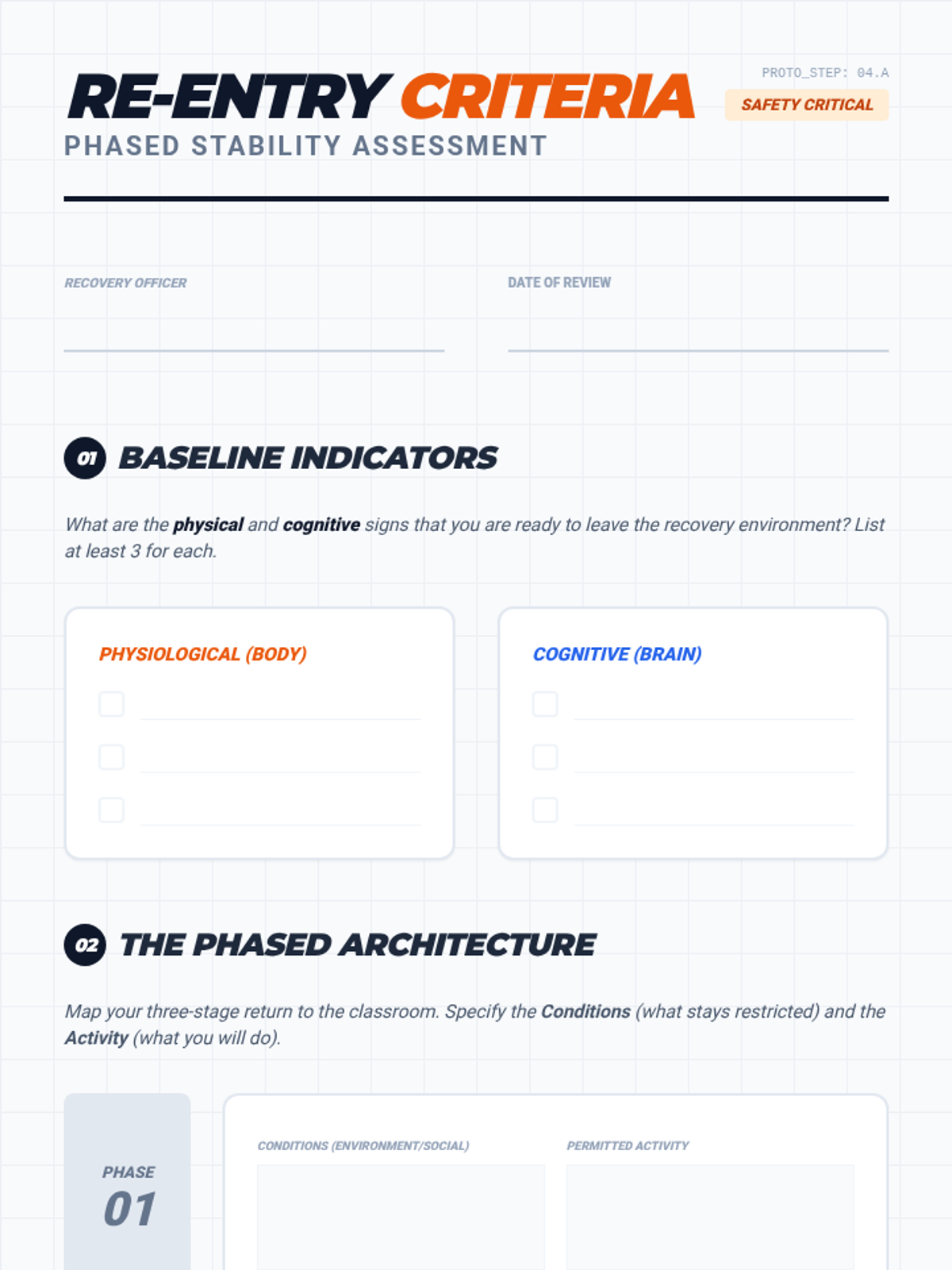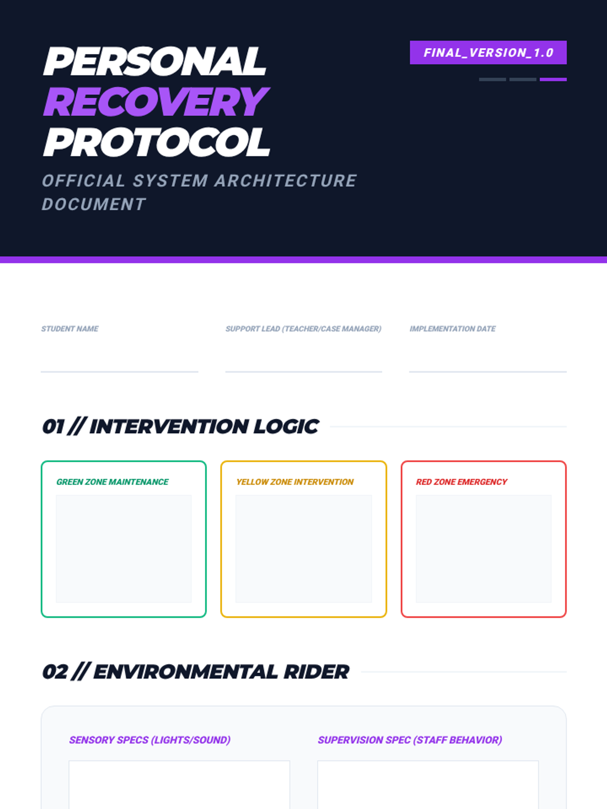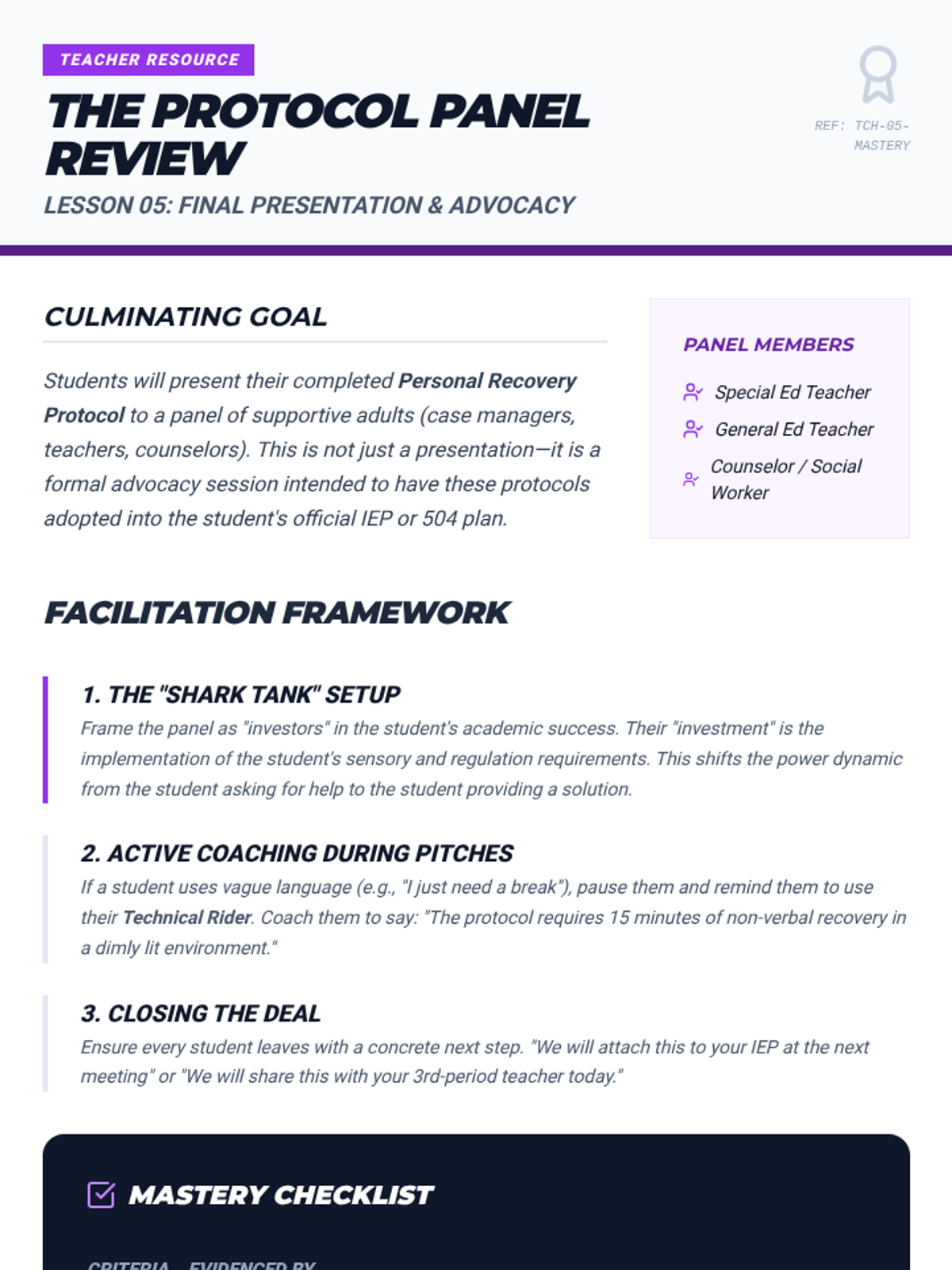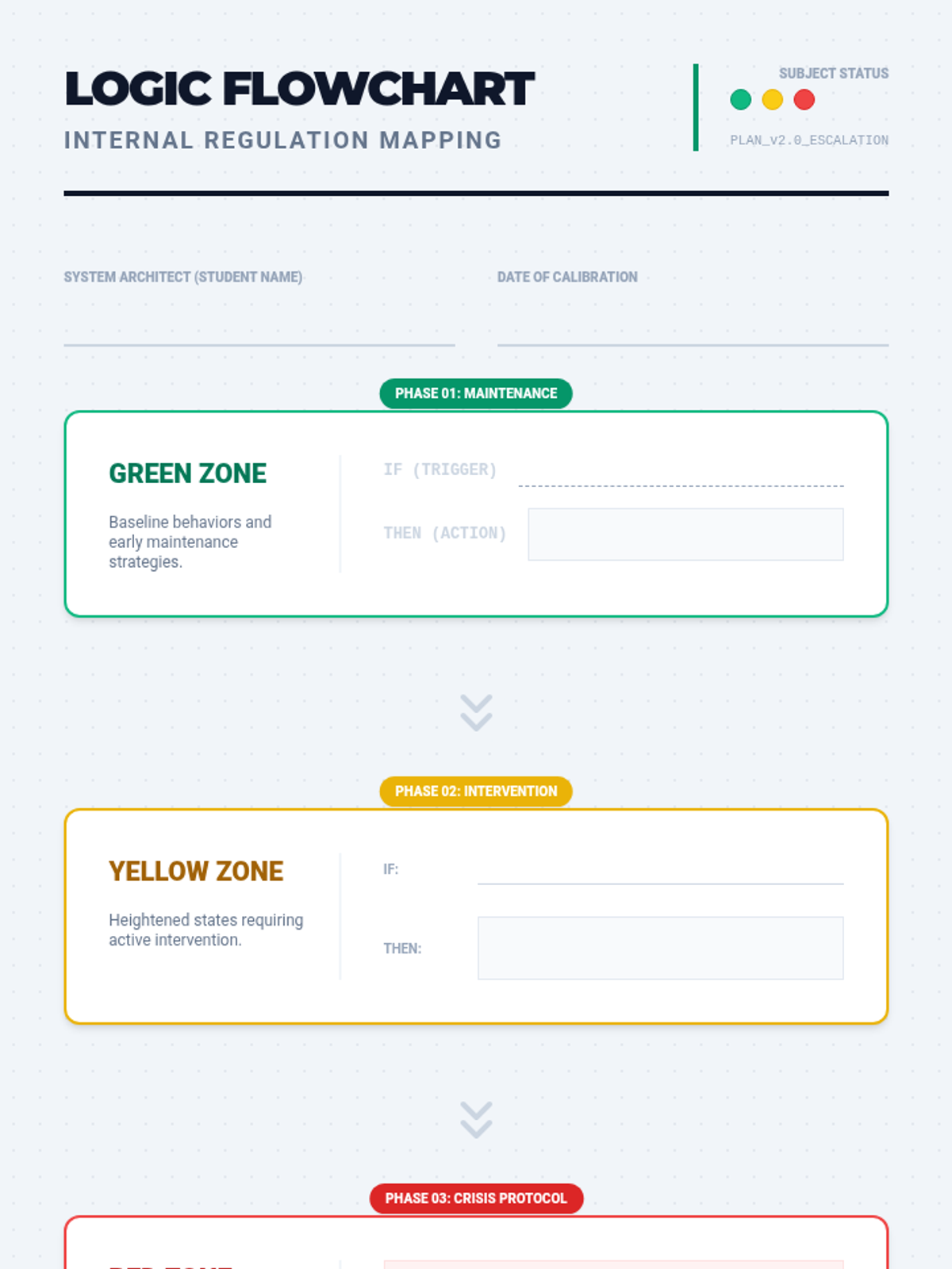 A professional, project-based sequence for 11th-grade students to develop a formal, written 'Crisis Recovery Plan.' Students analyze existing protocols, define a hierarchy of interventions, specify environmental needs, and establish re-entry criteria to advocate for their sensory and emotional needs within school or workplace settings.