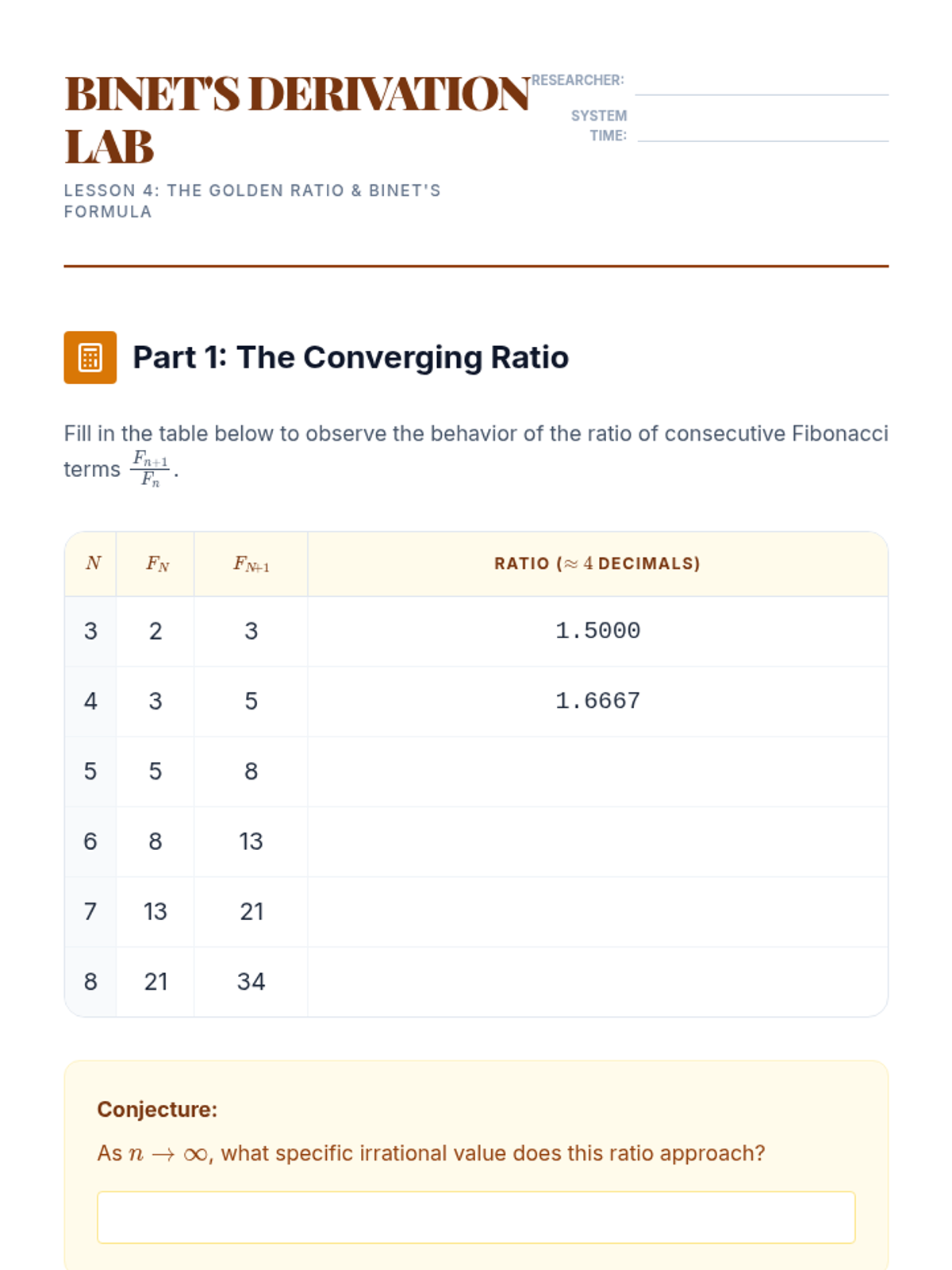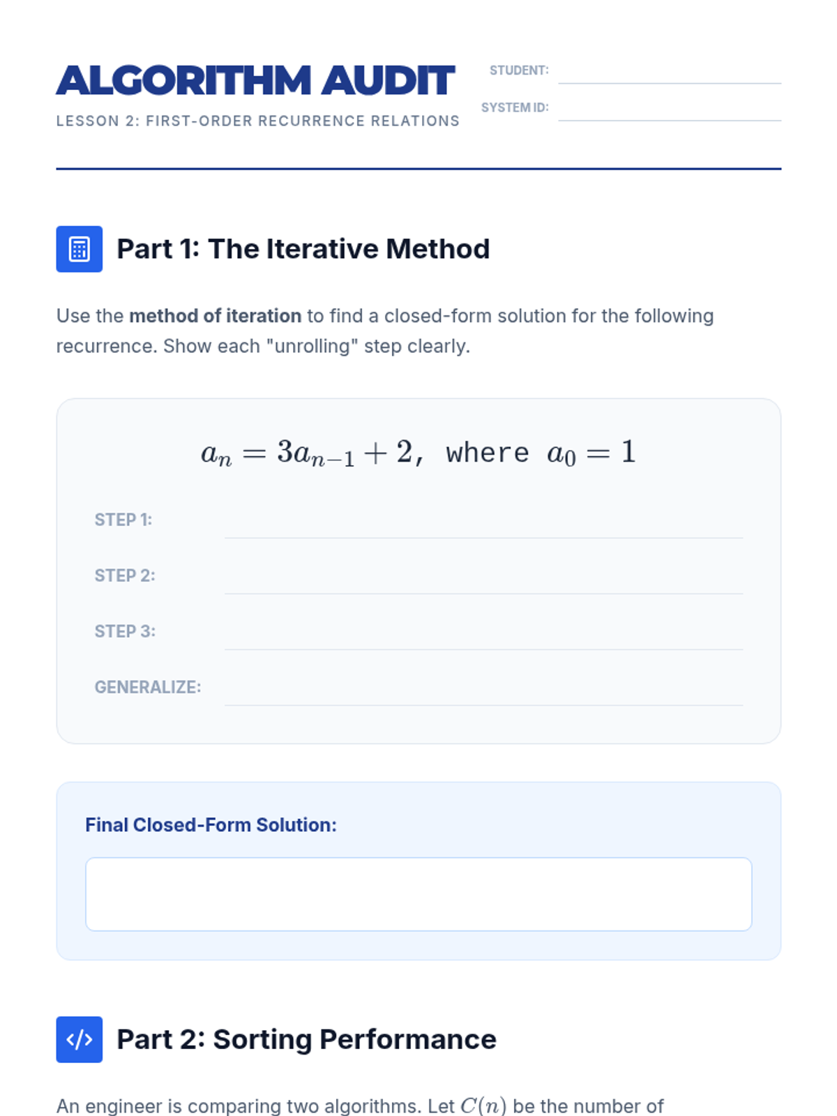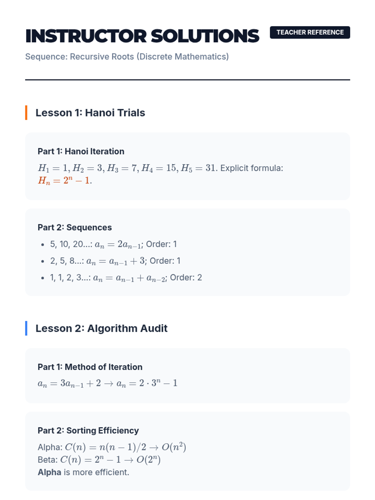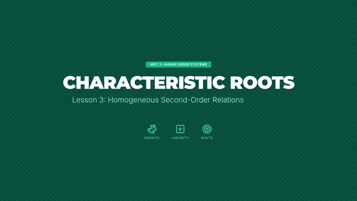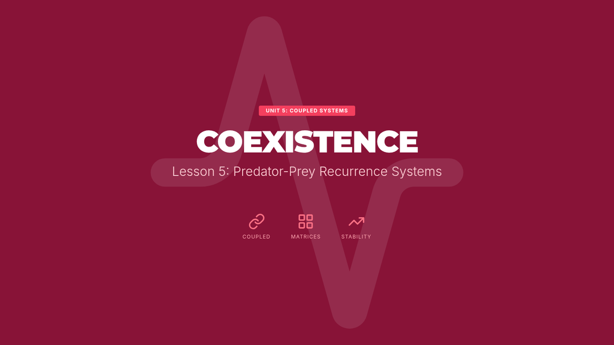 A comprehensive exploration of linear recurrence relations, from first-order foundations to complex second-order systems and real-world predator-prey modeling. Undergraduate students transition from recursive thinking to closed-form solutions, applying discrete math to algorithm analysis and biology.