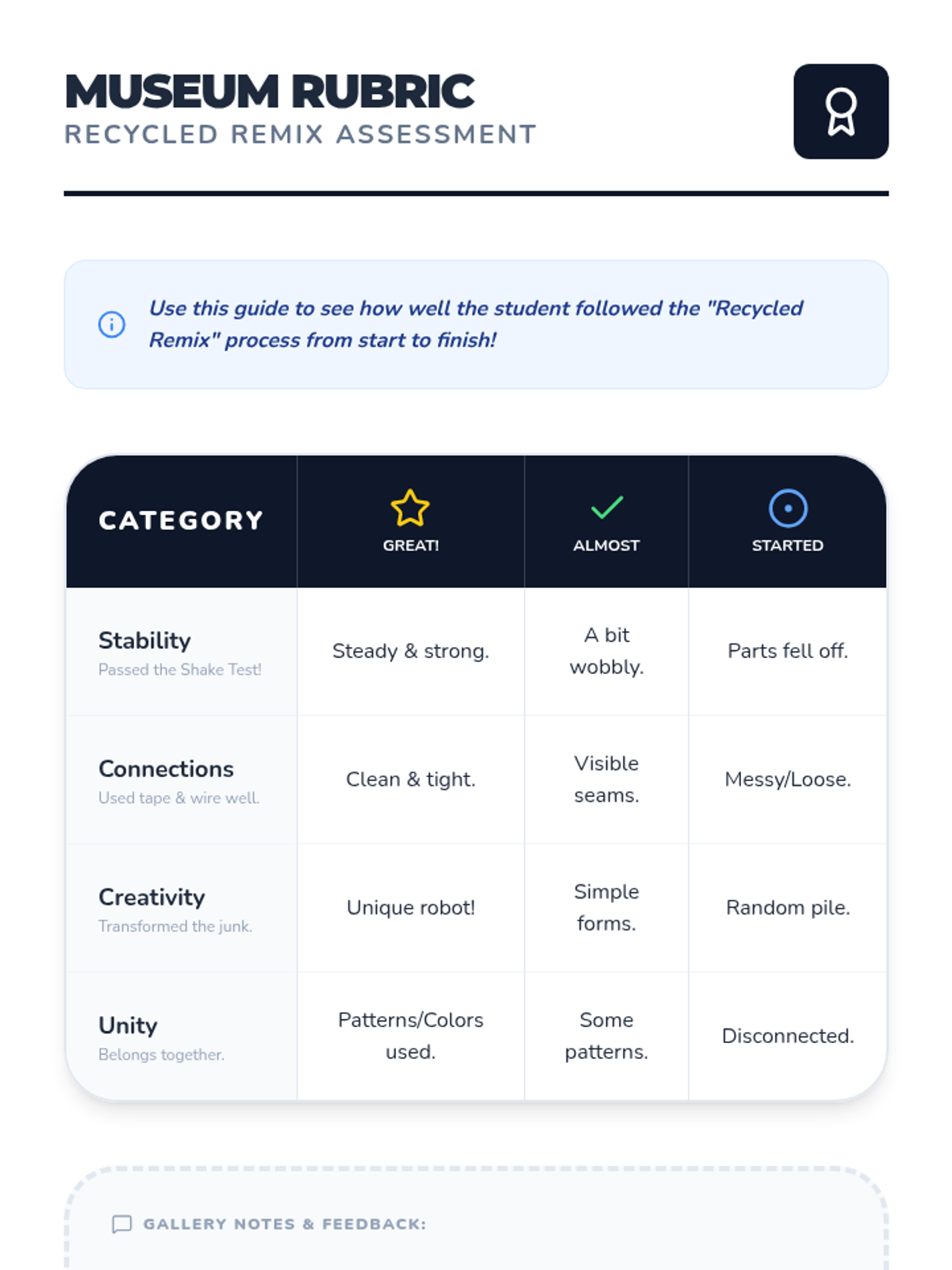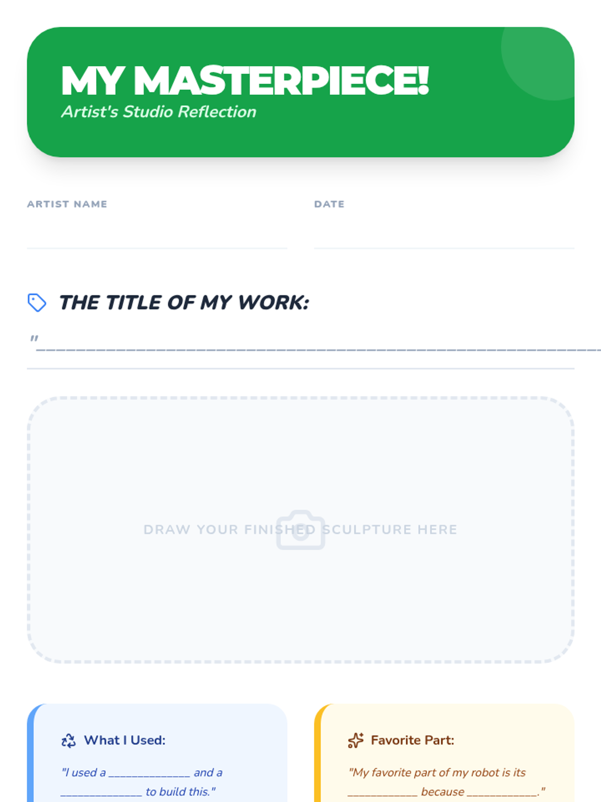 A sequence for 1st Grade students on assemblage art, focusing on building sculptures from found objects and recycled materials while exploring engineering concepts like stability and connection.