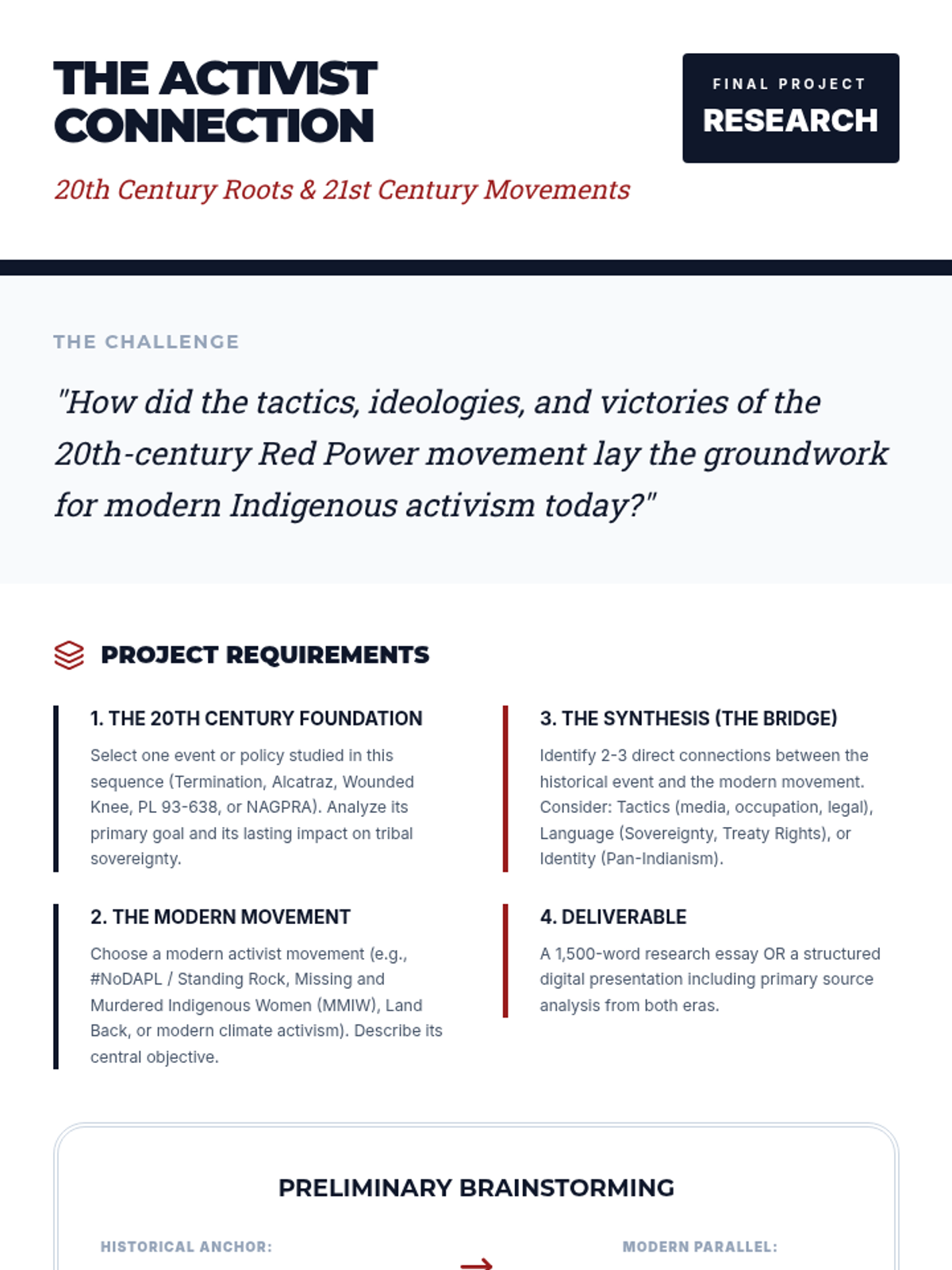 This sequence explores the 20th-century resurgence of Indigenous political power, from the termination policies of the 1950s to the Red Power movement and the legislative victories of the 1970s. Students analyze how urbanization, media visibility, and legal battles redefined Indigenous identity and reclaimed political autonomy.