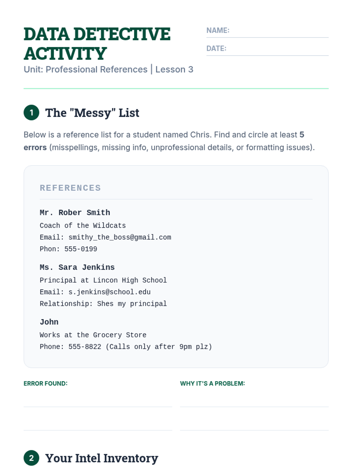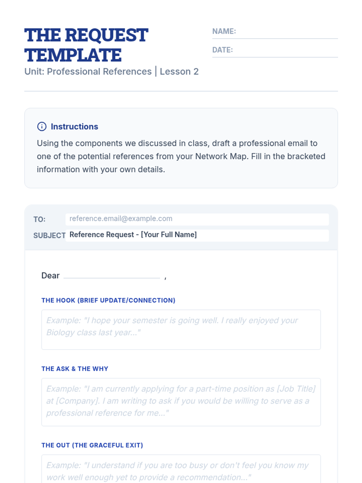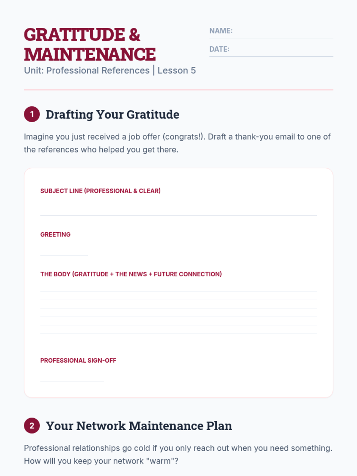 A comprehensive 5-lesson unit for 9th graders on identifying, requesting, and formatting professional references. Students transition from brainstorming their network to producing a polished reference document and learning long-term relationship maintenance.
