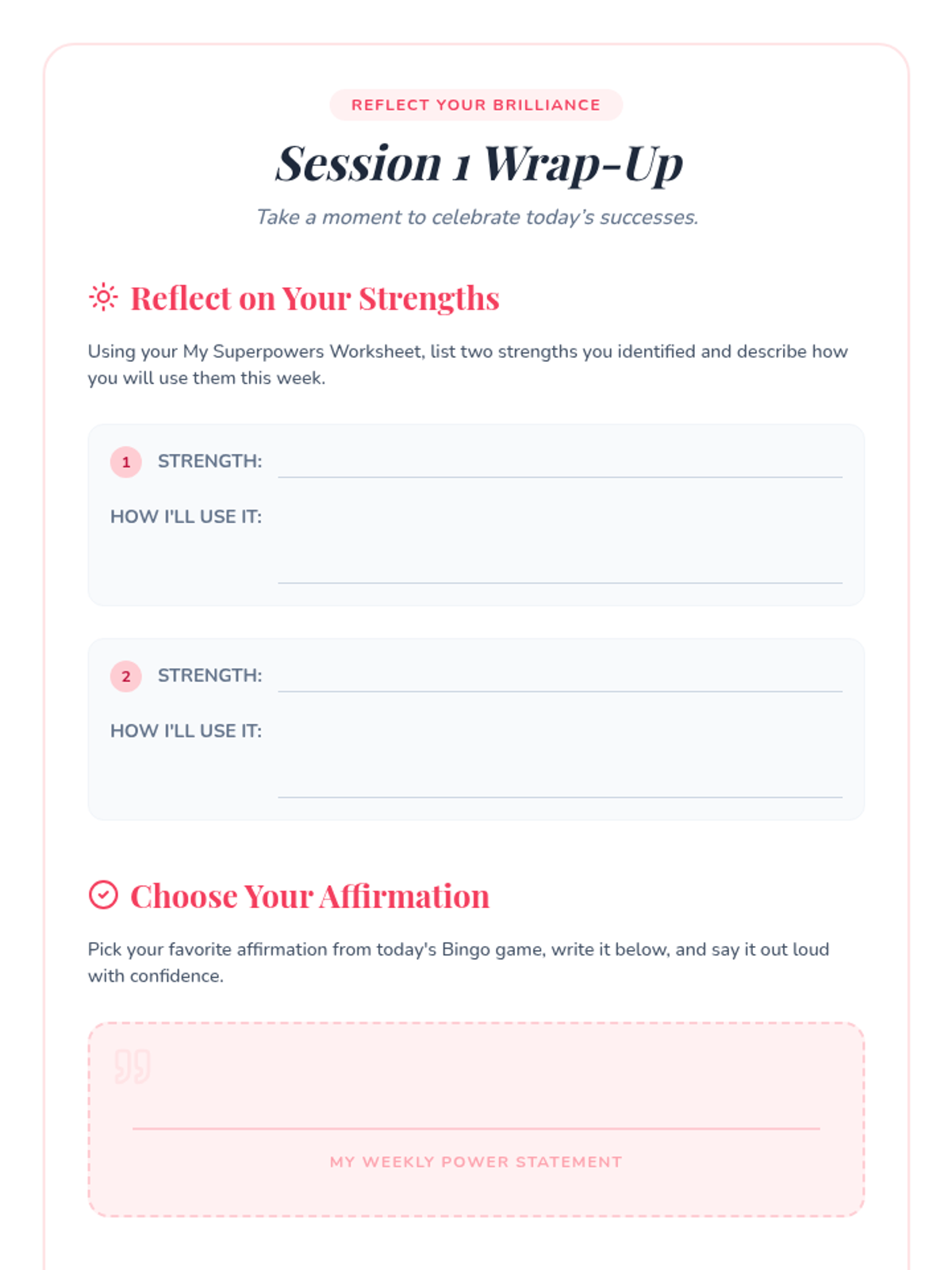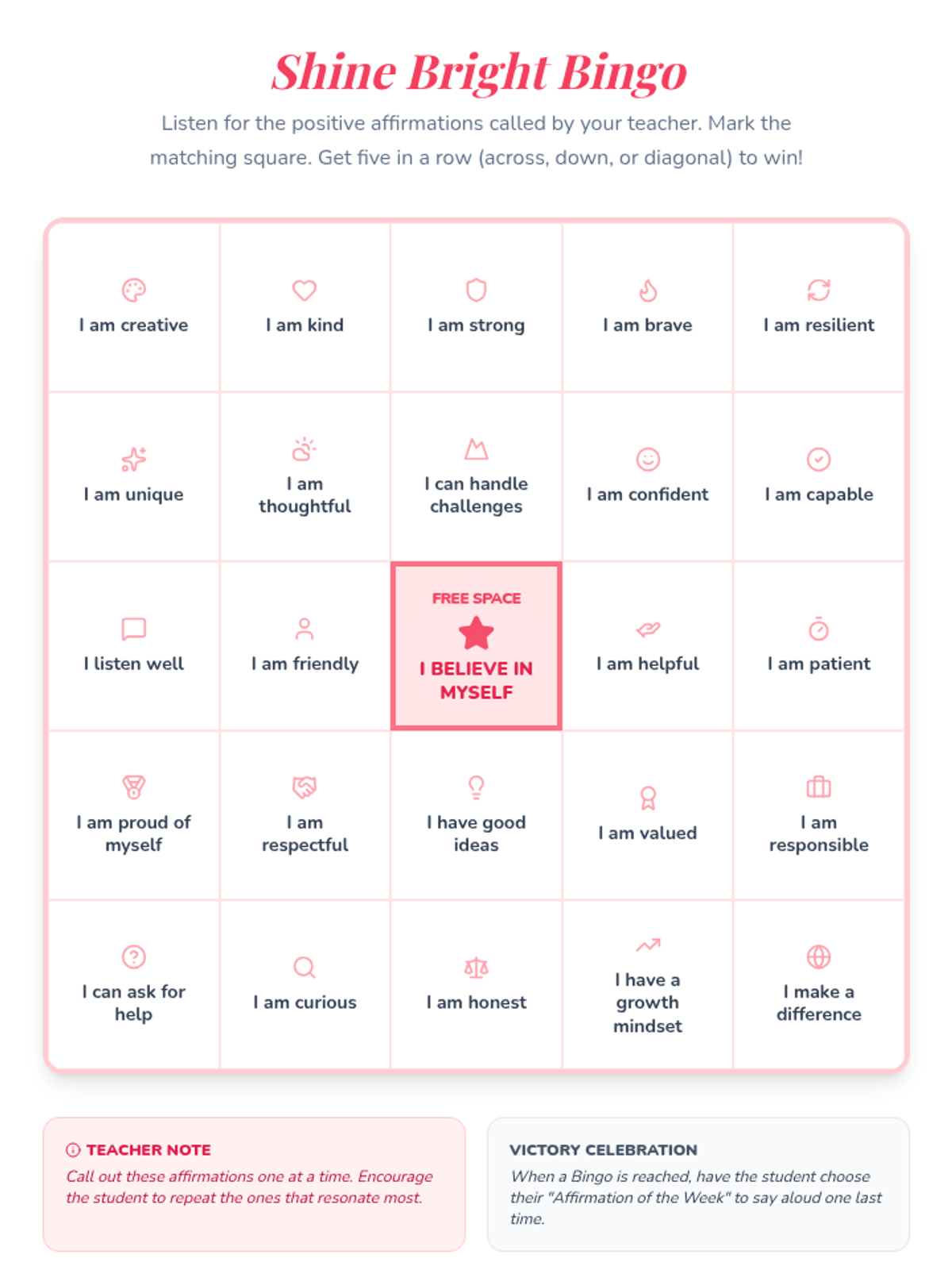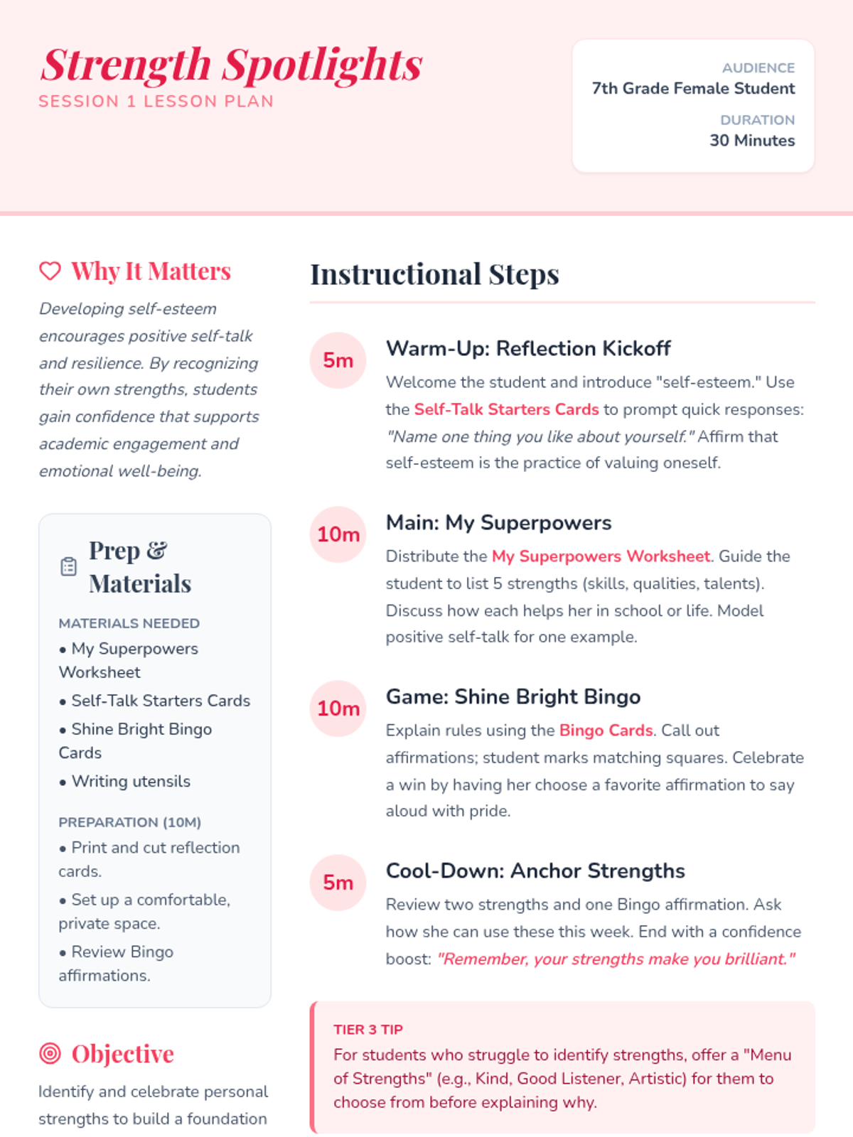 A two-session individualized self-esteem unit for a 7th-grade female student, focusing on recognizing strengths, reframing negative thoughts, and building confidence through interactive activities and games.