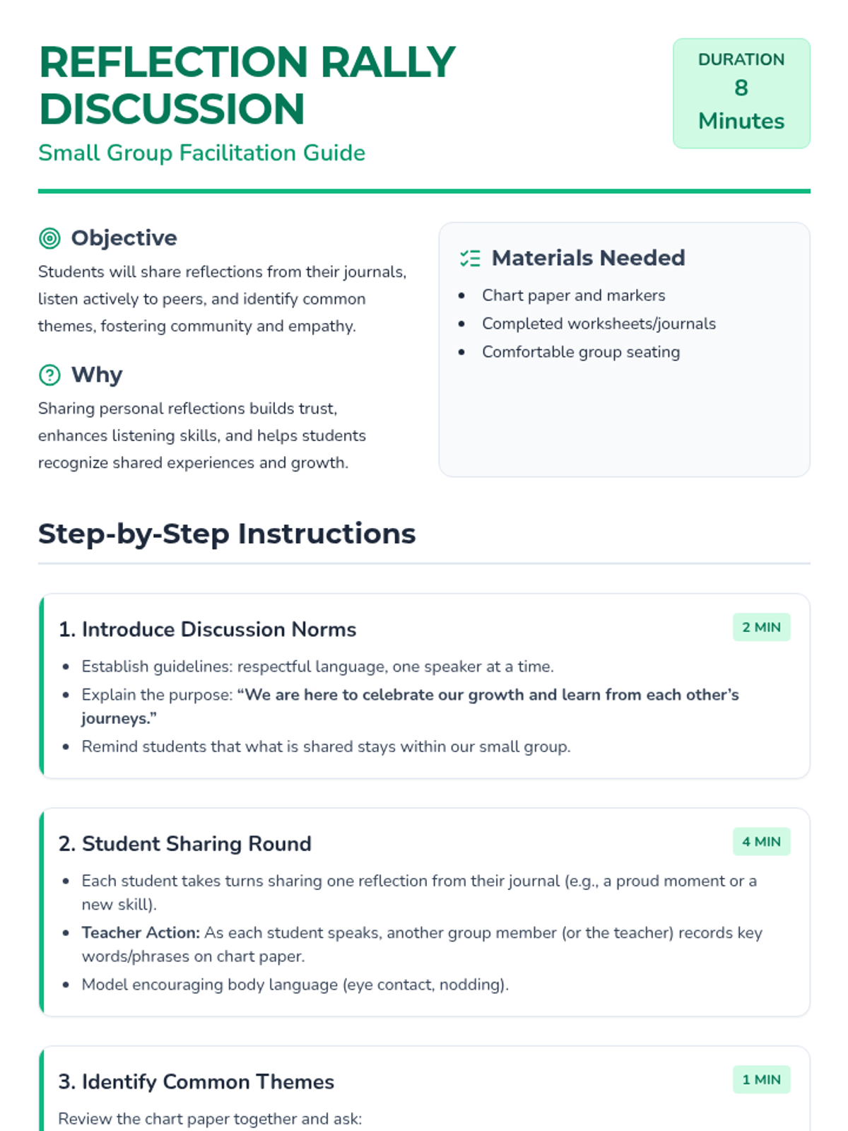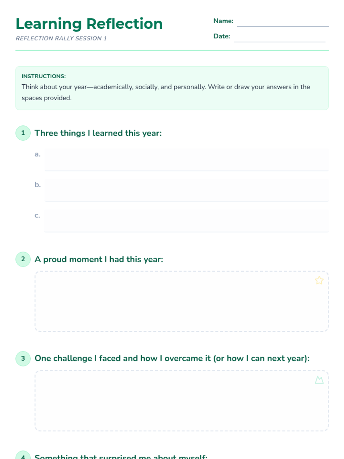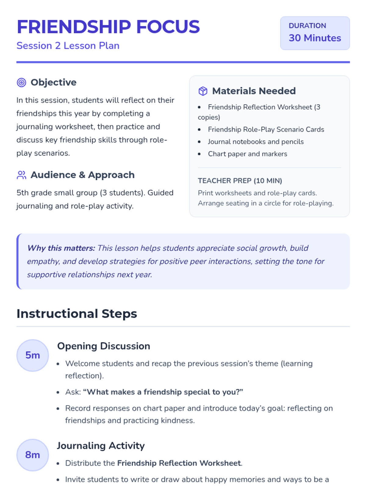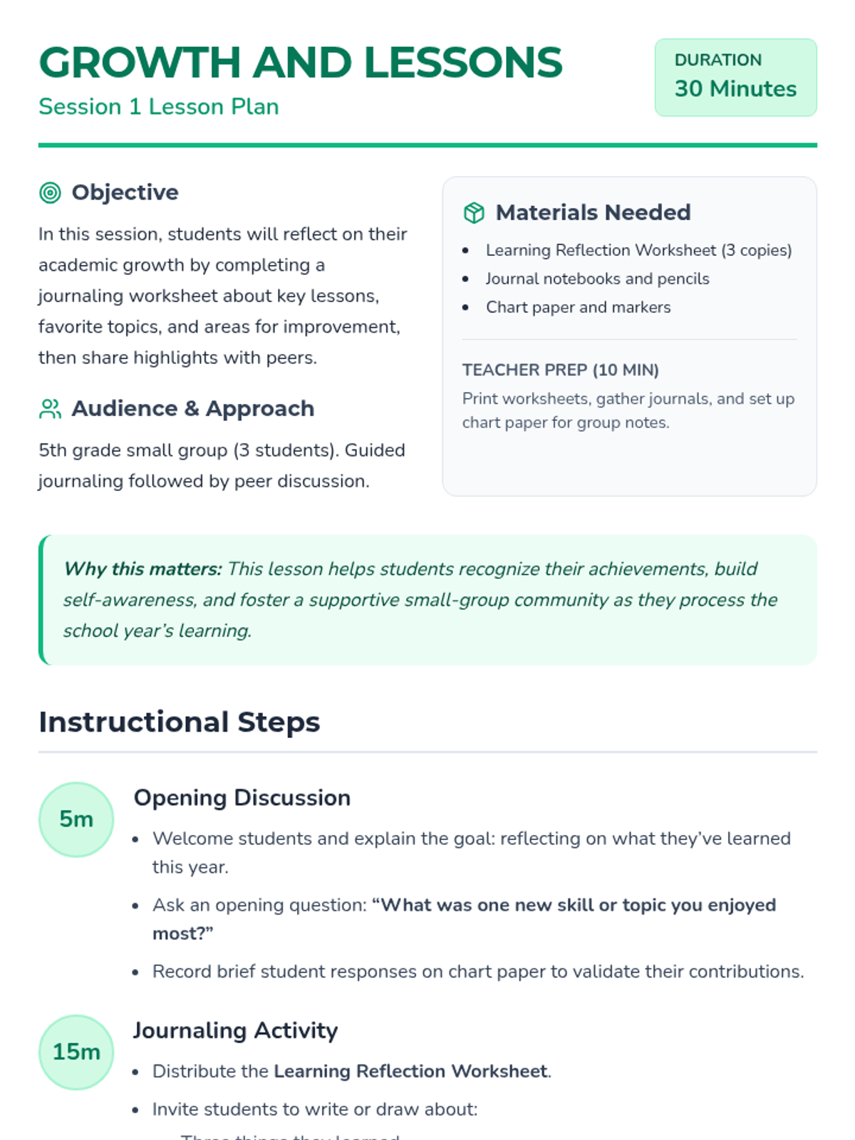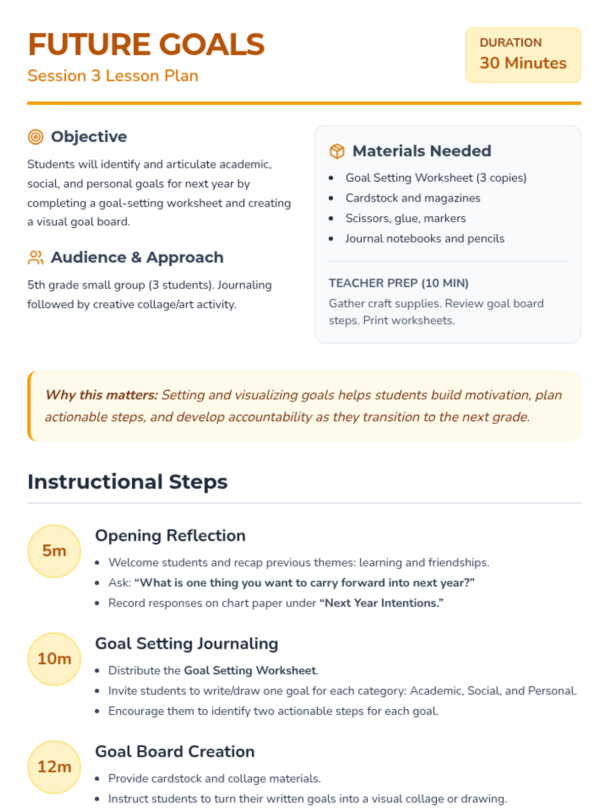A three-session small-group journaling journey for 5th graders to reflect on their academic growth, friendships, and future goals as the school year concludes.