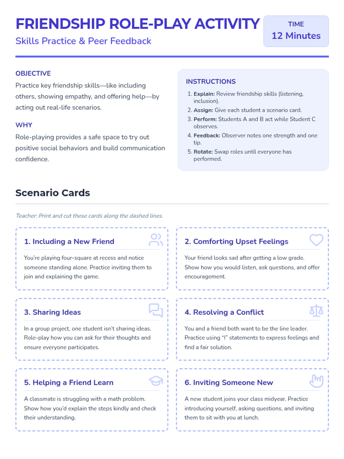 A comprehensive 4-day small group program focusing on essential social-emotional skills including emotional regulation, active listening, friendship building, and conflict resolution.