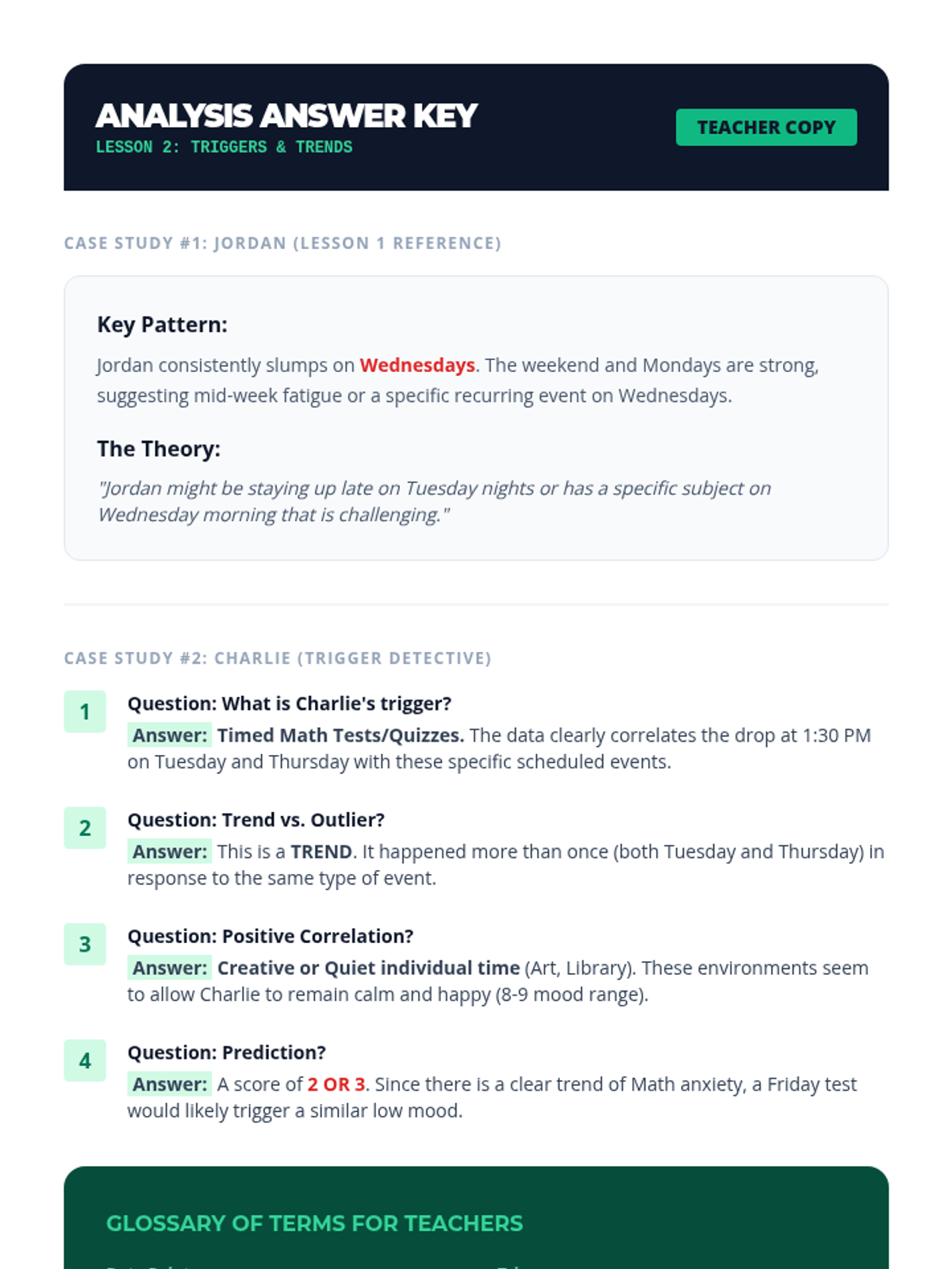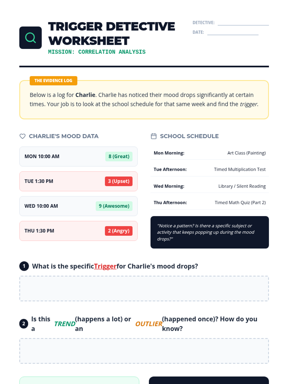 A 5th-grade inquiry-based sequence that teaches students to analyze their daily check-in responses as data. Students learn to identify trends, correlate triggers, and develop proactive self-regulation strategies based on longitudinal behavioral patterns.