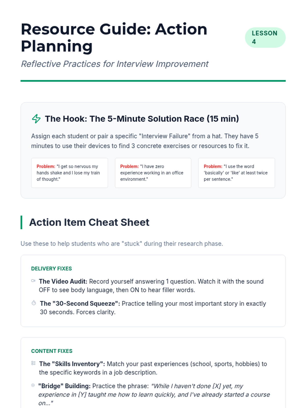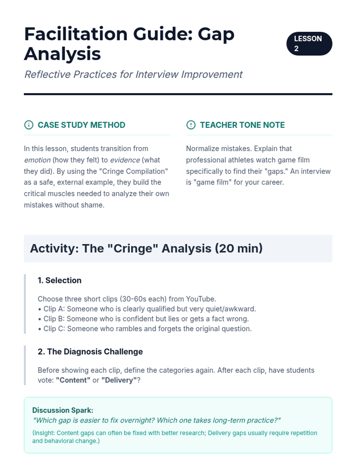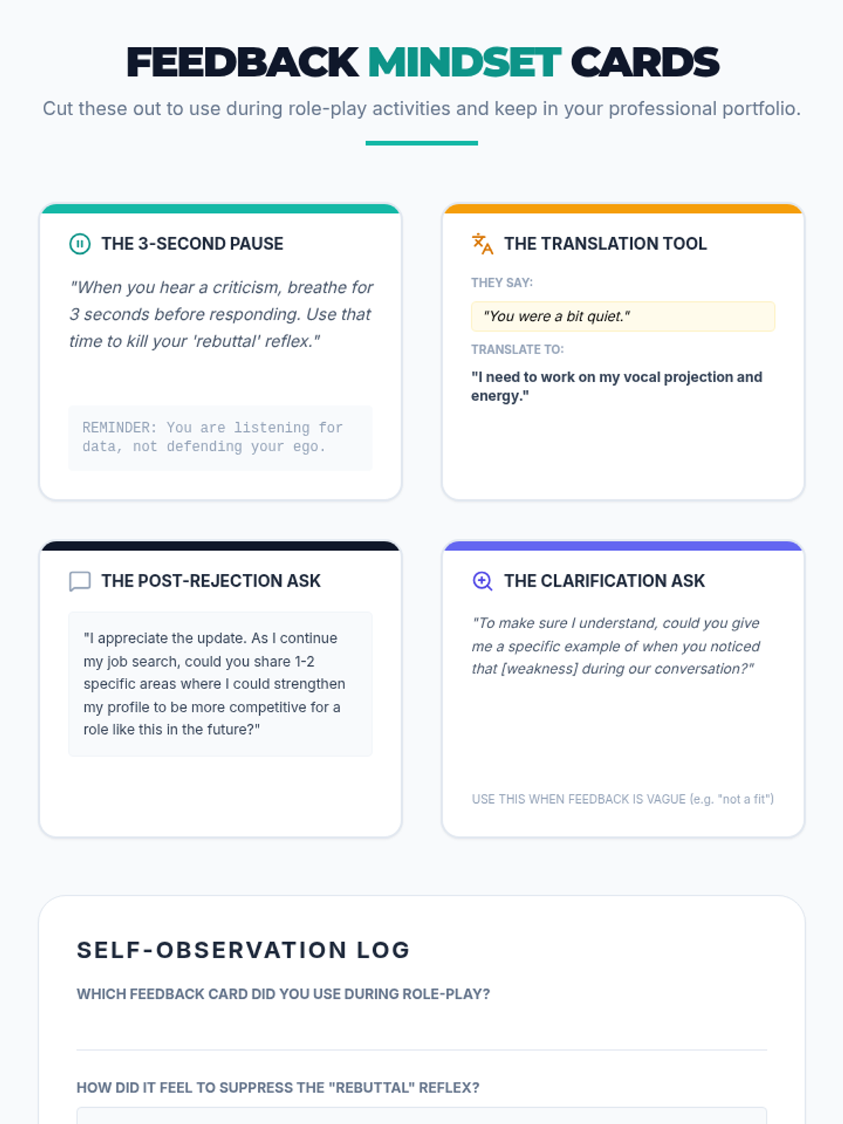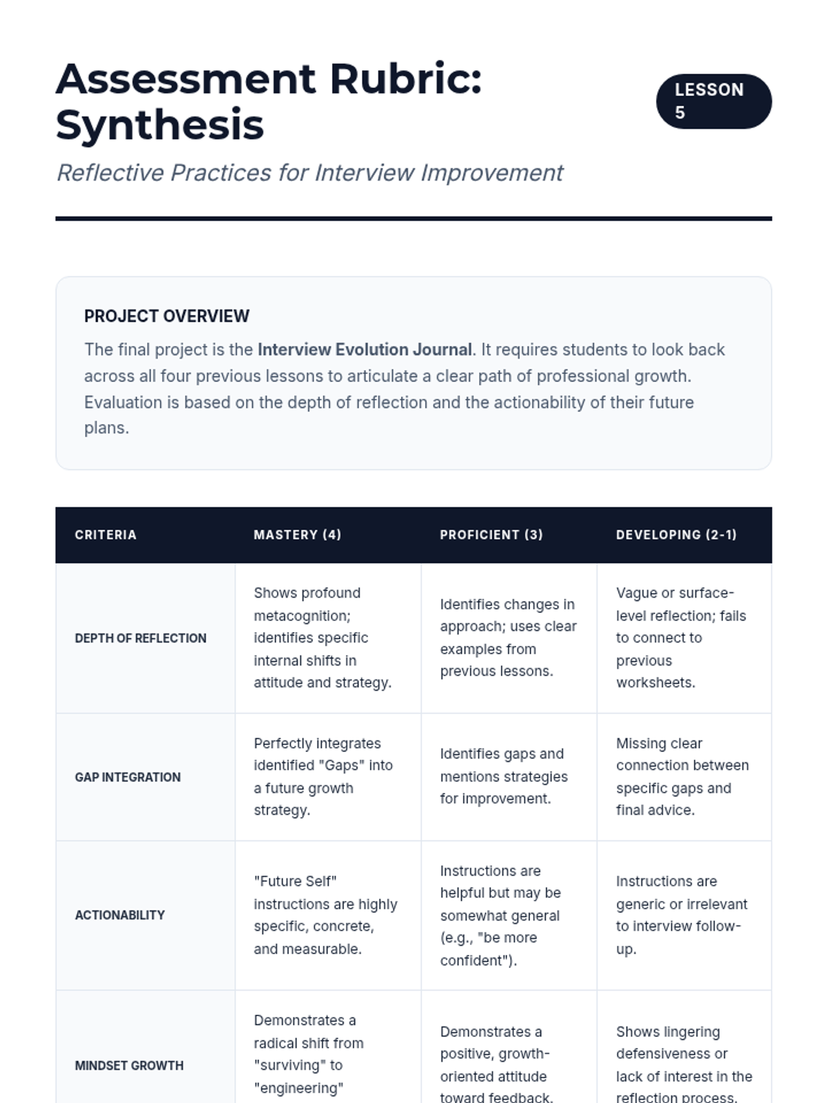 This inquiry-based sequence focuses on self-assessment and continuous improvement in the interview process. Students will develop habits for immediate post-interview reflection, analyze performance gaps, learn to process feedback with a growth mindset, and create actionable plans for professional growth.