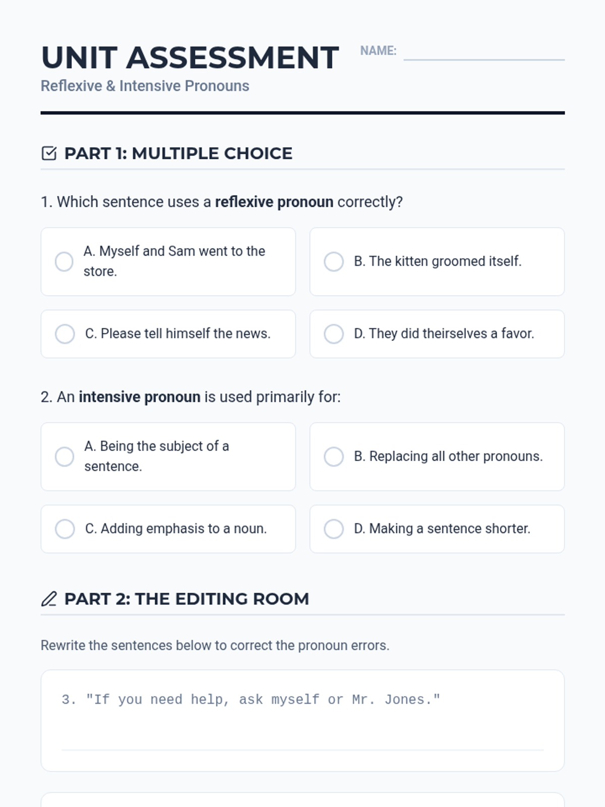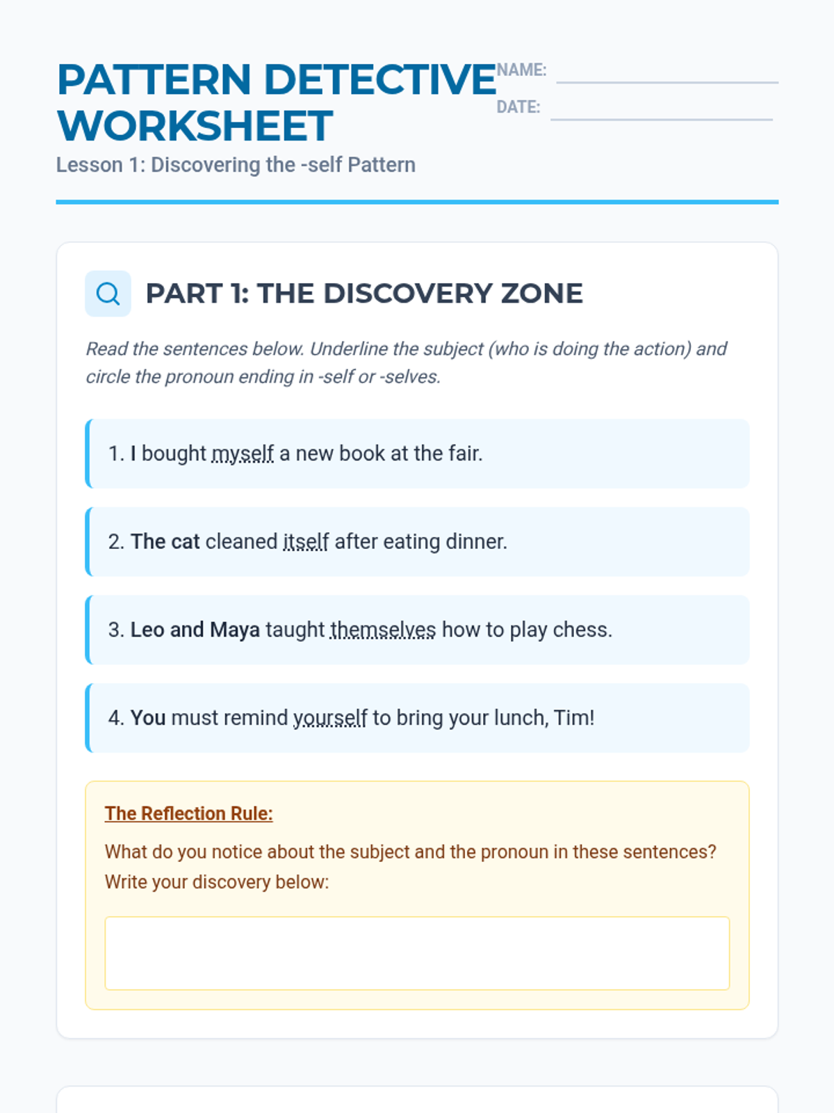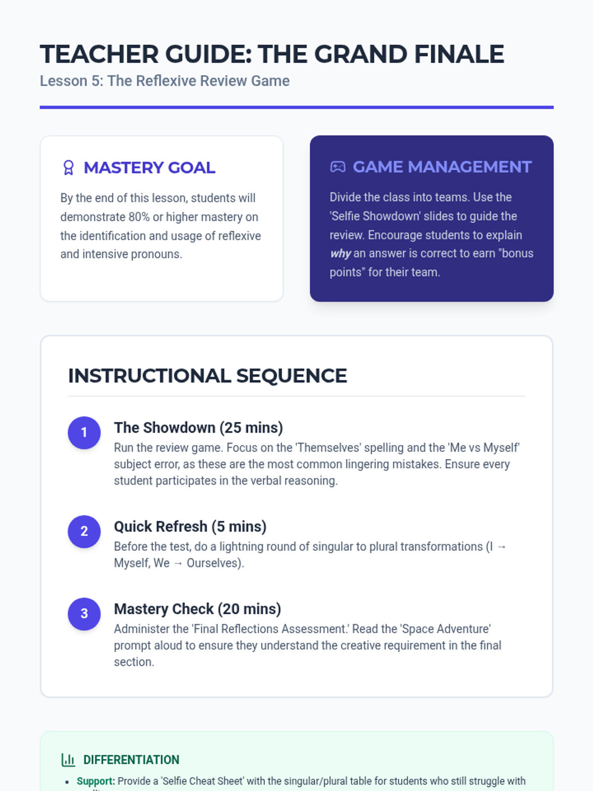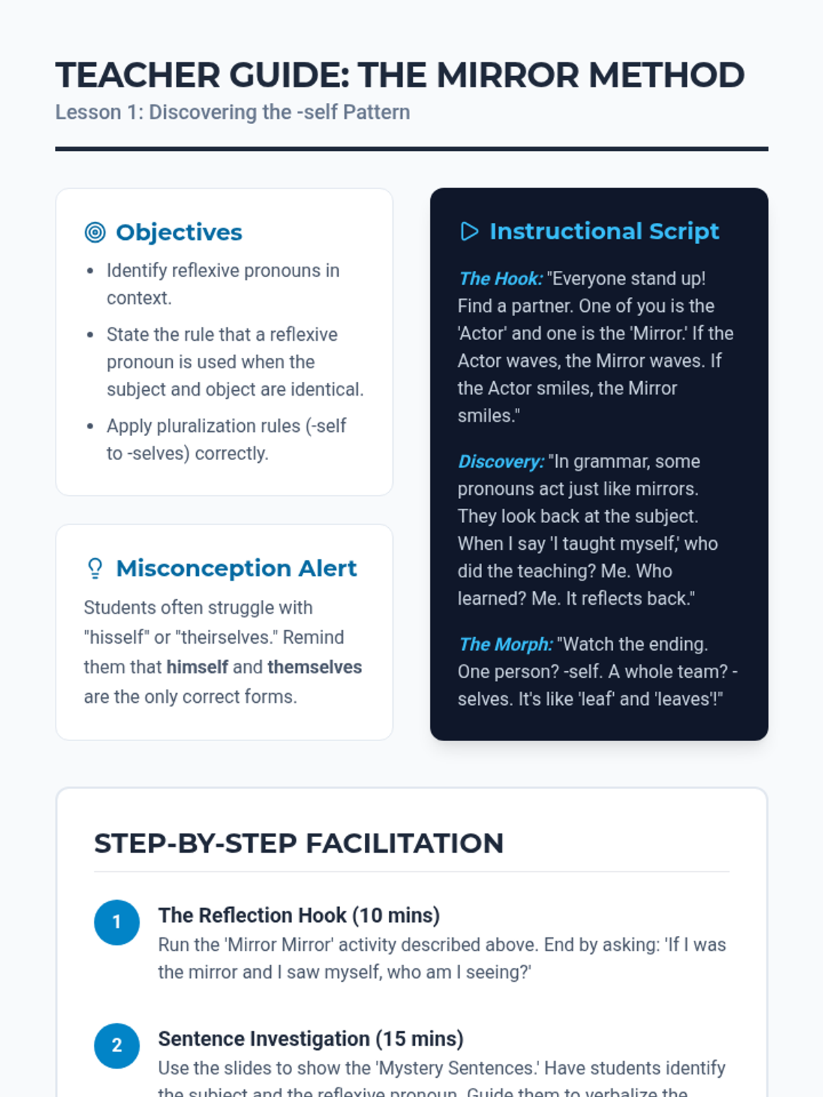 A comprehensive 4th-grade grammar sequence exploring reflexive and intensive pronouns through inquiry, kinetic activities, and game-based learning. Students move from basic pattern recognition to nuanced stylistic usage and error correction.