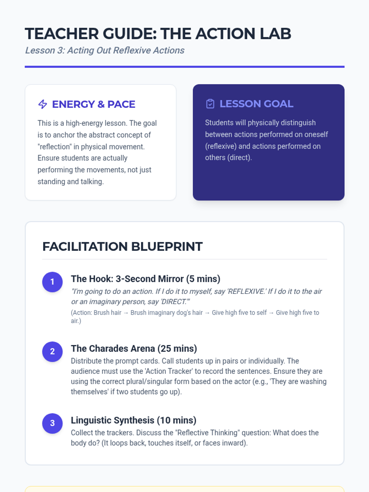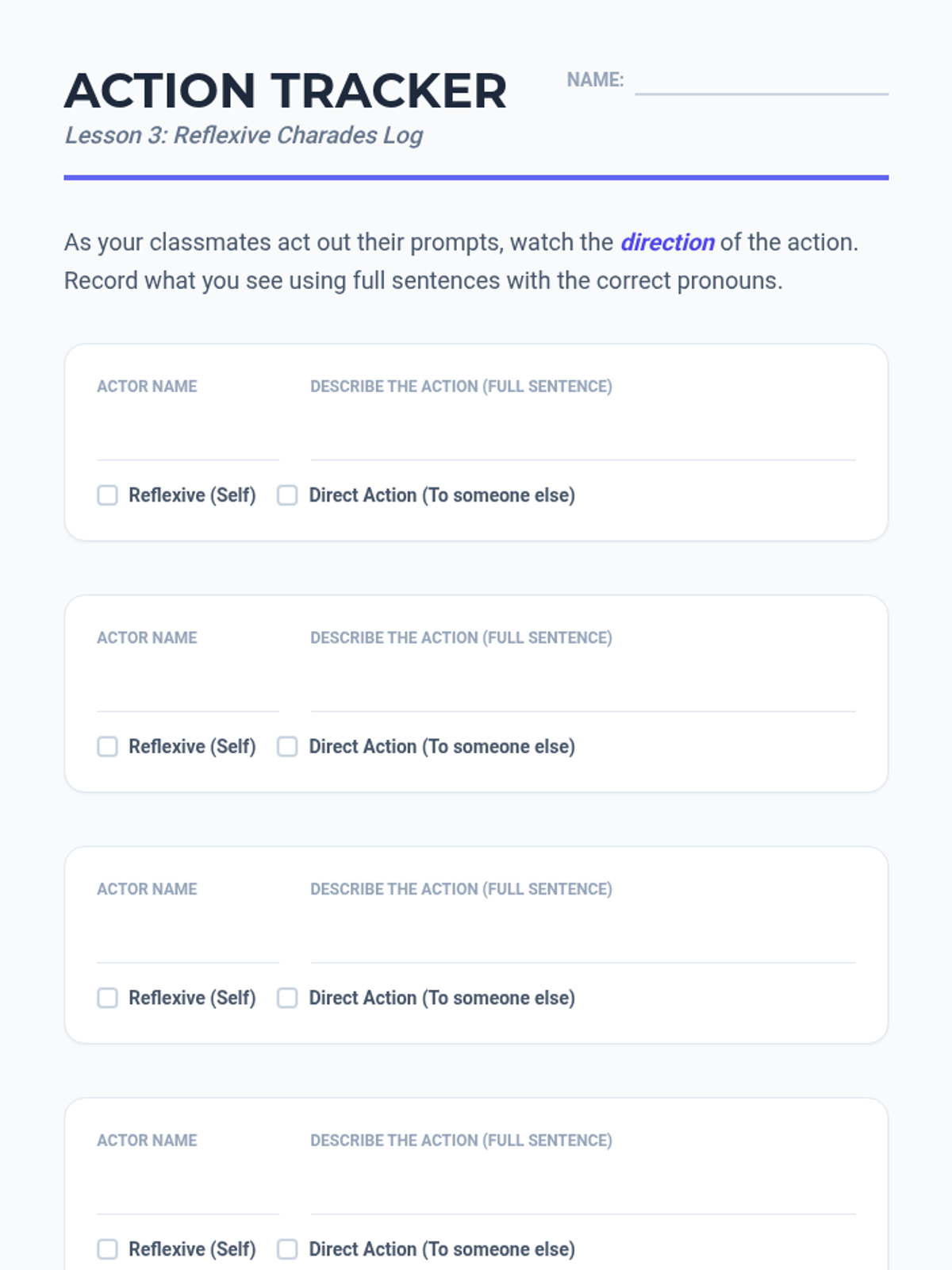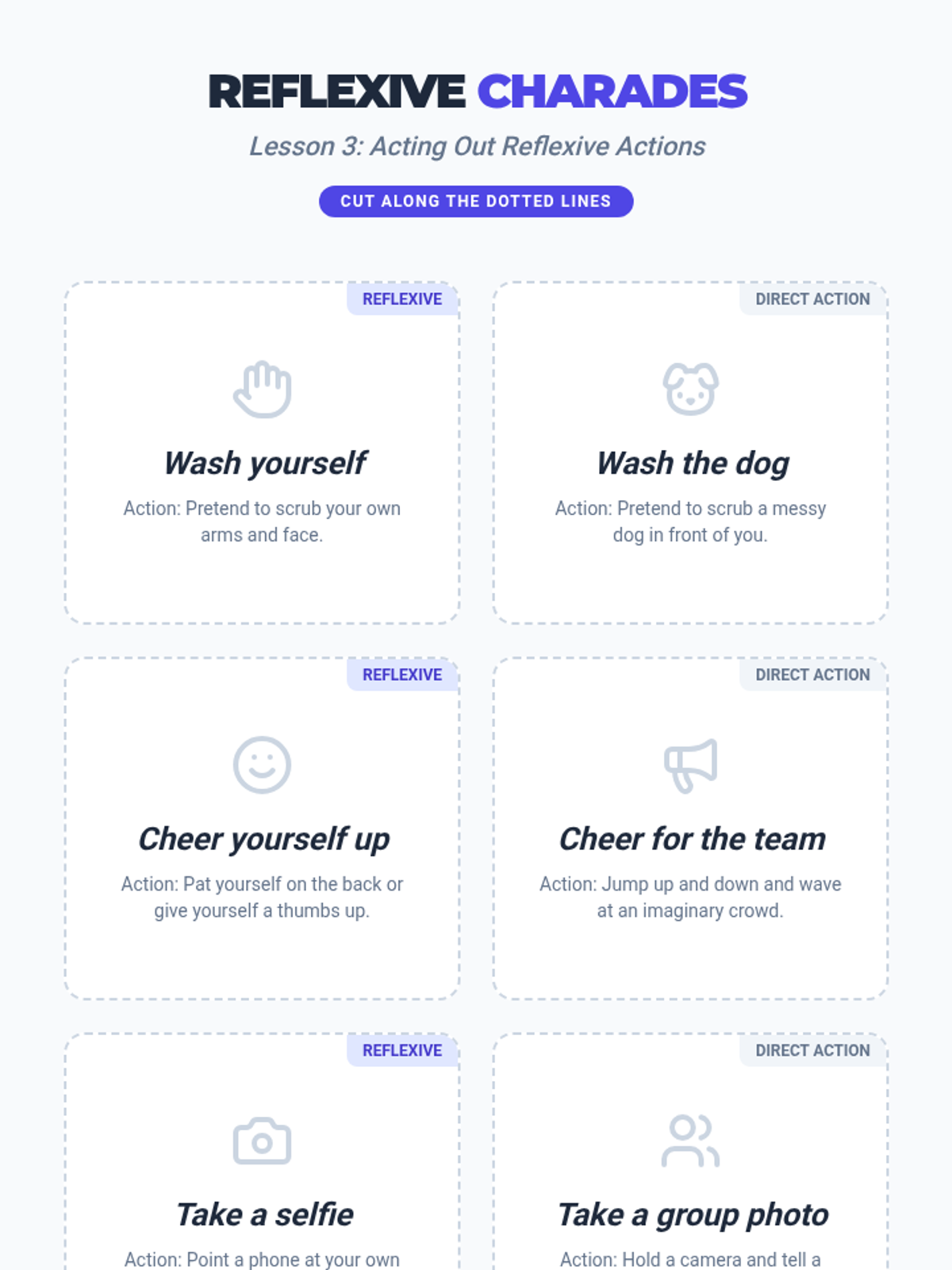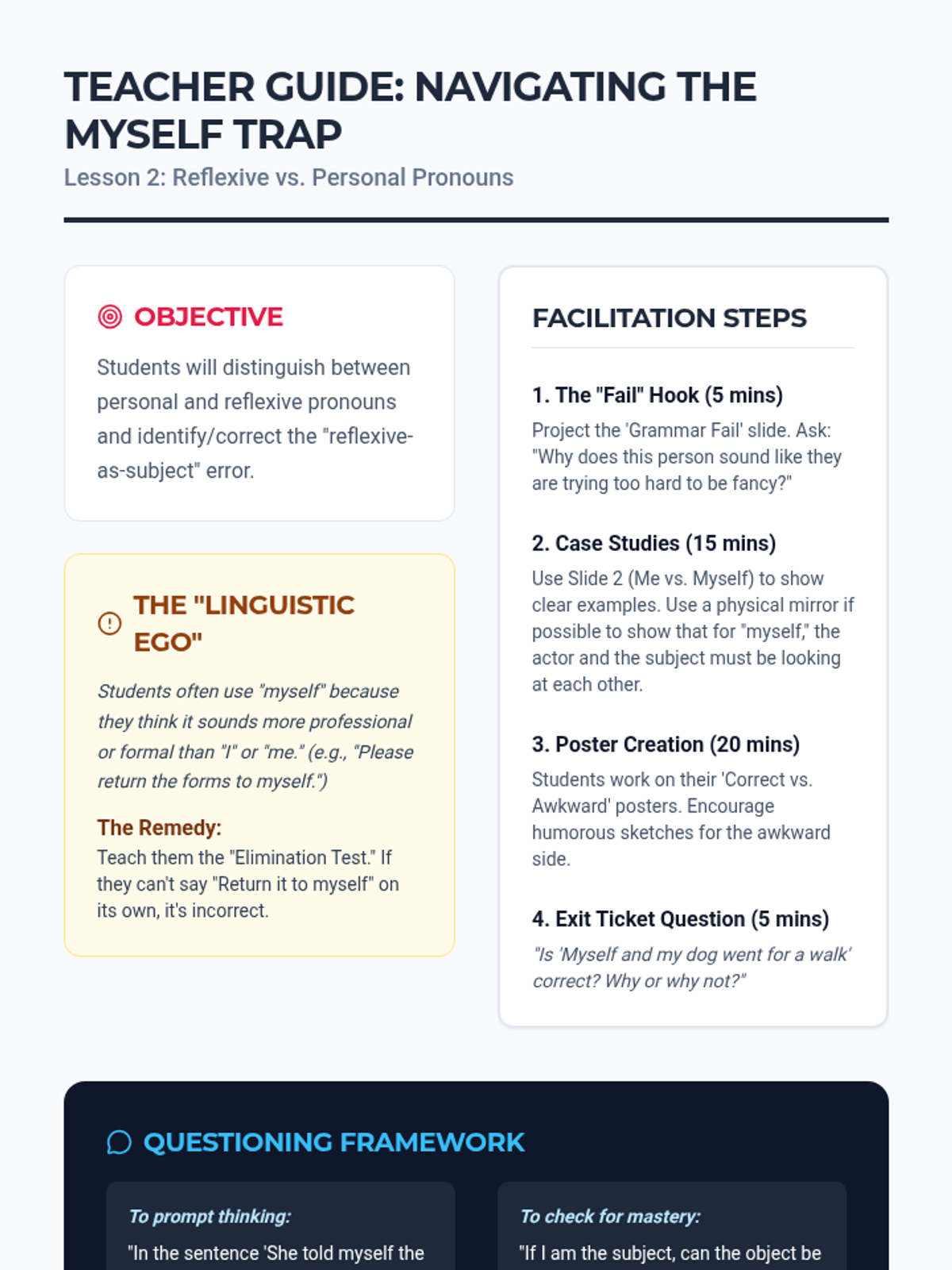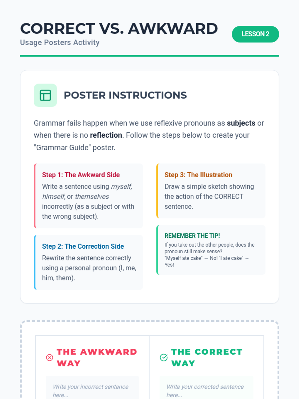 A comprehensive 4th-grade grammar sequence exploring reflexive and intensive pronouns through inquiry, kinetic activities, and game-based learning. Students move from basic pattern recognition to nuanced stylistic usage and error correction.
