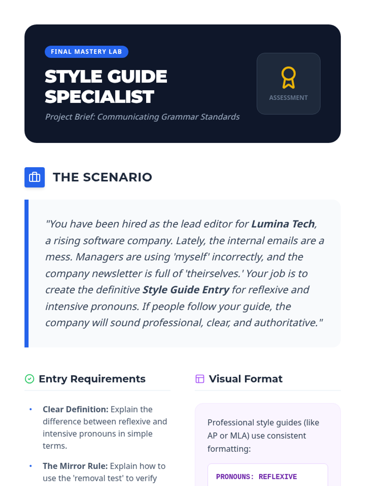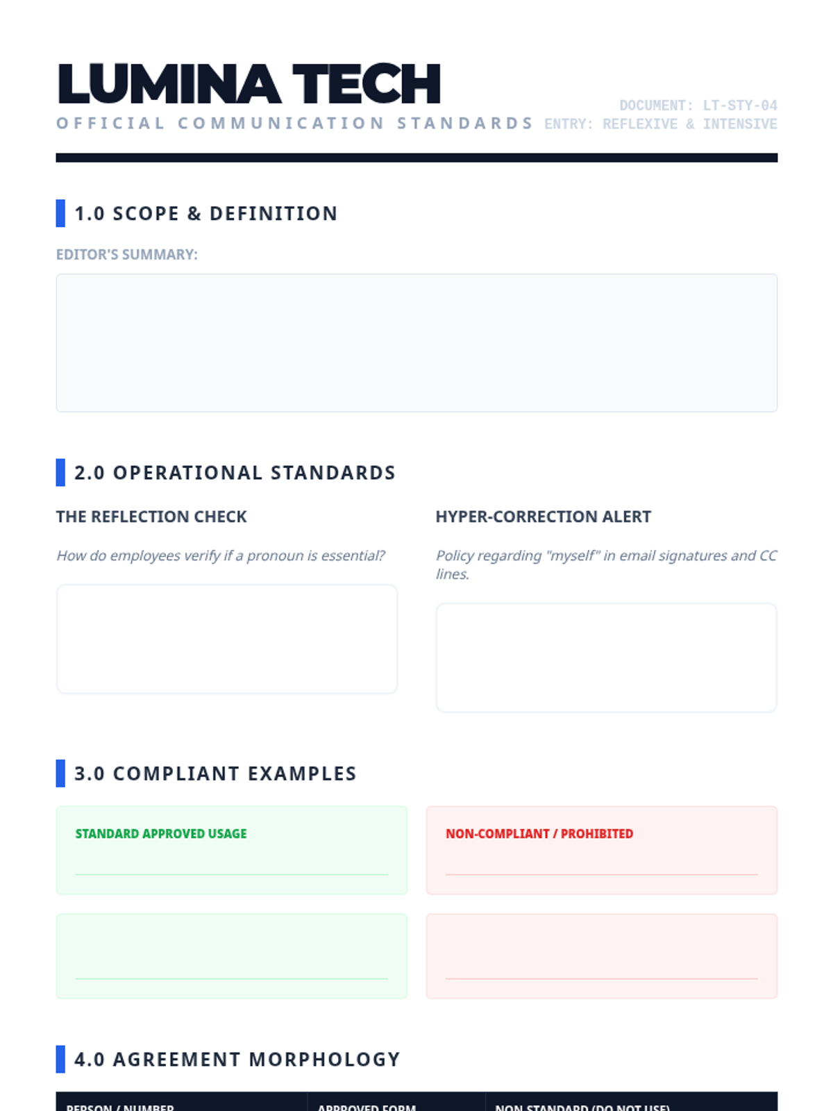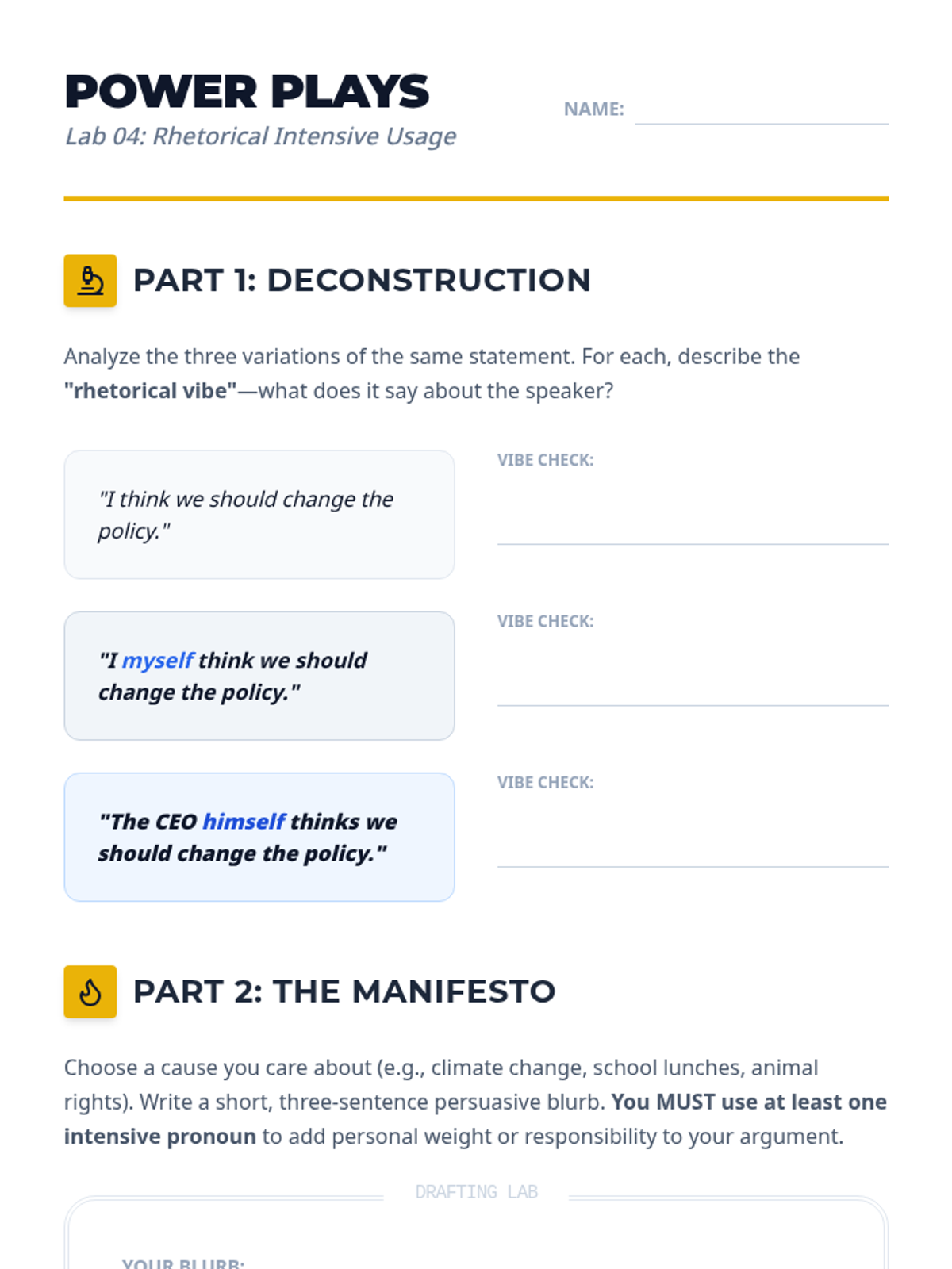 A comprehensive 9th-grade grammar sequence focusing on the proper use of reflexive and intensive pronouns, addressing common hyper-correction errors and rhetorical emphasis.