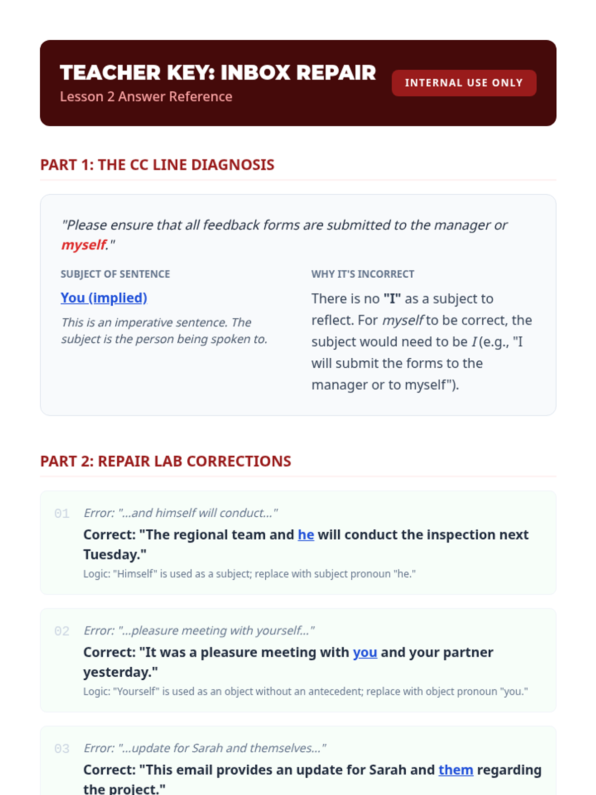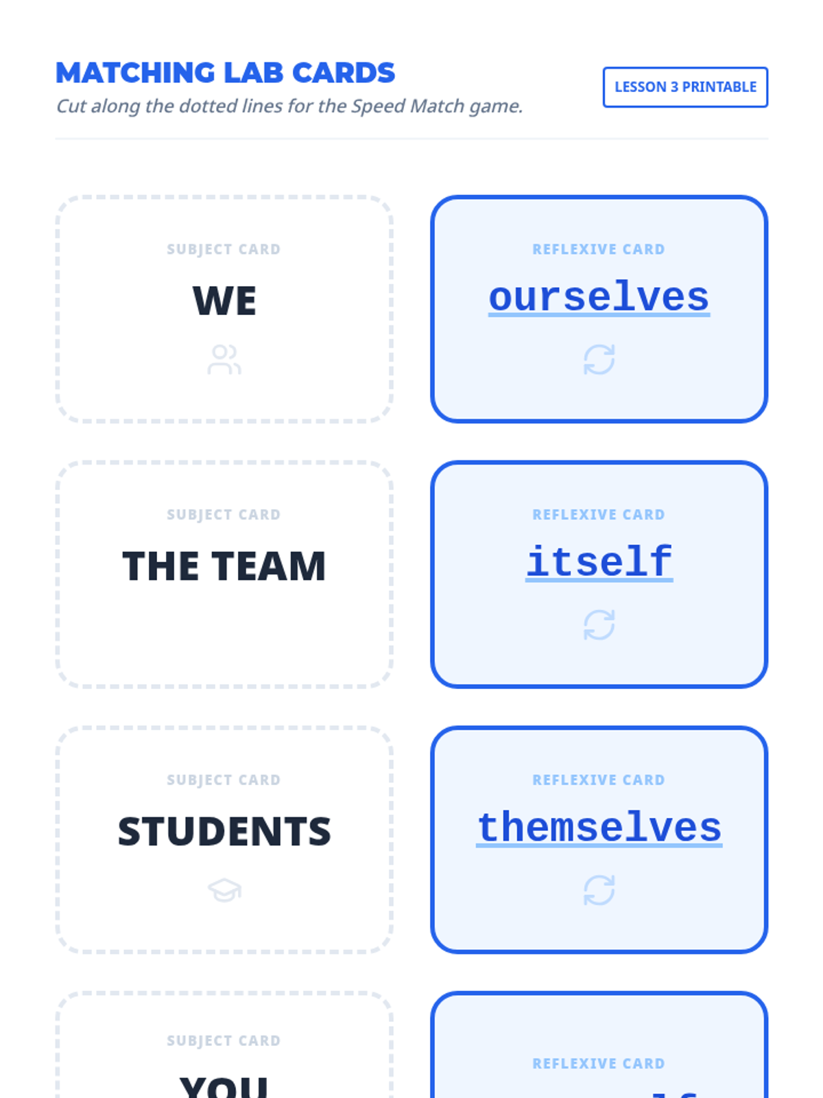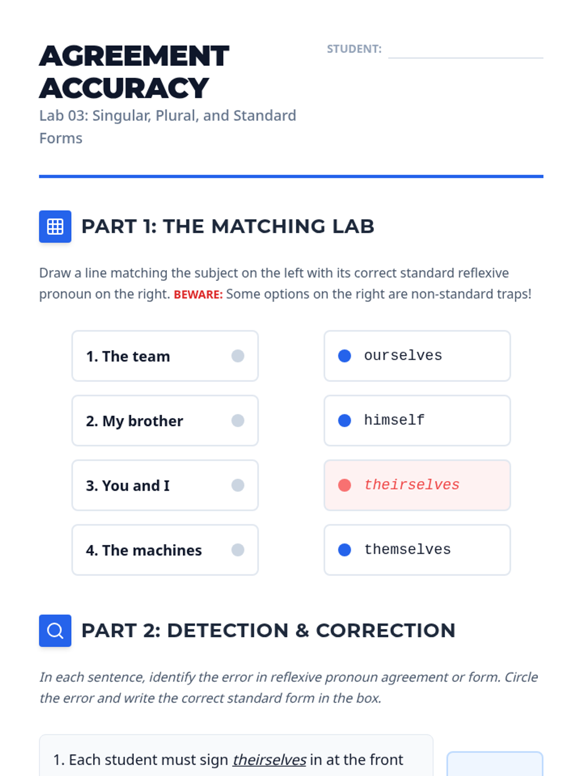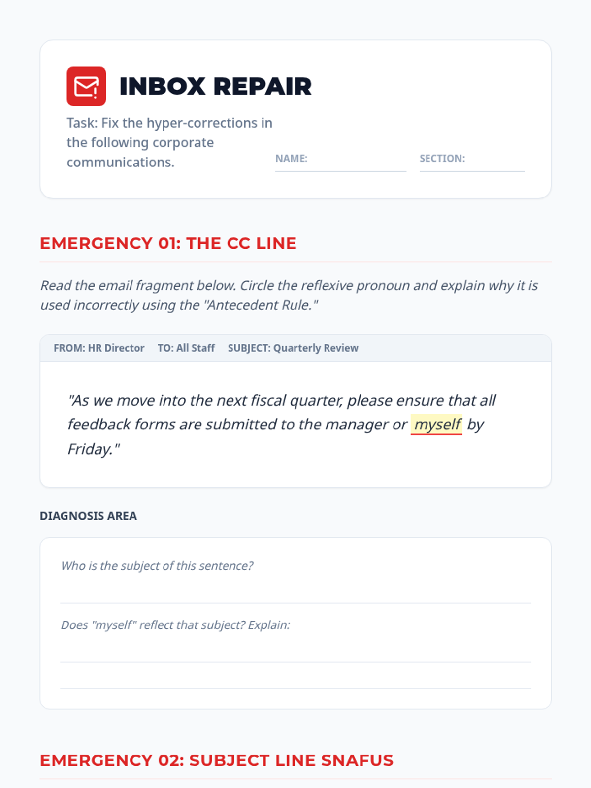 A comprehensive 9th-grade grammar sequence focusing on the proper use of reflexive and intensive pronouns, addressing common hyper-correction errors and rhetorical emphasis.