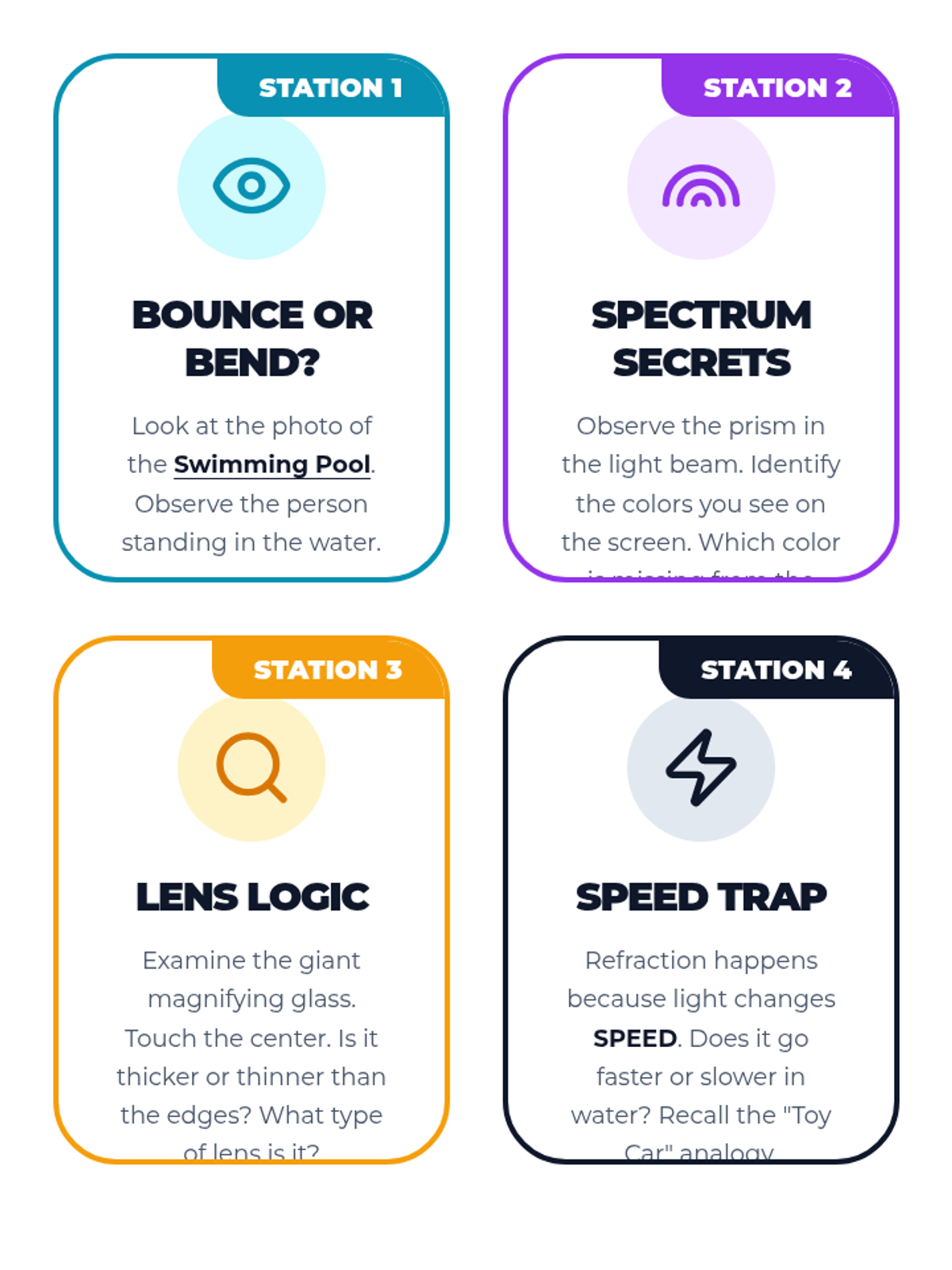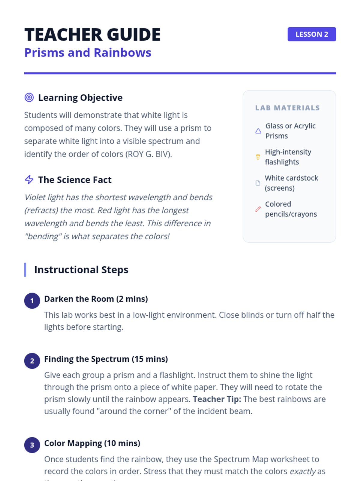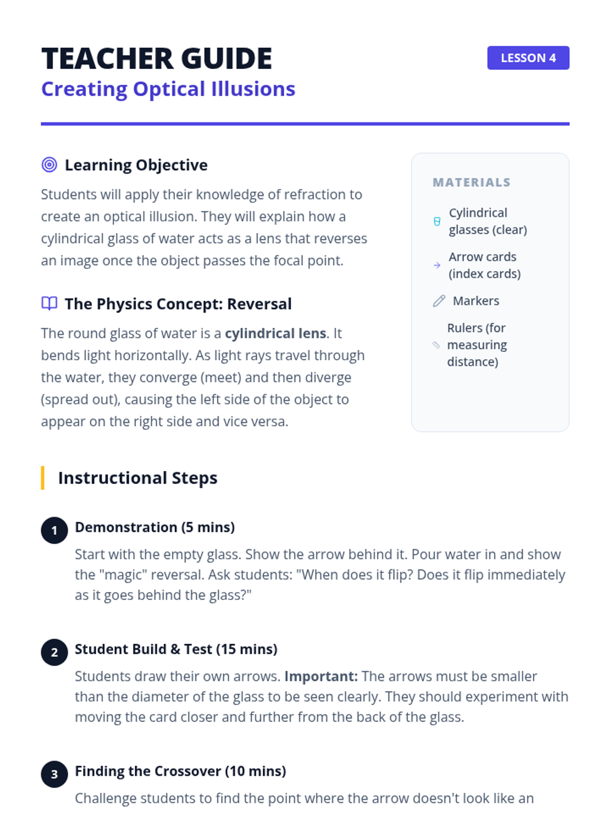 A 5-lesson unit for 4th graders exploring refraction, prisms, and lenses. Students use a hands-on lab approach to investigate how light bends and splits into colors.