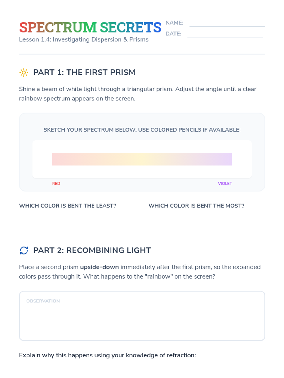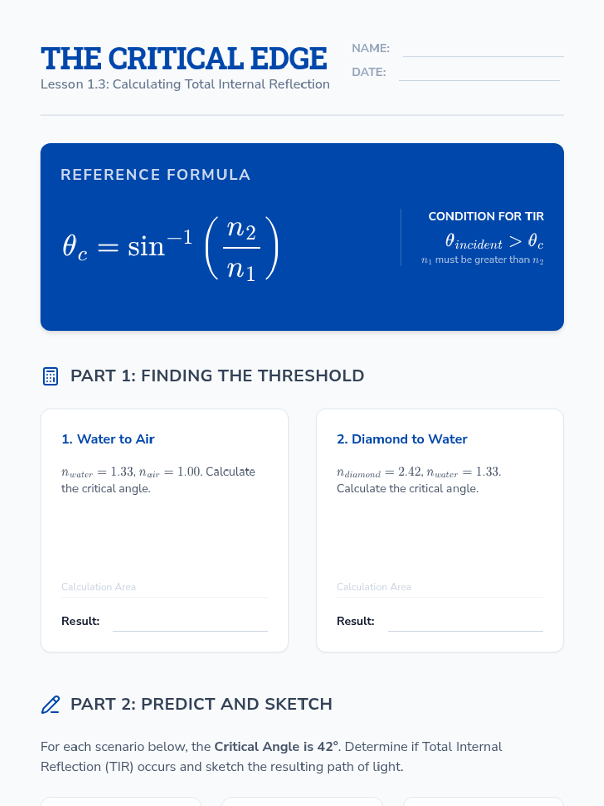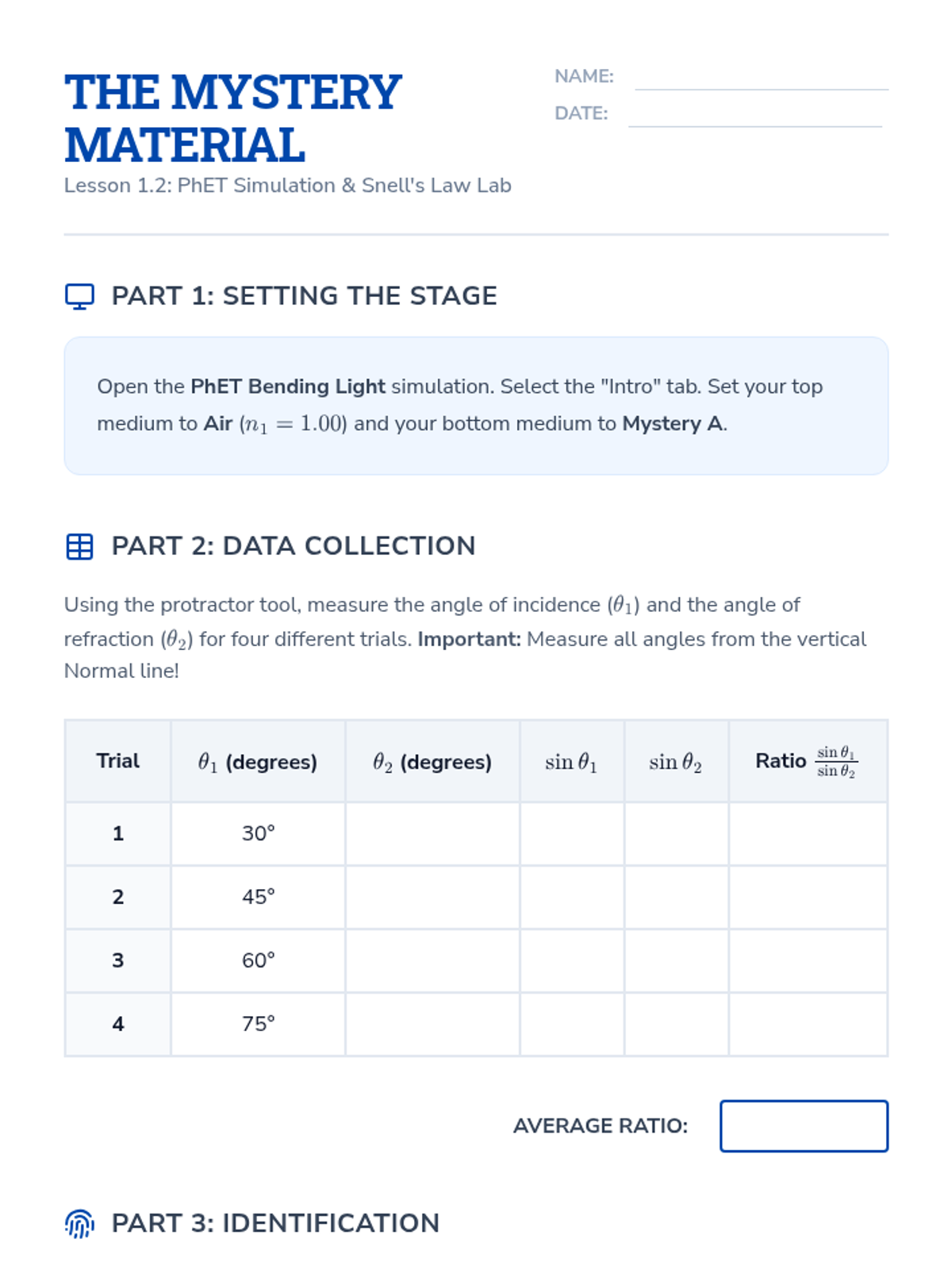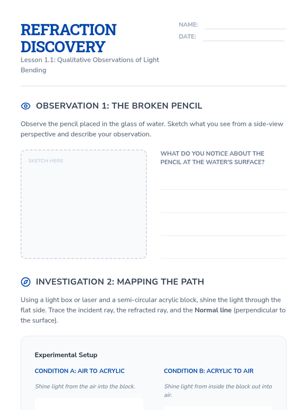 Students investigate the behavior of light as it passes between different media, focusing on refraction, Snell's Law, and total internal reflection. The sequence culminates in a gamified review where students apply their knowledge to solve complex optical puzzles.