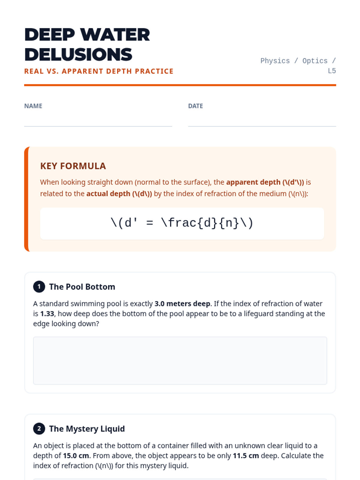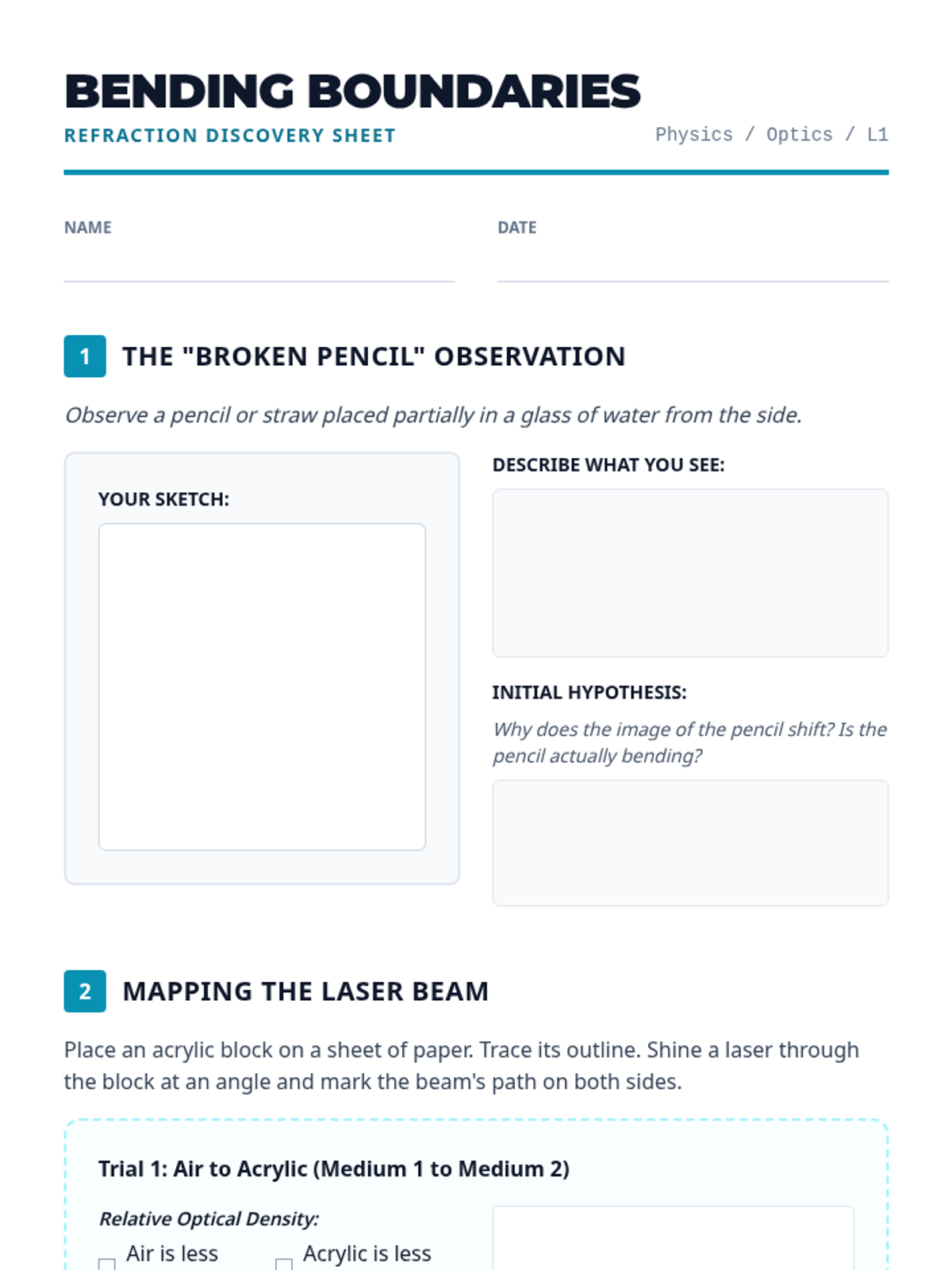 A comprehensive 11th-grade physics sequence exploring the principles of refraction, Snell's Law, total internal reflection, and dispersion through inquiry-based labs and real-world applications.