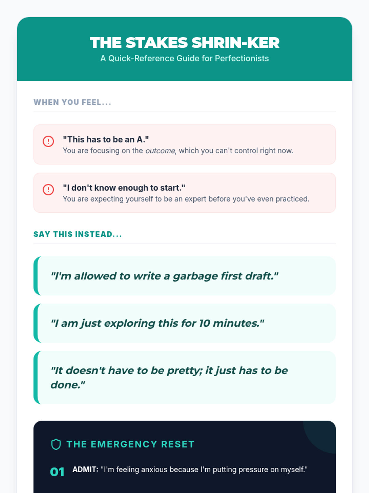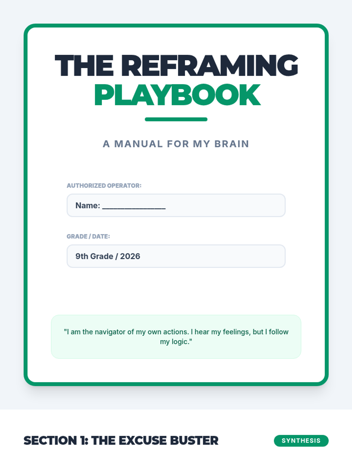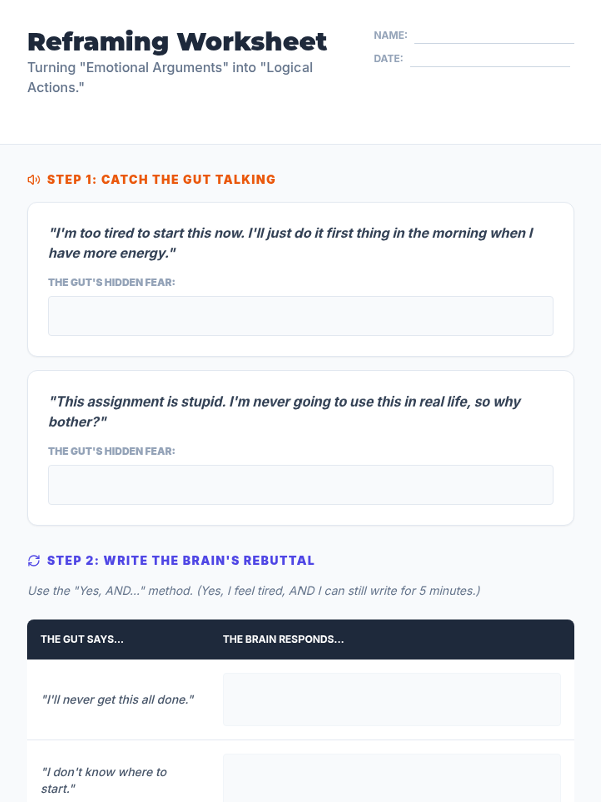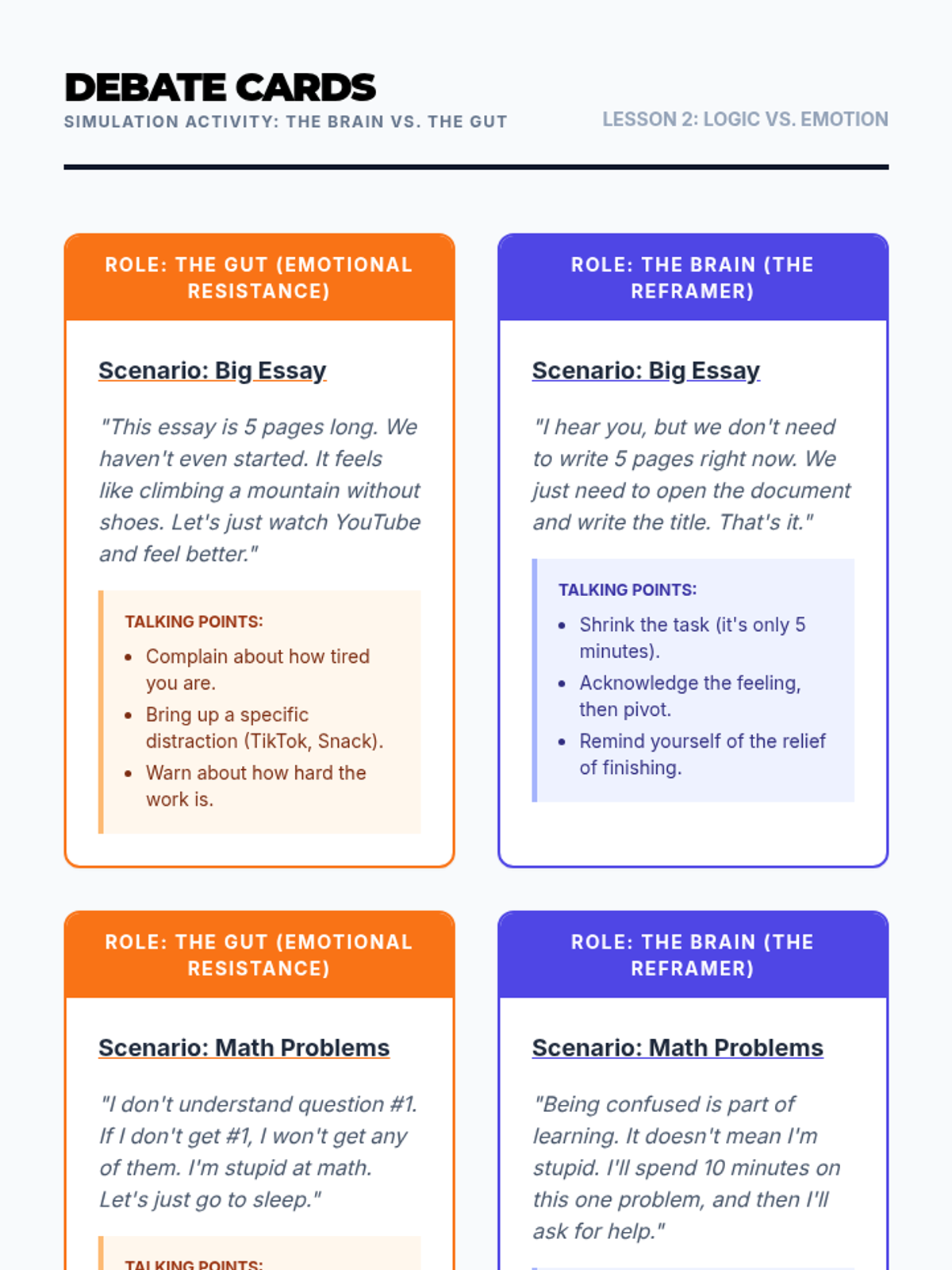 A 5-lesson sequence for 9th-grade students focusing on identifying the emotional roots of procrastination and using self-talk to reframe barriers into manageable actions. Students move from analyzing case studies to creating their own personalized reframing guide.
