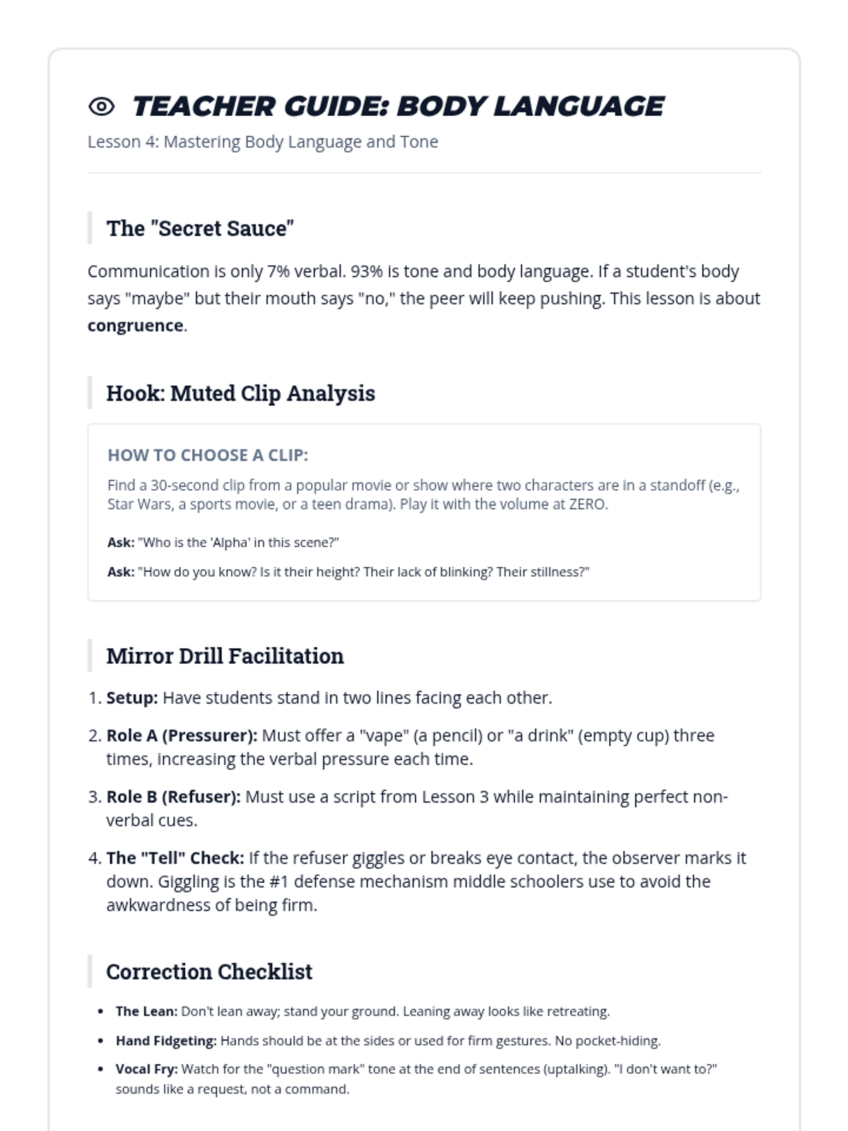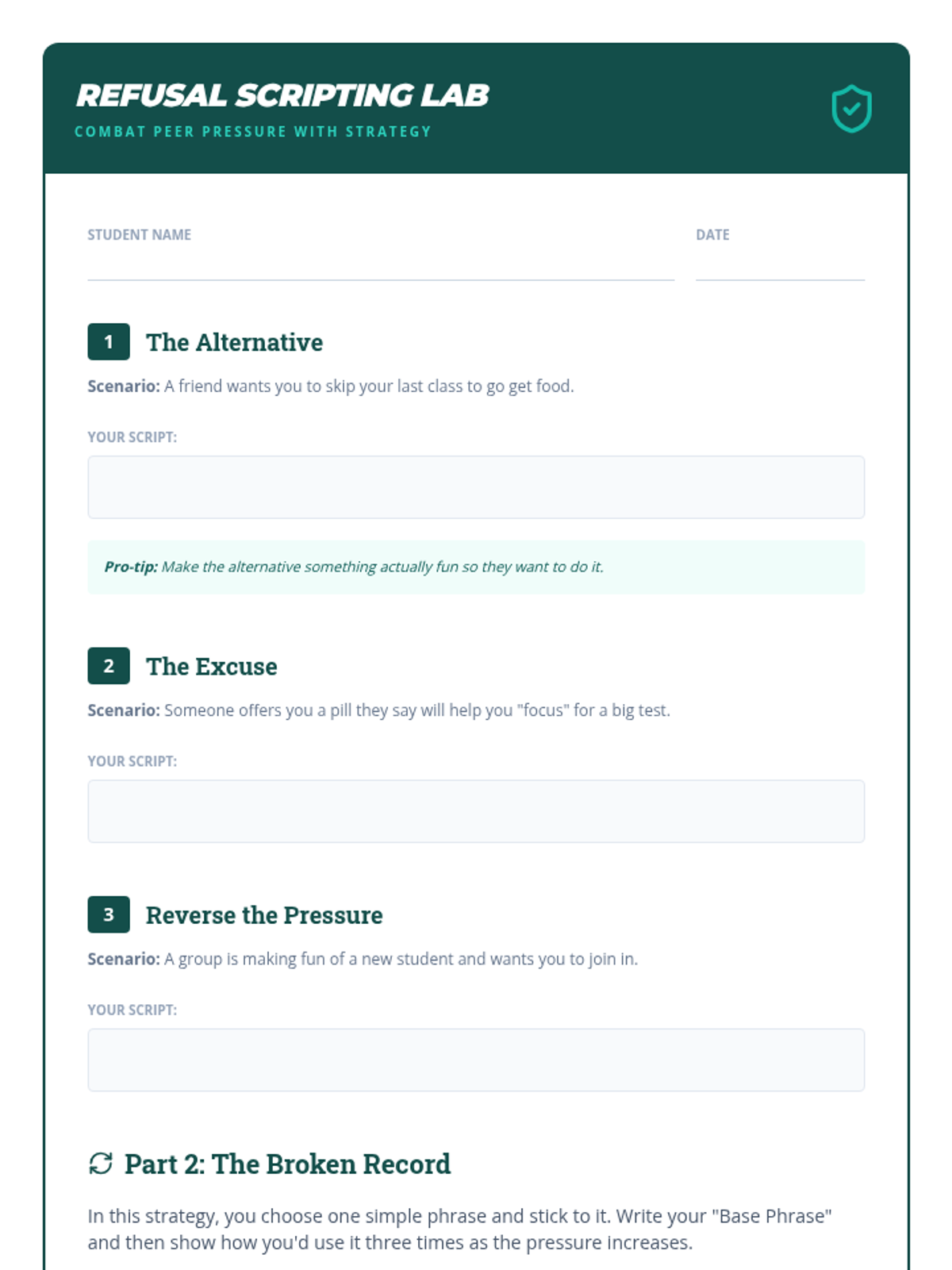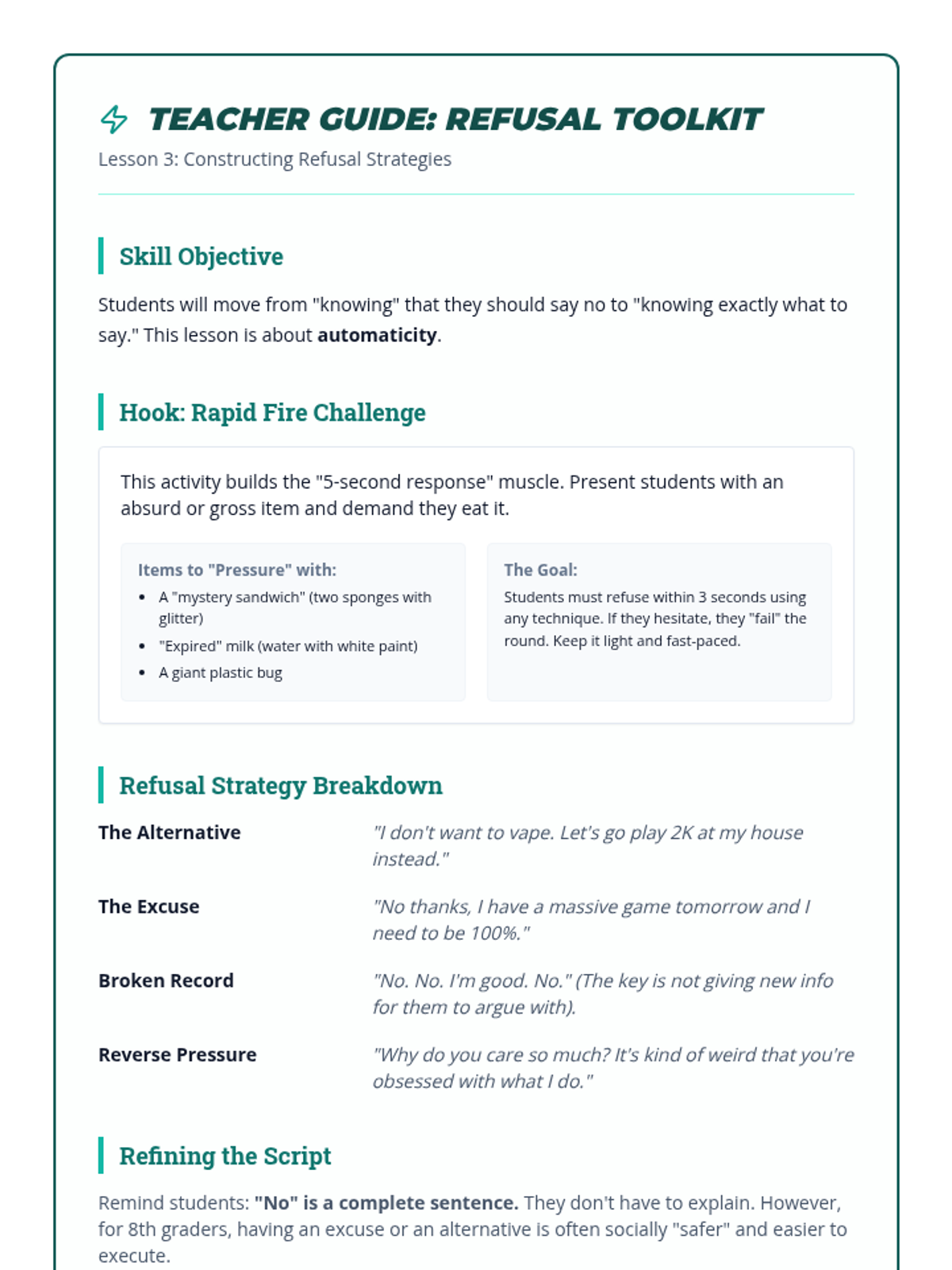 This sequence equips 8th-grade students with the communication tools and psychological awareness needed to navigate peer pressure. Students move from identifying communication styles to mastering specific refusal techniques and creating actionable safety plans, focusing on the power of assertive behavior.