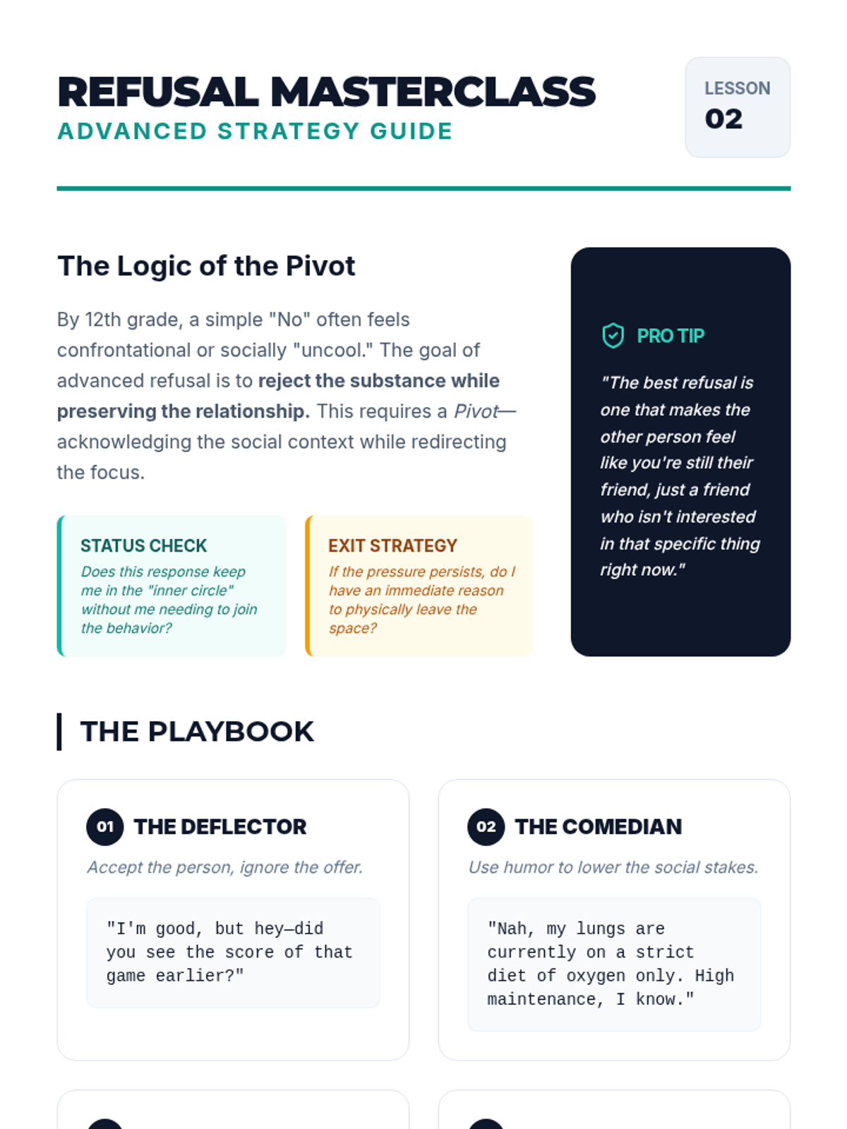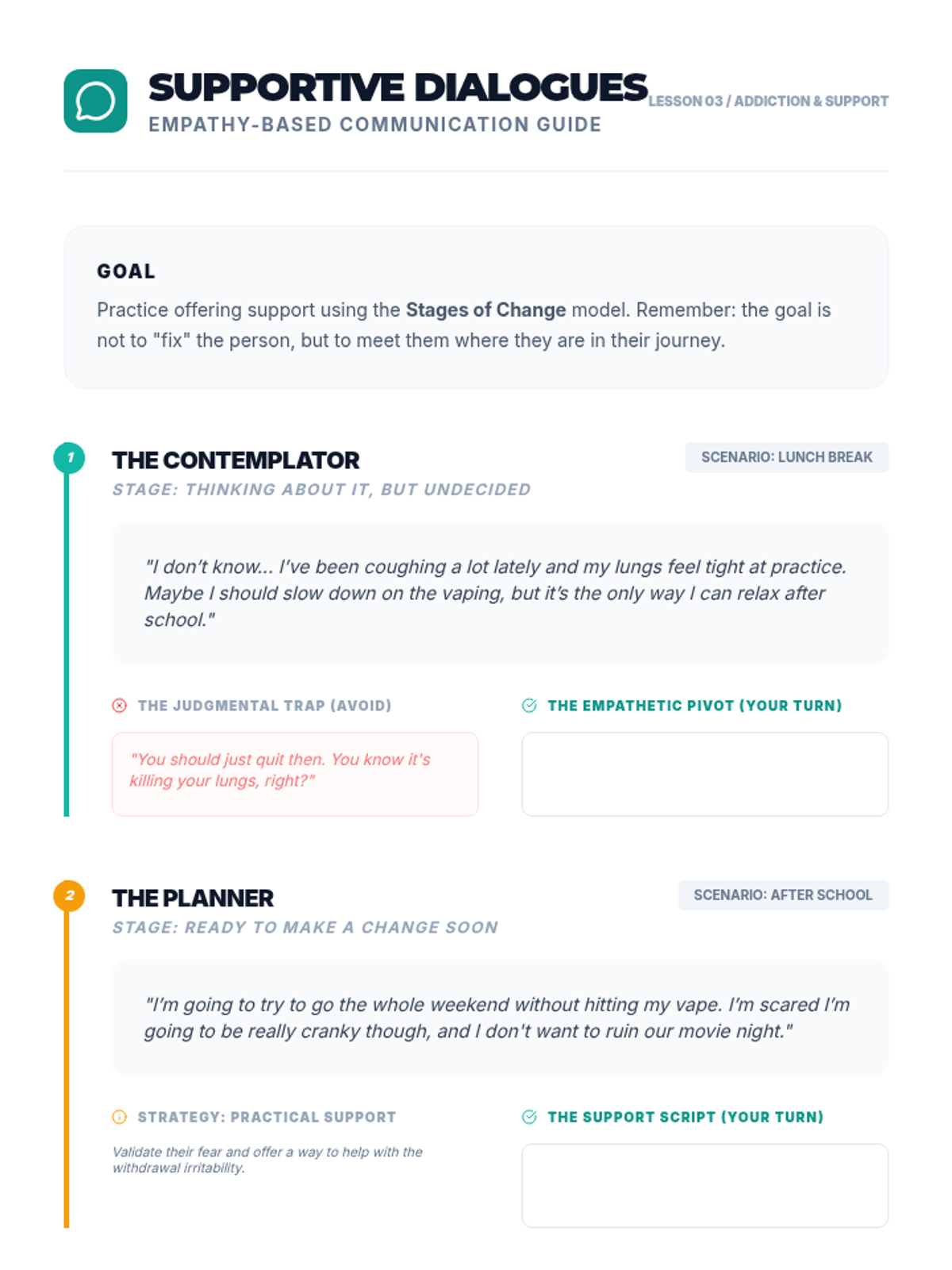 This 12th-grade sequence empowers students with advanced interpersonal skills to navigate social pressure and support tobacco/vape cessation. Students analyze the psychology of conformity, practice nuanced refusal strategies, understand the 'Stages of Change' model for addiction, and develop an advocacy campaign to support their peers.