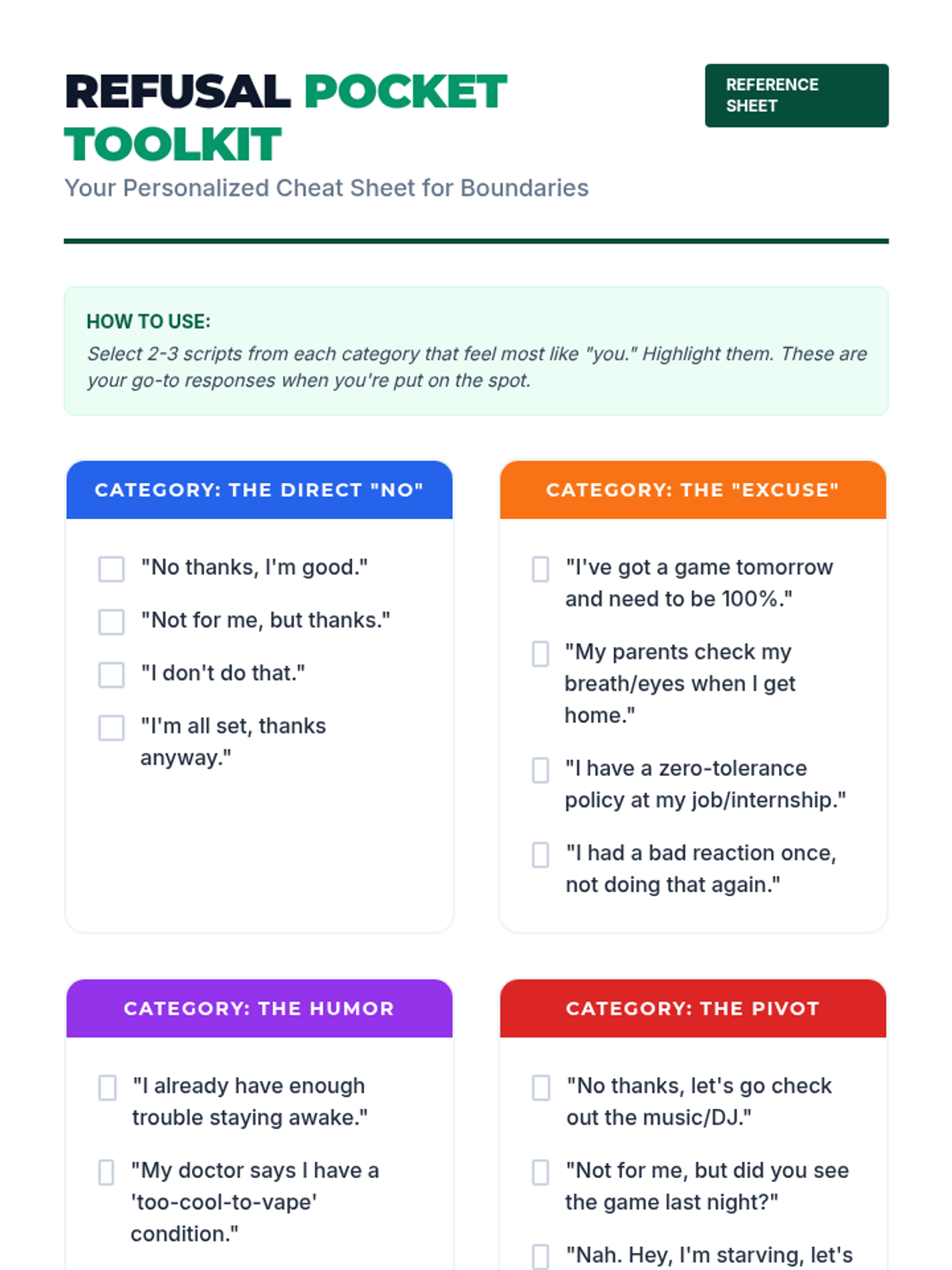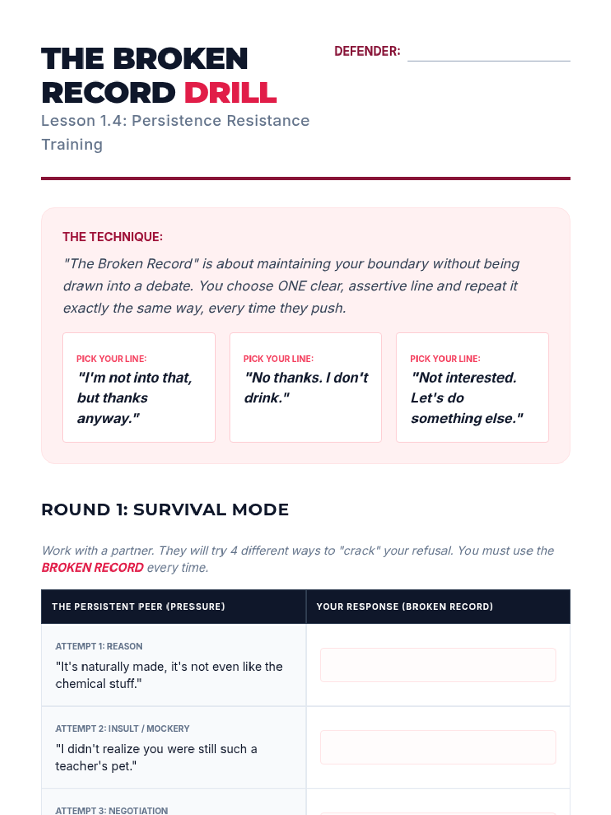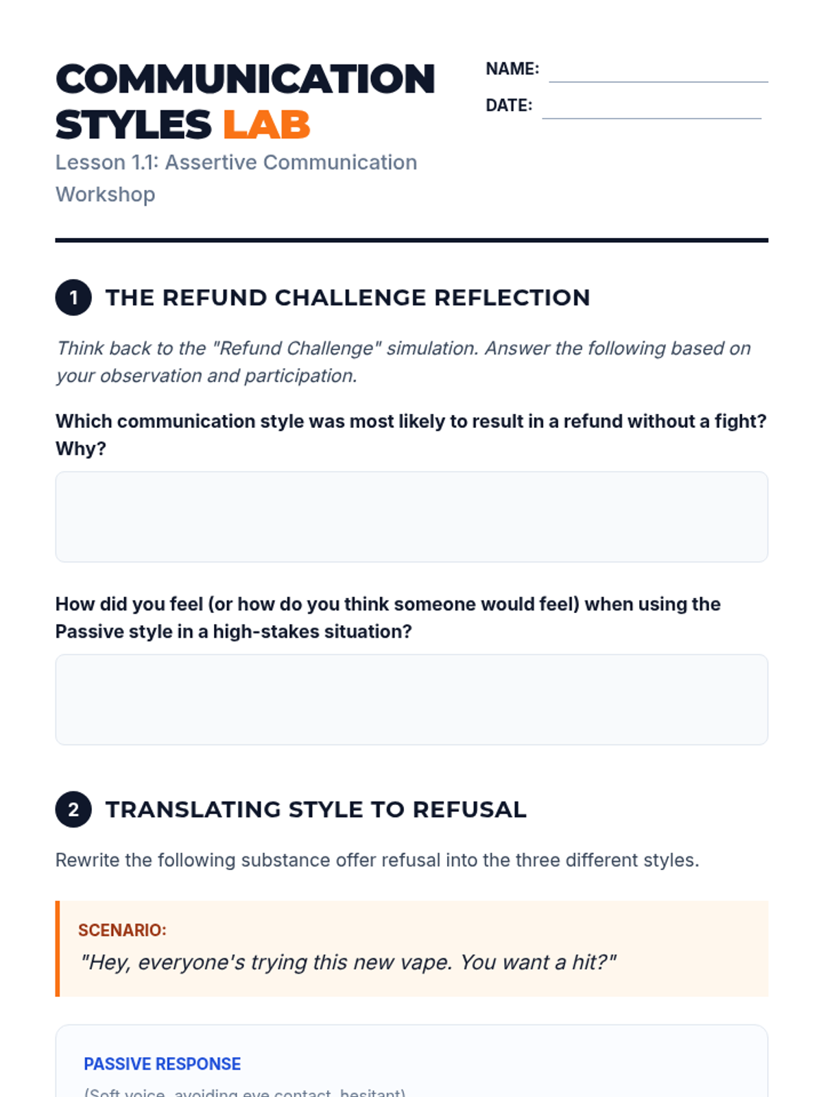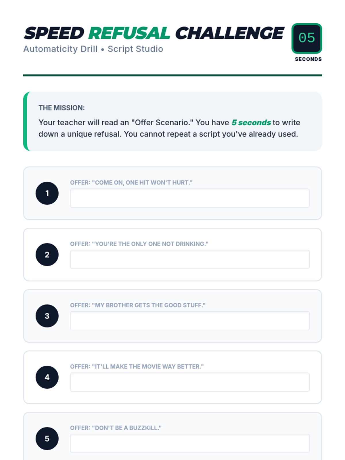 A workshop-style series for 11th graders focusing on the mechanics of communication to refuse substance offers effectively. Students progress from body language and vocal tone to specific scripts and logistical exit strategies, building a personalized toolkit for high-pressure situations.