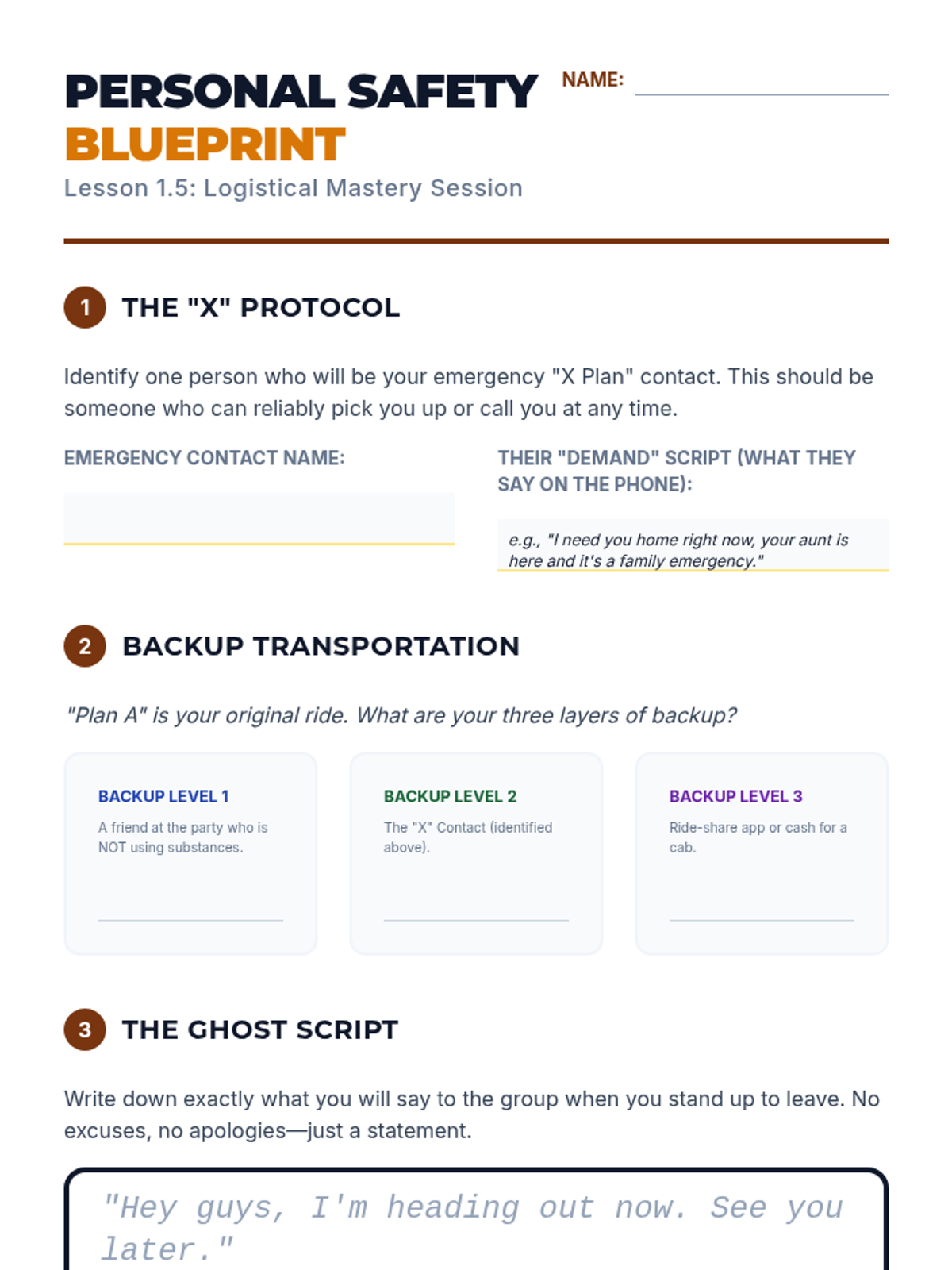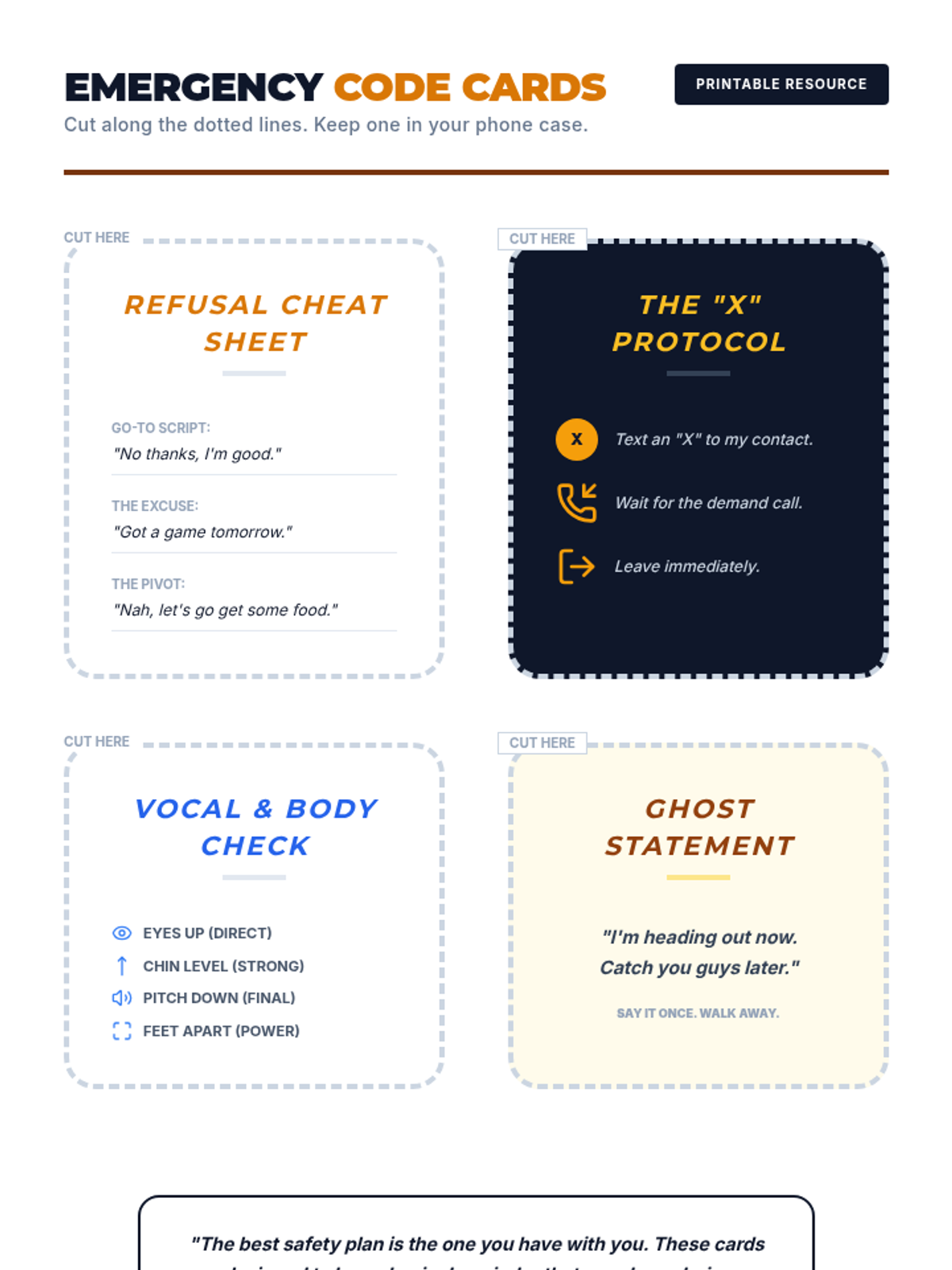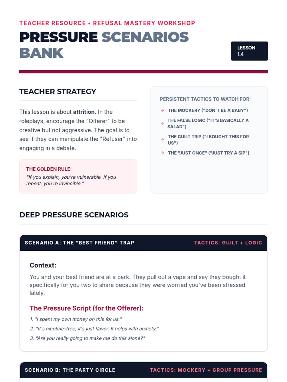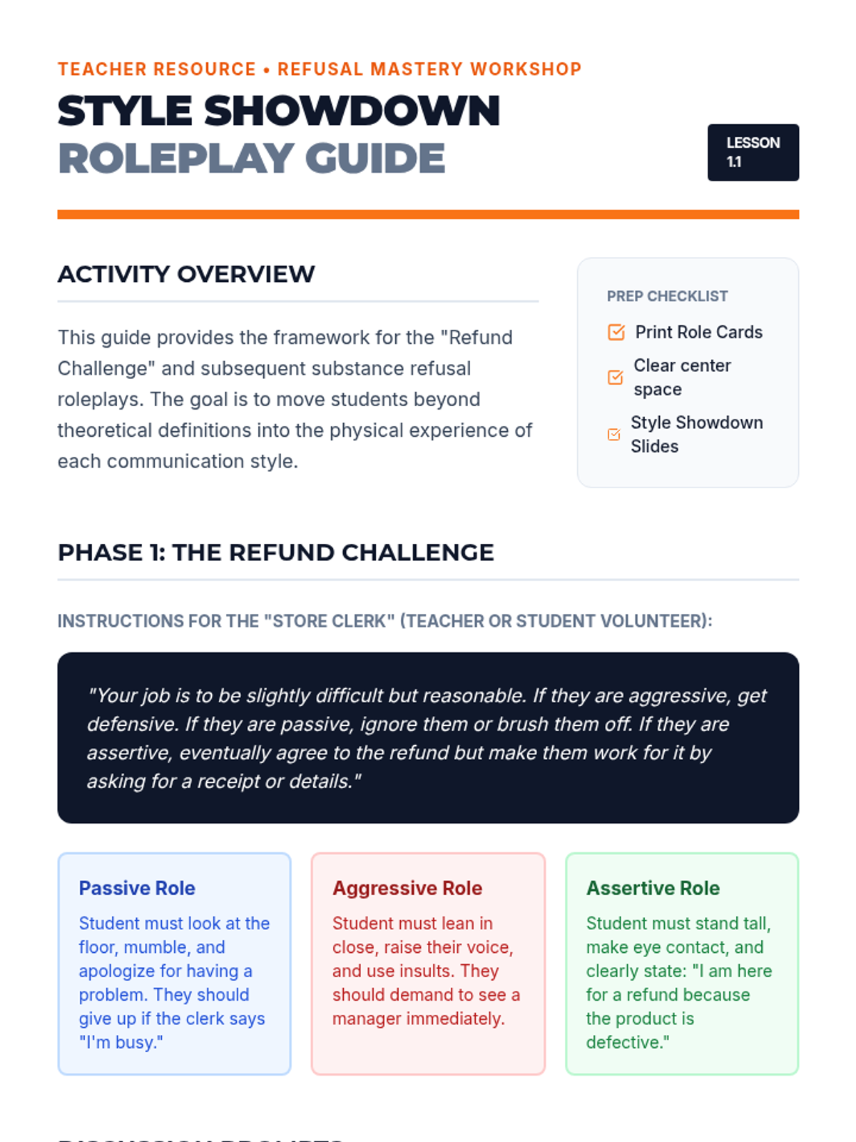 A workshop-style series for 11th graders focusing on the mechanics of communication to refuse substance offers effectively. Students progress from body language and vocal tone to specific scripts and logistical exit strategies, building a personalized toolkit for high-pressure situations.