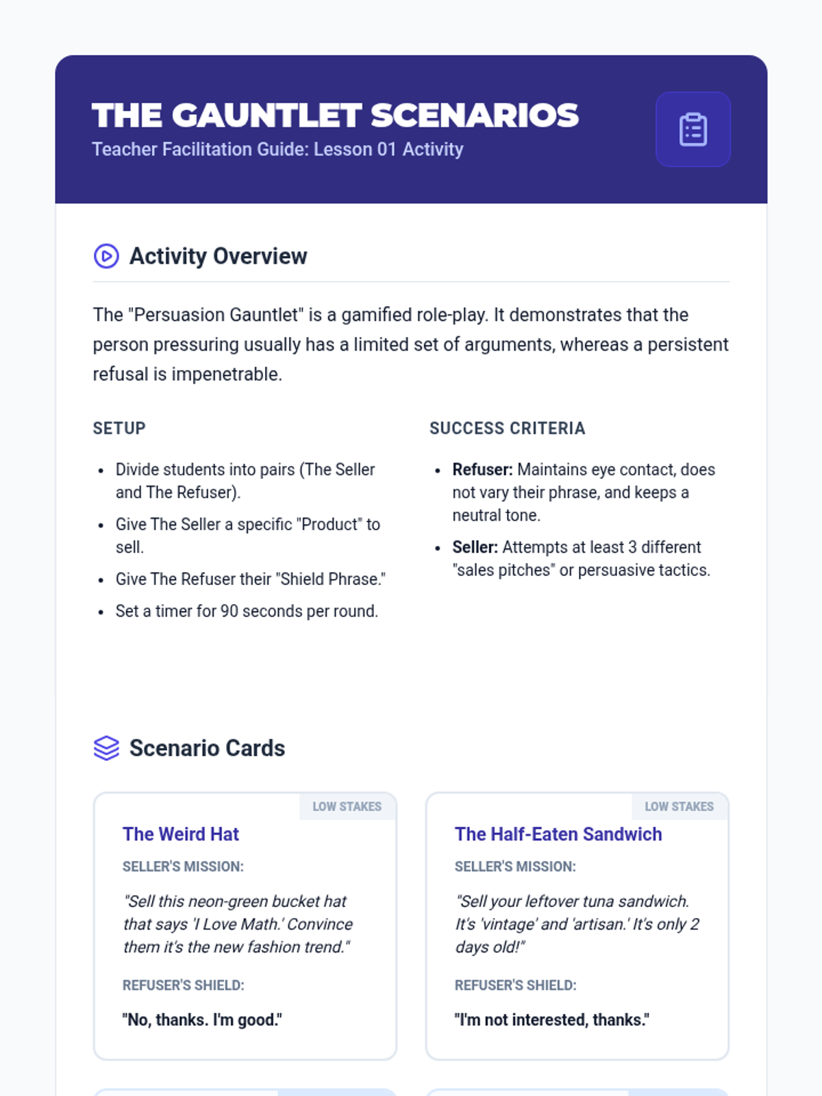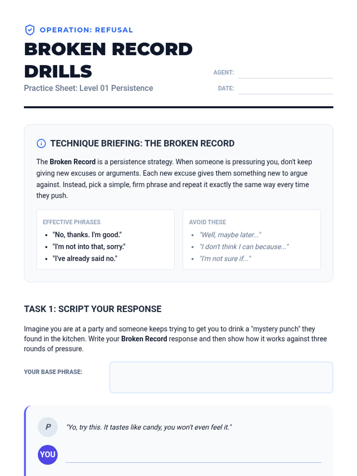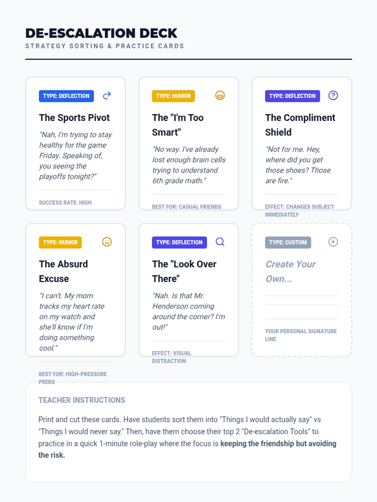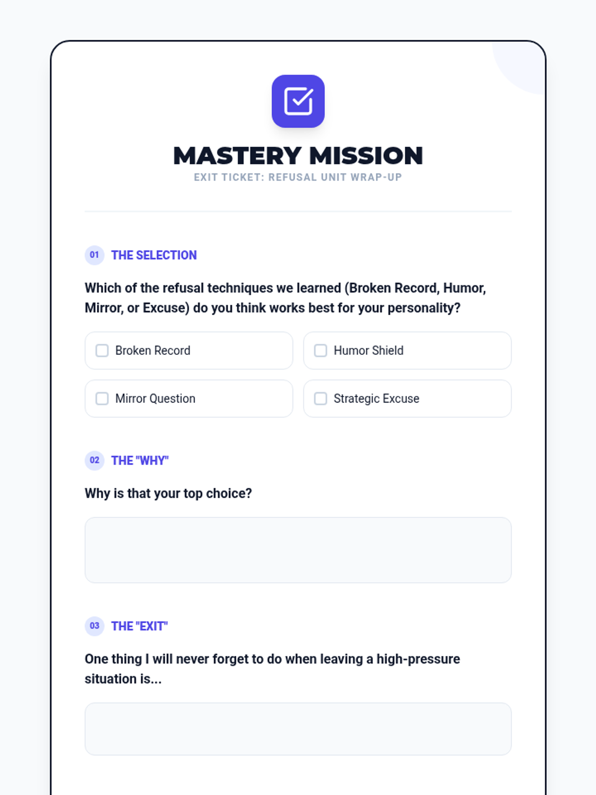 A comprehensive 5-lesson unit for 6th graders to develop and practice concrete refusal skills for substance use and high-pressure social situations. Students transition from simple direct refusals to advanced techniques like 'Reverse the Pressure' and 'Safety Codes.'