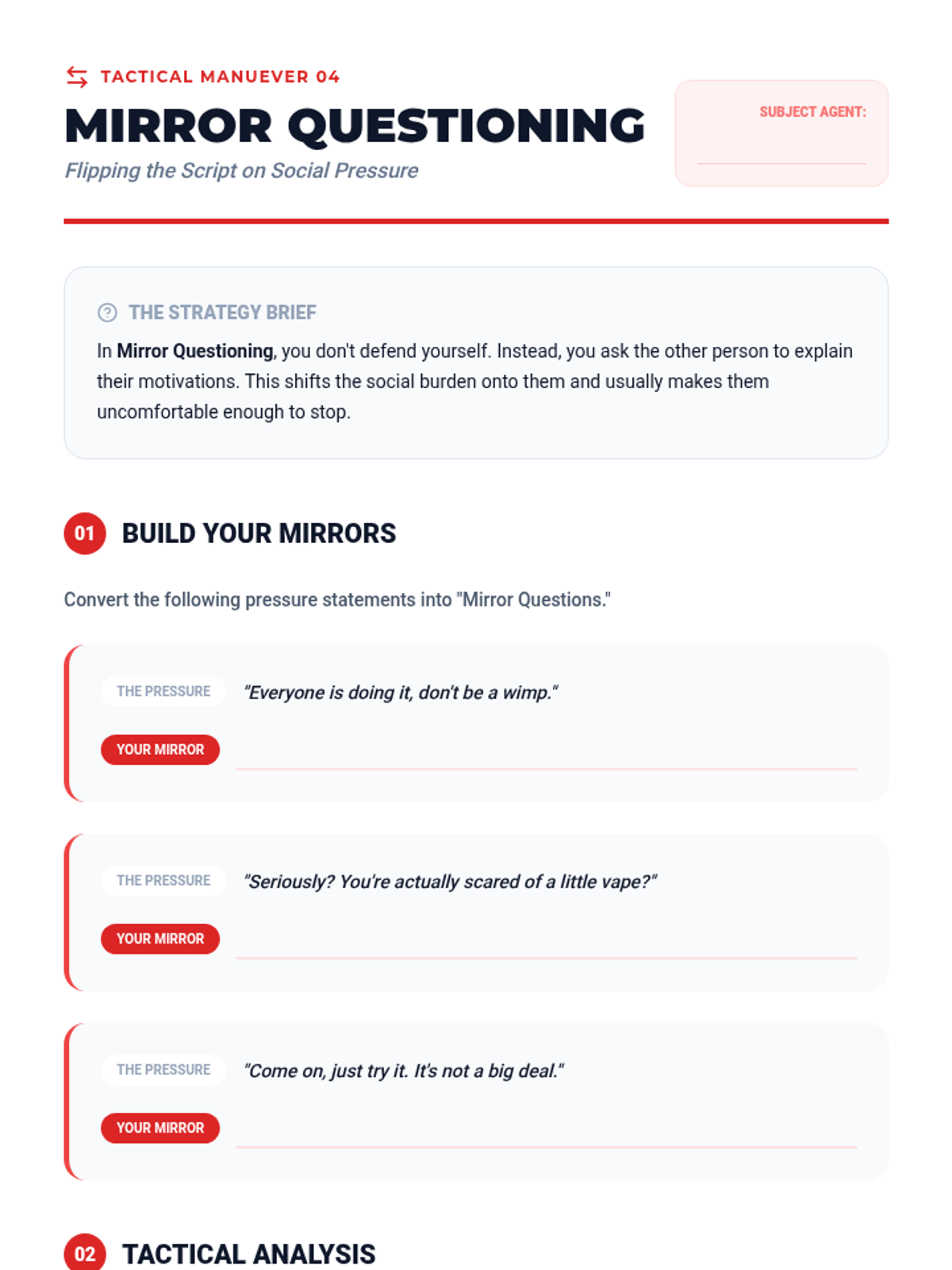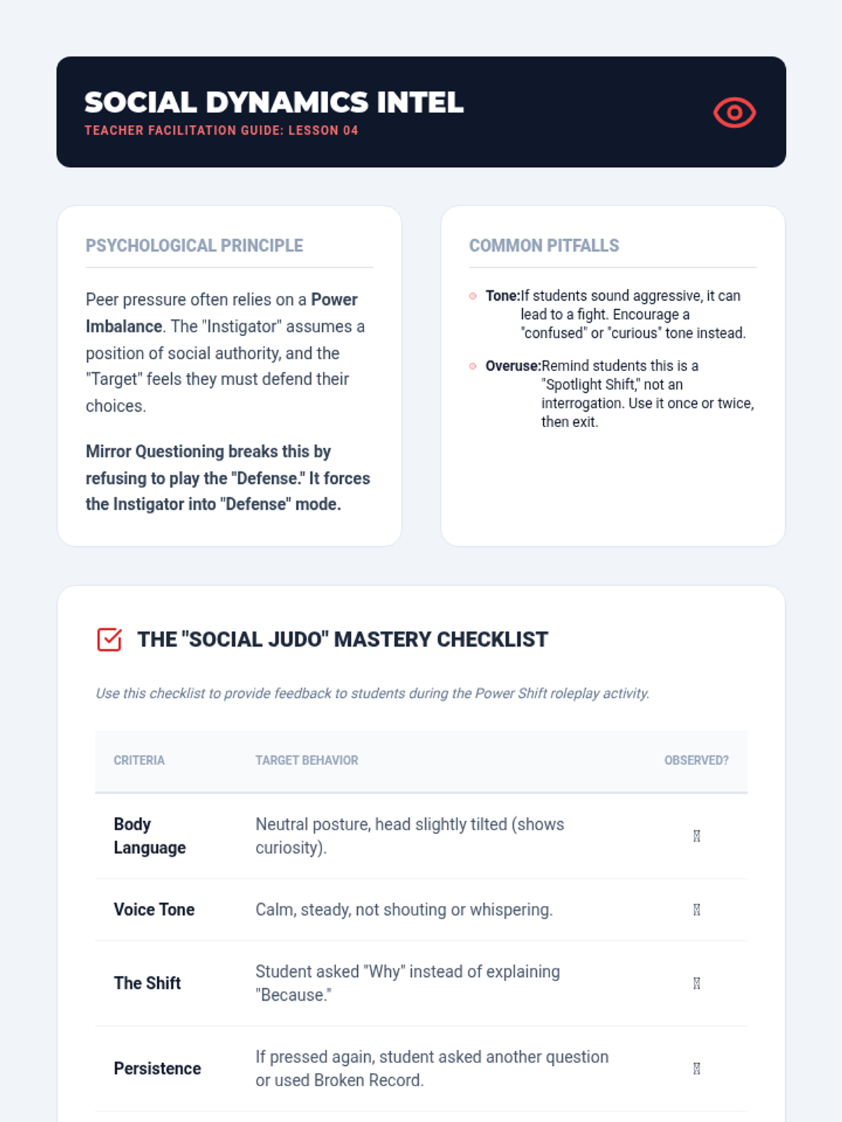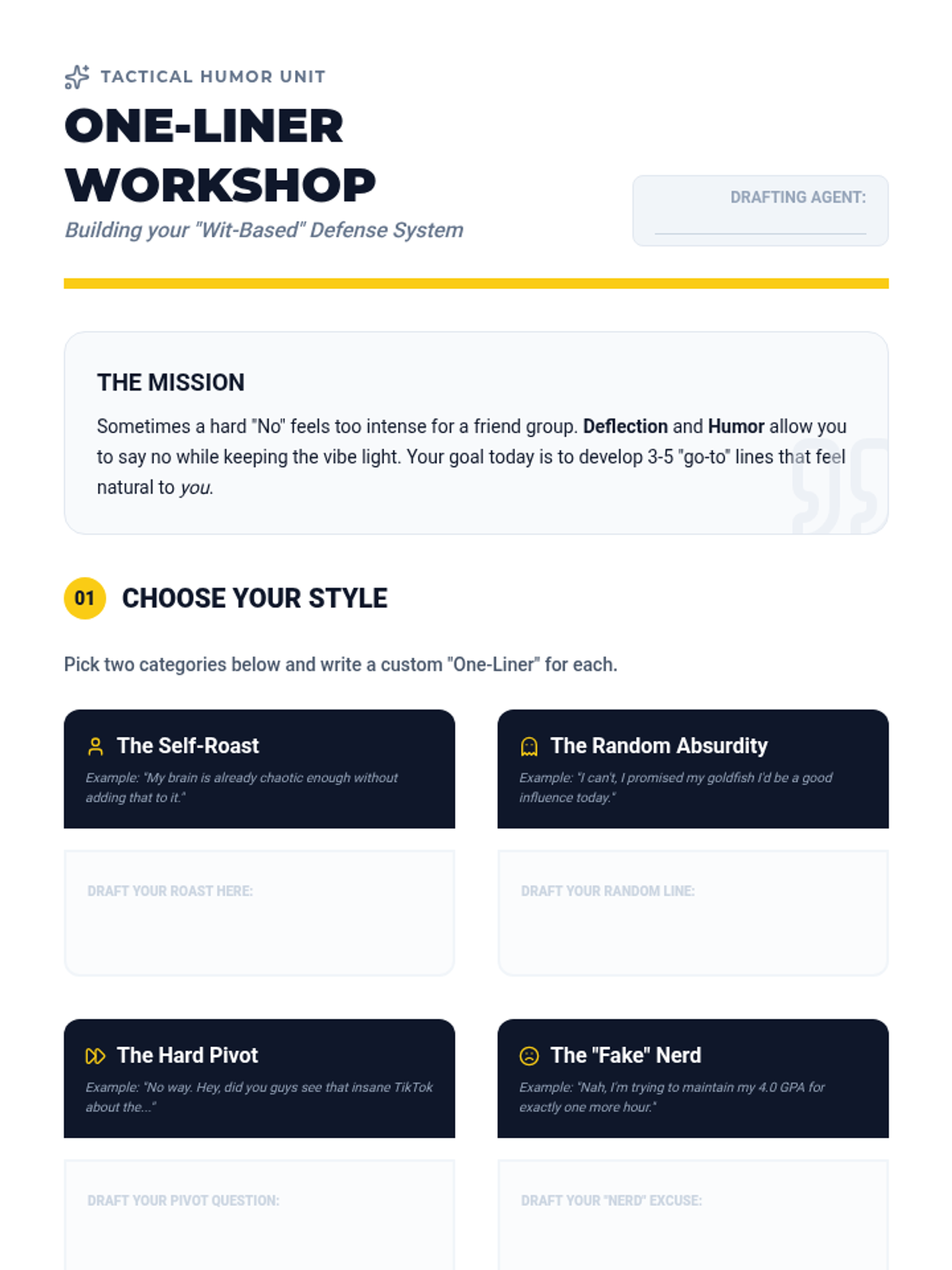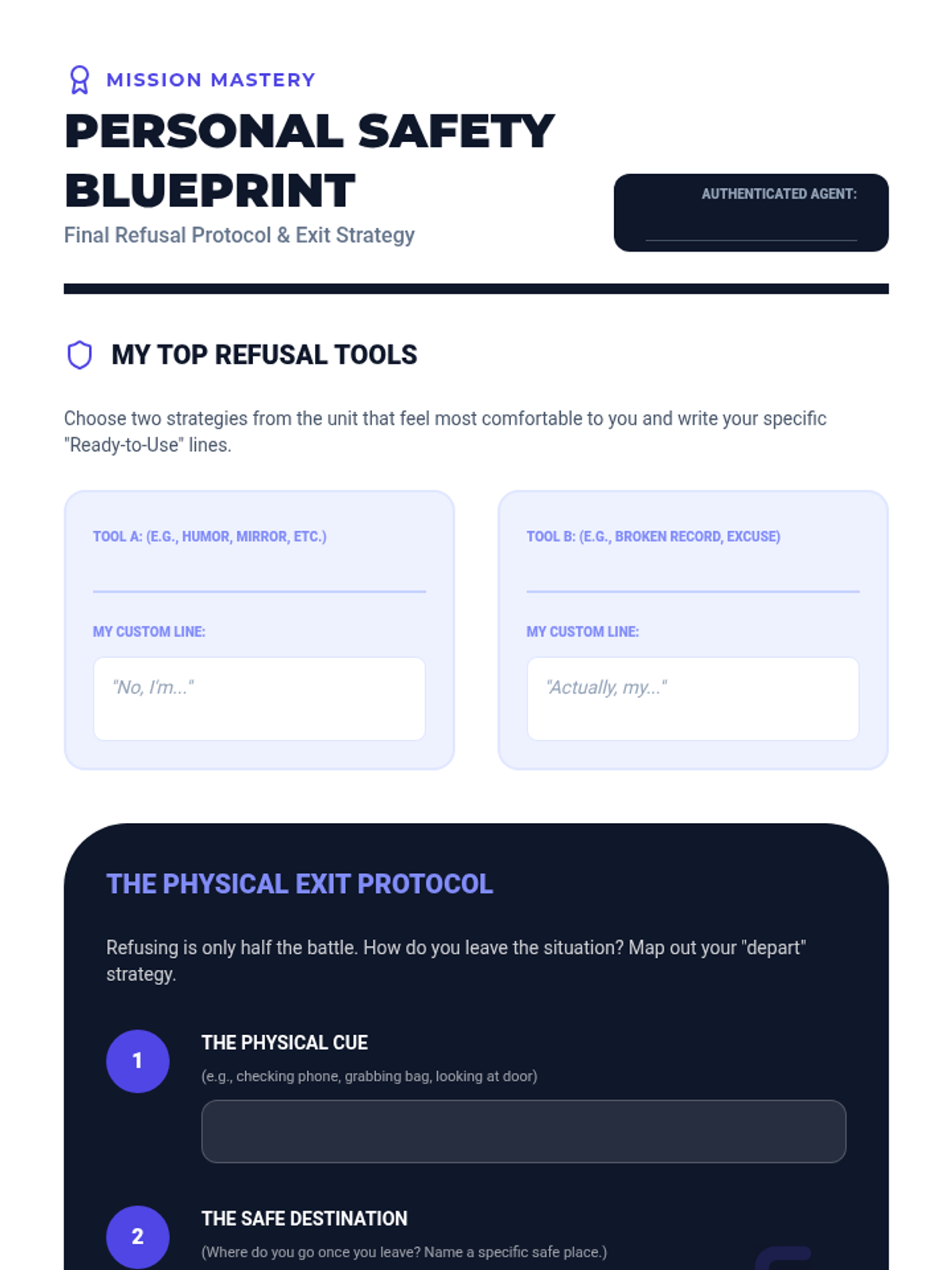 A comprehensive 5-lesson unit for 6th graders to develop and practice concrete refusal skills for substance use and high-pressure social situations. Students transition from simple direct refusals to advanced techniques like 'Reverse the Pressure' and 'Safety Codes.'