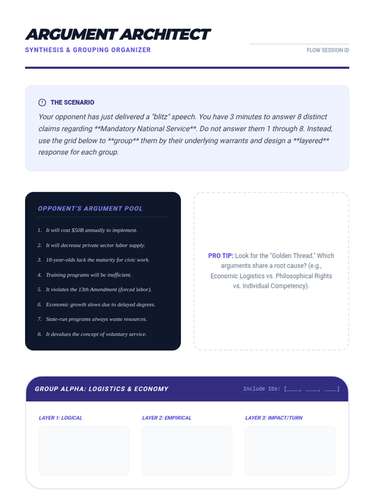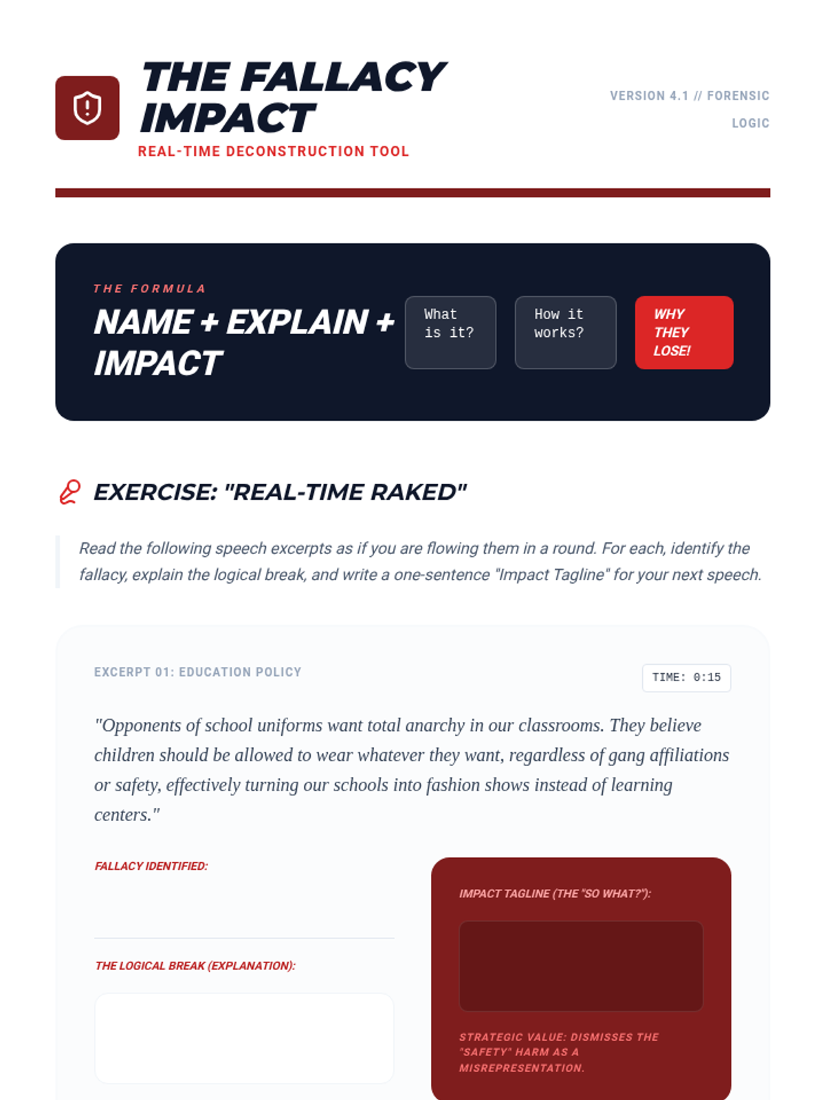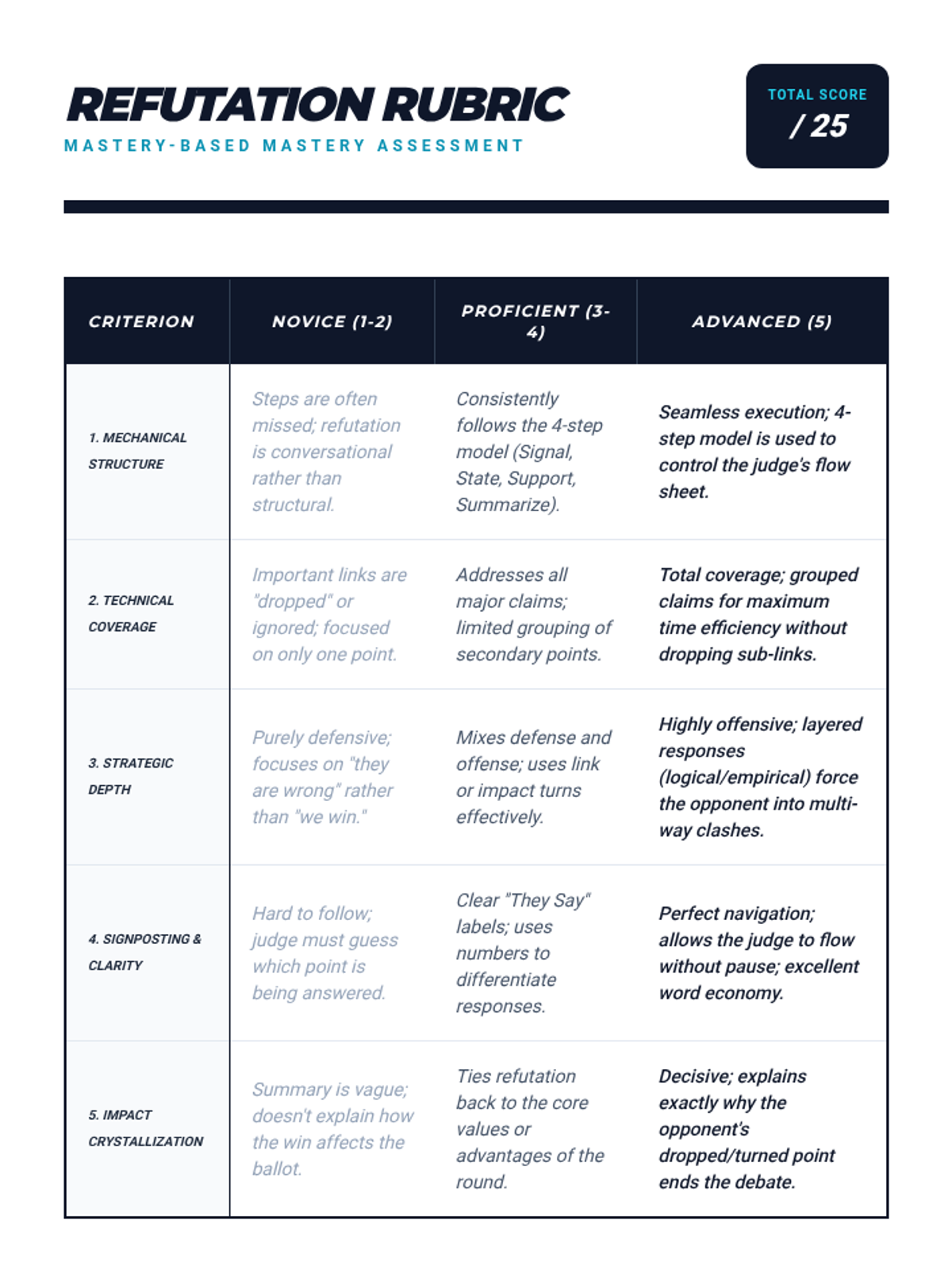 A collegiate-level sequence focused on the technical mechanics of refutation, transitioning from basic four-step structures to advanced line-by-line analysis and strategic grouping. Students master defensive and offensive positioning while developing the efficiency needed for competitive debate.