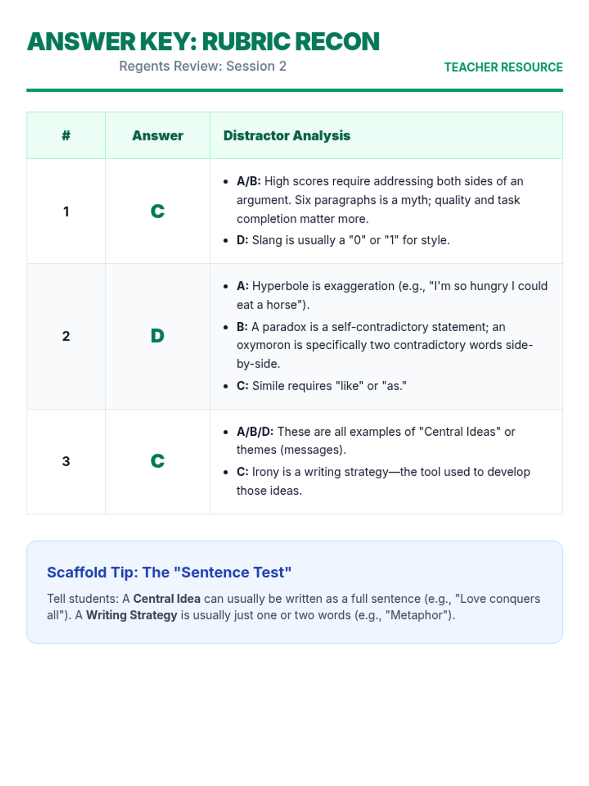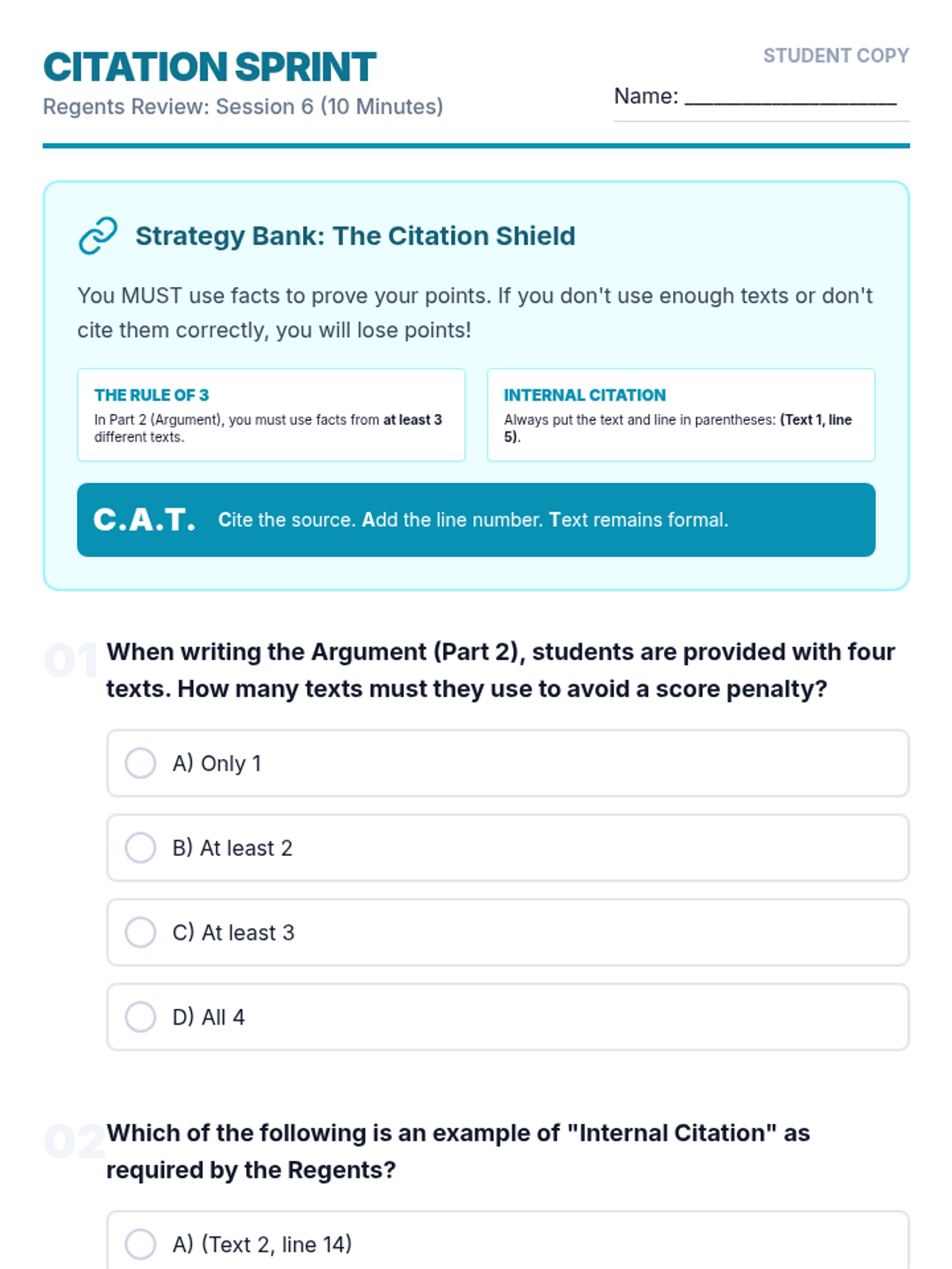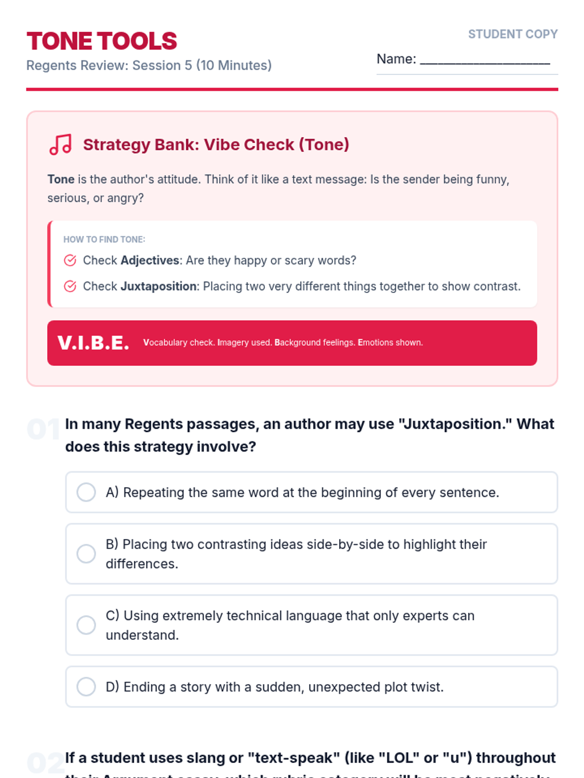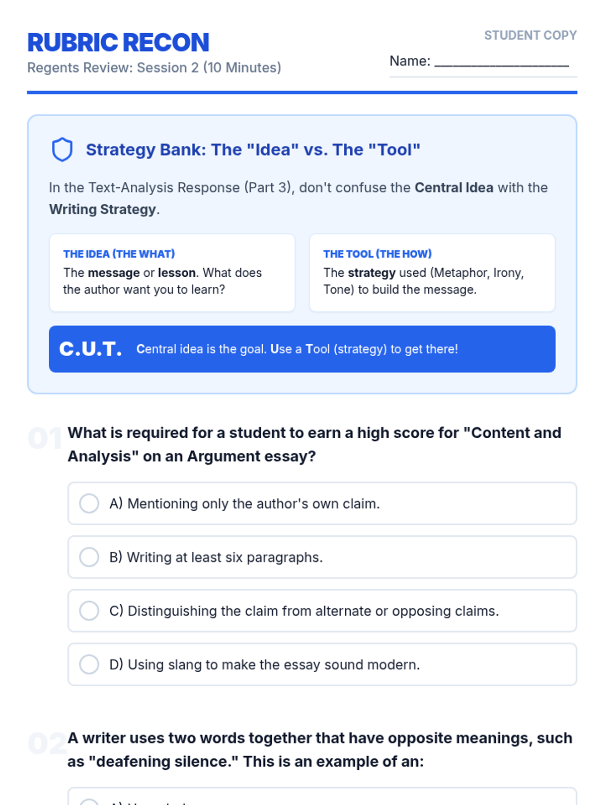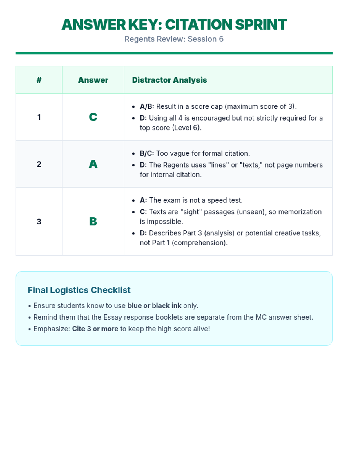A comprehensive 6-lesson spiraling review sequence designed to prepare students for the ELA Regents exam through 10-minute daily practice sessions. Each lesson focuses on specific exam sets and high-impact test-taking strategies.