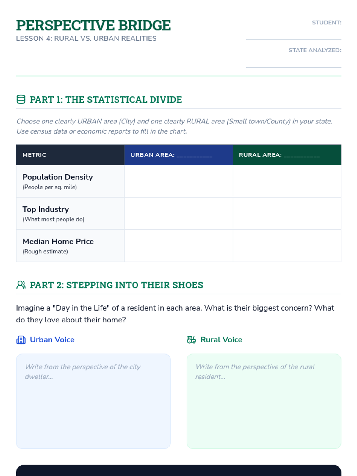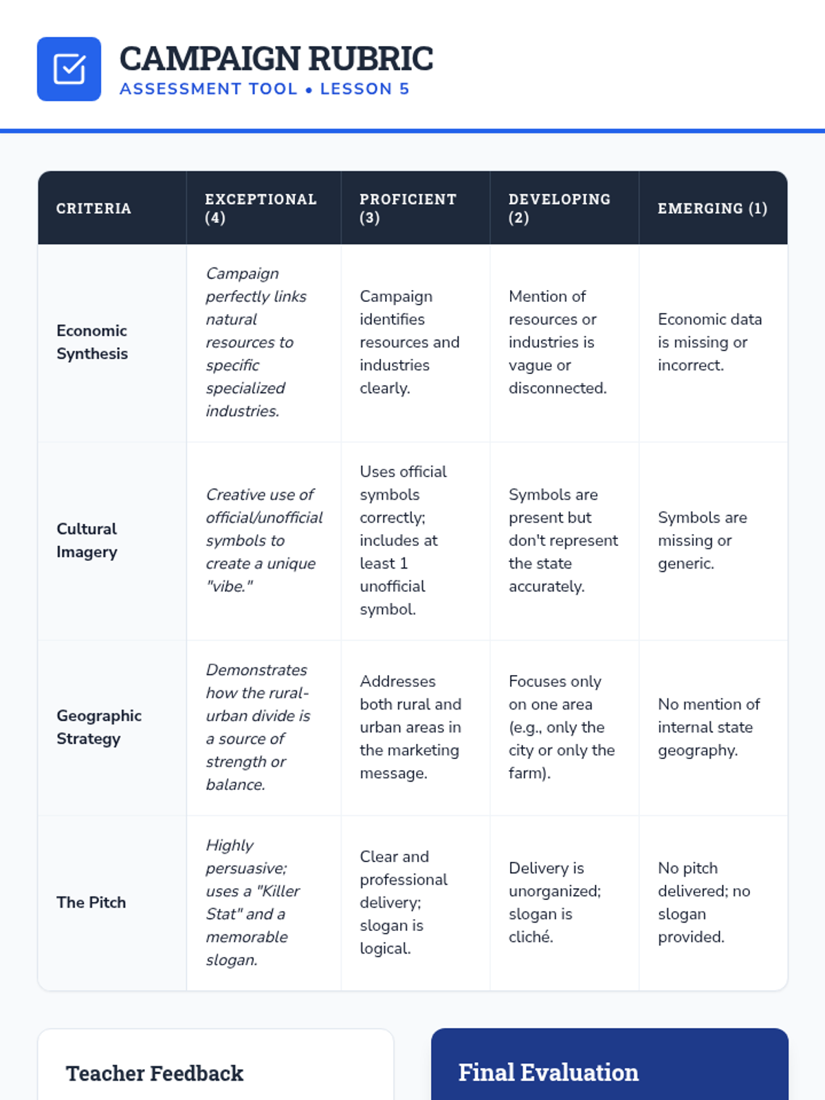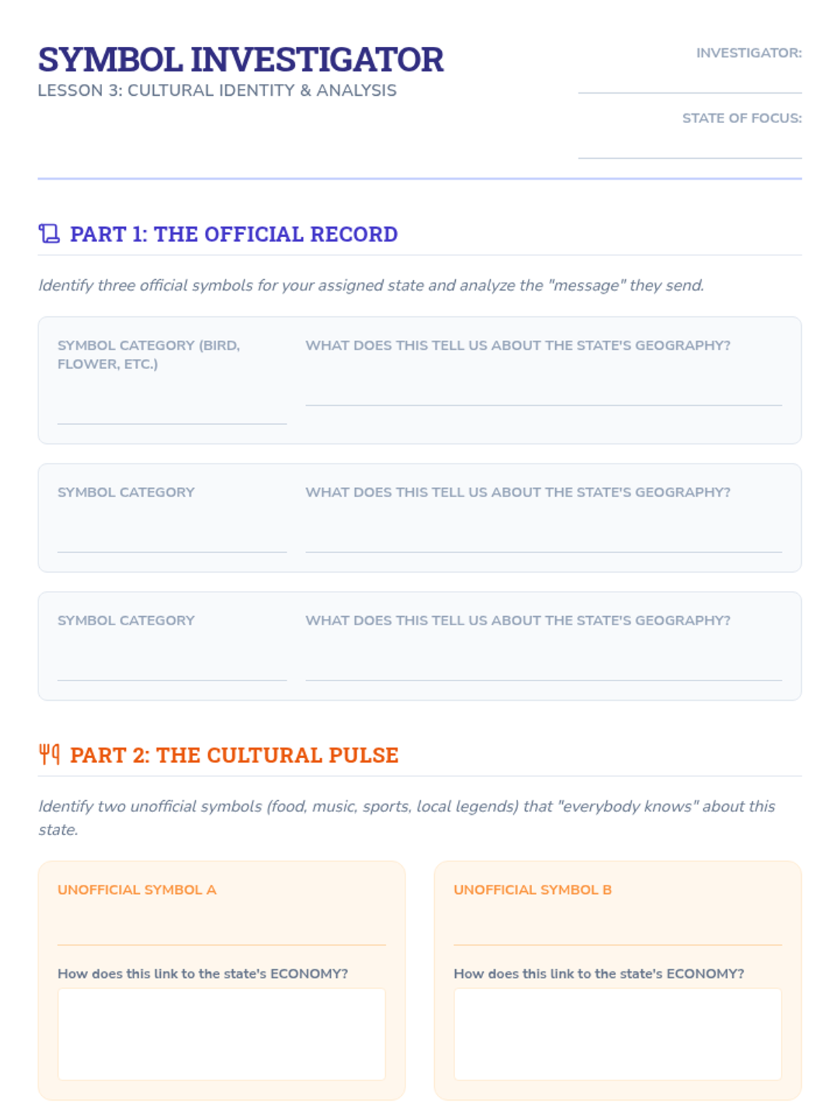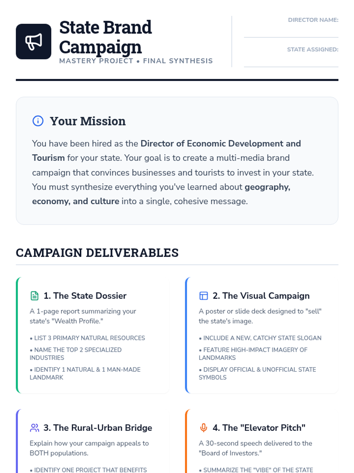 Students explore how physical landscapes dictate economic activities and shape cultural identity across various states, culminating in a marketing project that synthesizes economic assets, cultural symbols, and geographic landmarks into a state brand.