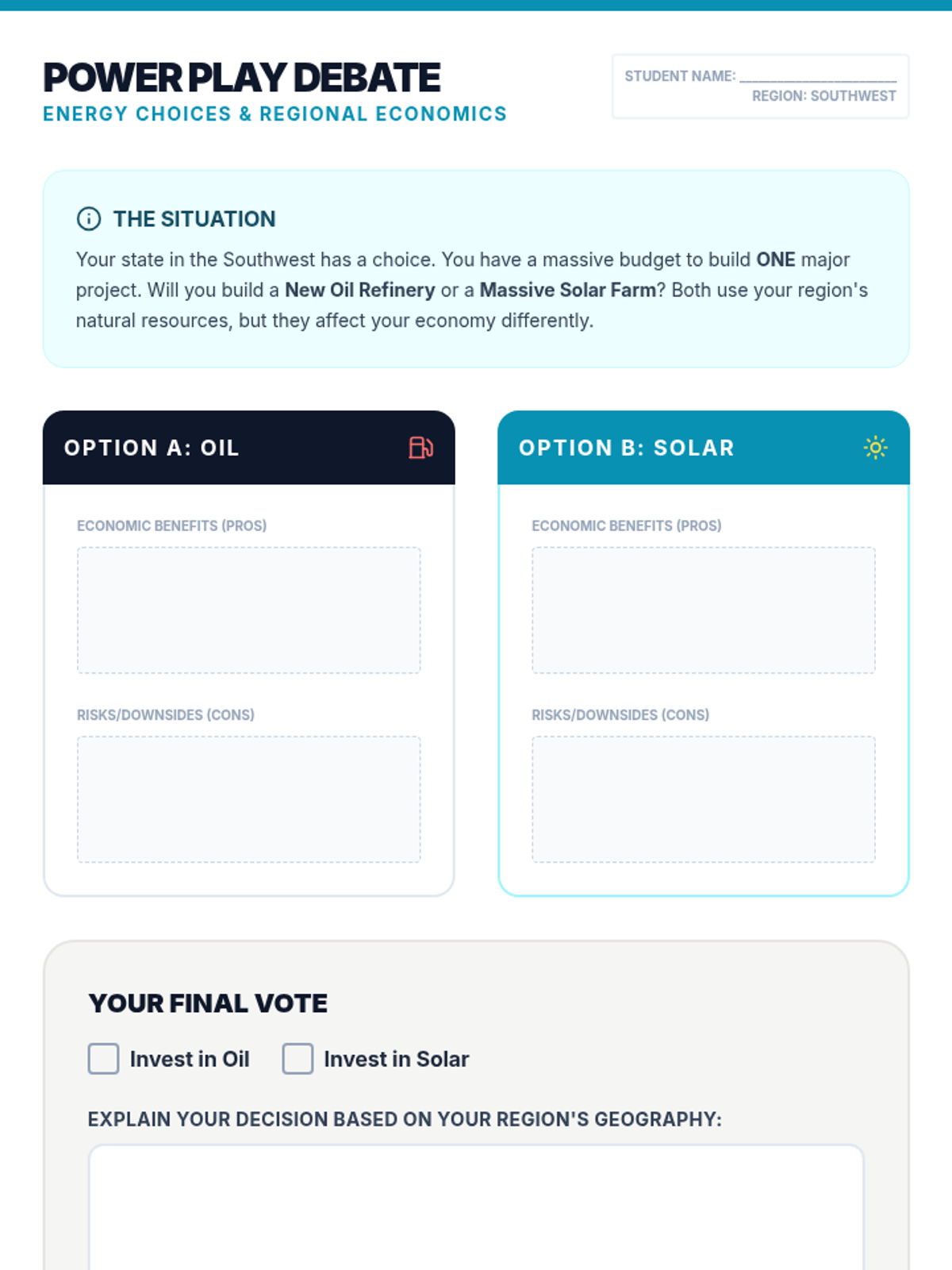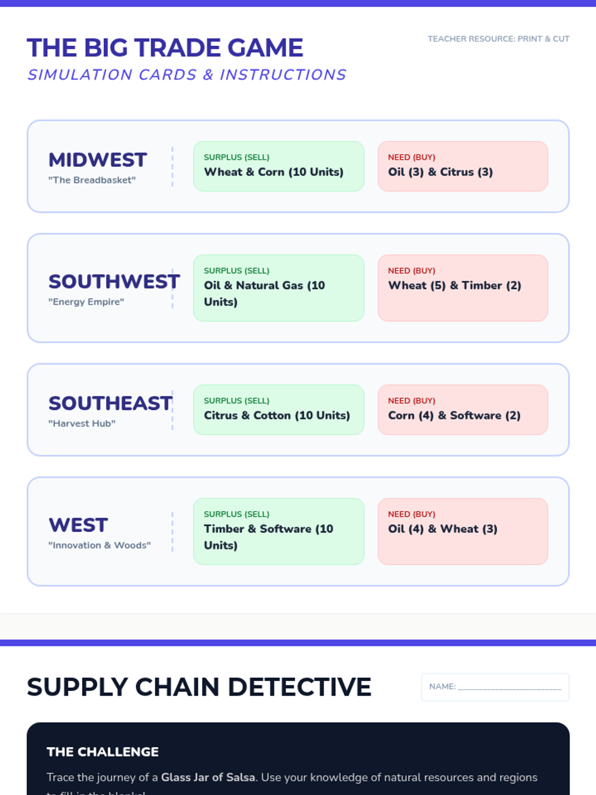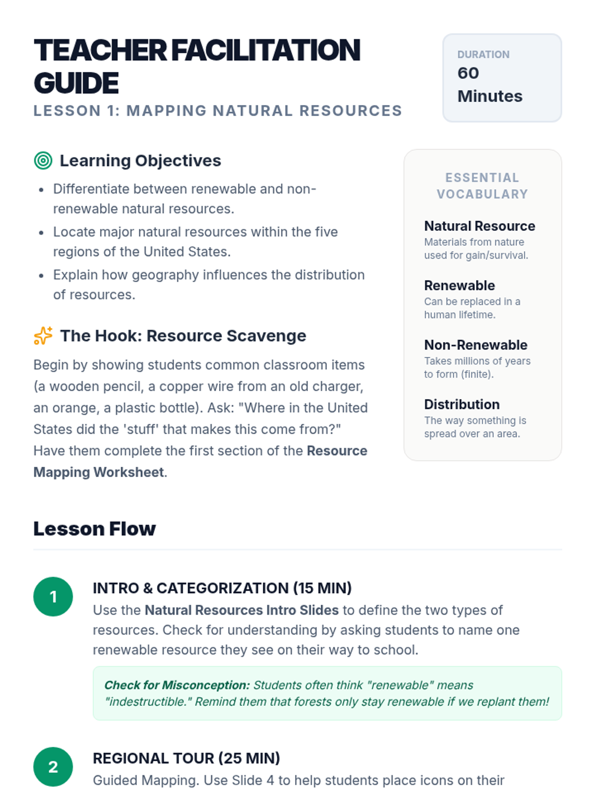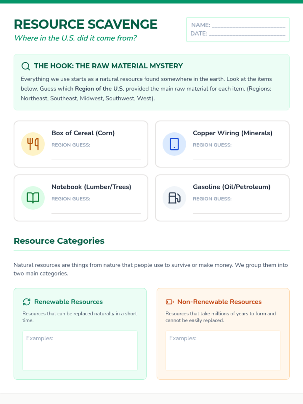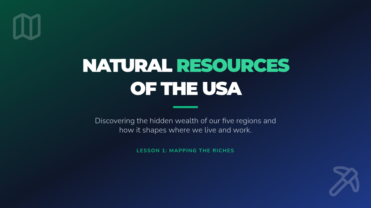 A 5th-grade geography sequence exploring the relationship between natural resources and regional economies across the United States. Students investigate how geography dictates industries, from Midwest agriculture to Western technology, culminating in an understanding of economic interdependence.
