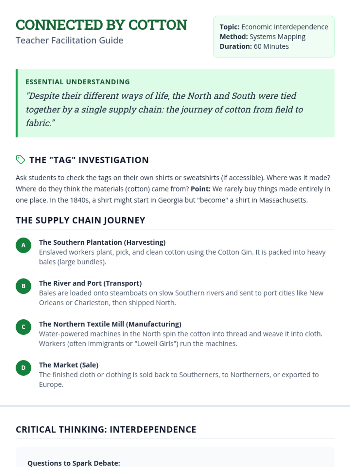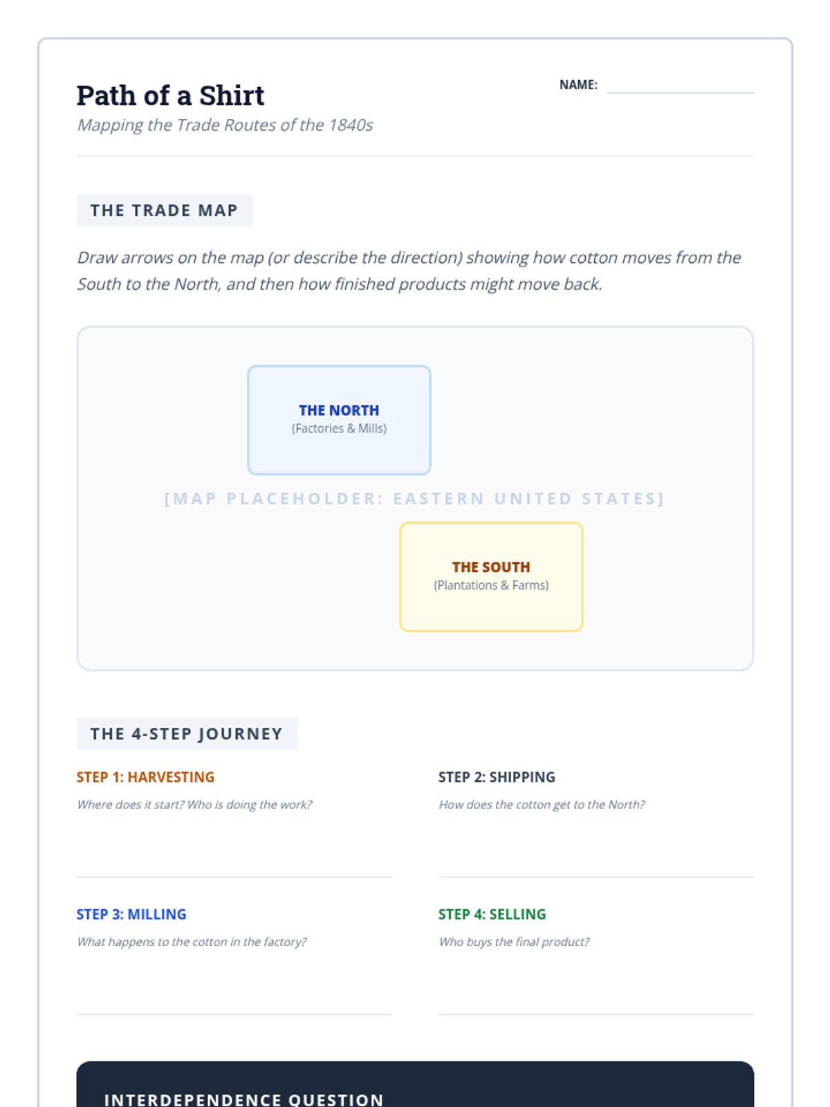 A comparative inquiry into how geography and climate shaped the distinct industrial economy of the North and the agrarian economy of the South during the Antebellum period, emphasizing their interdependence and growing conflicts.