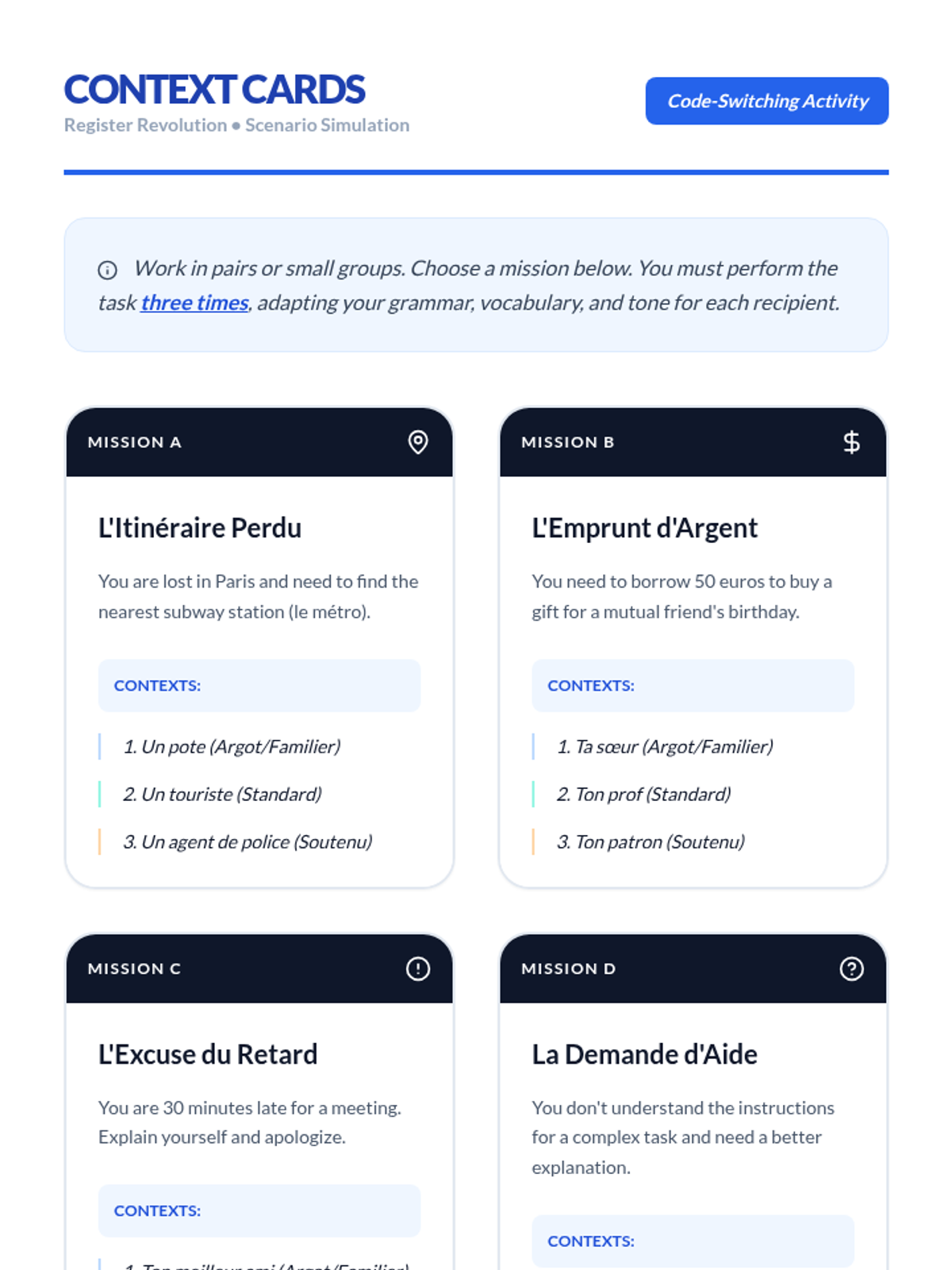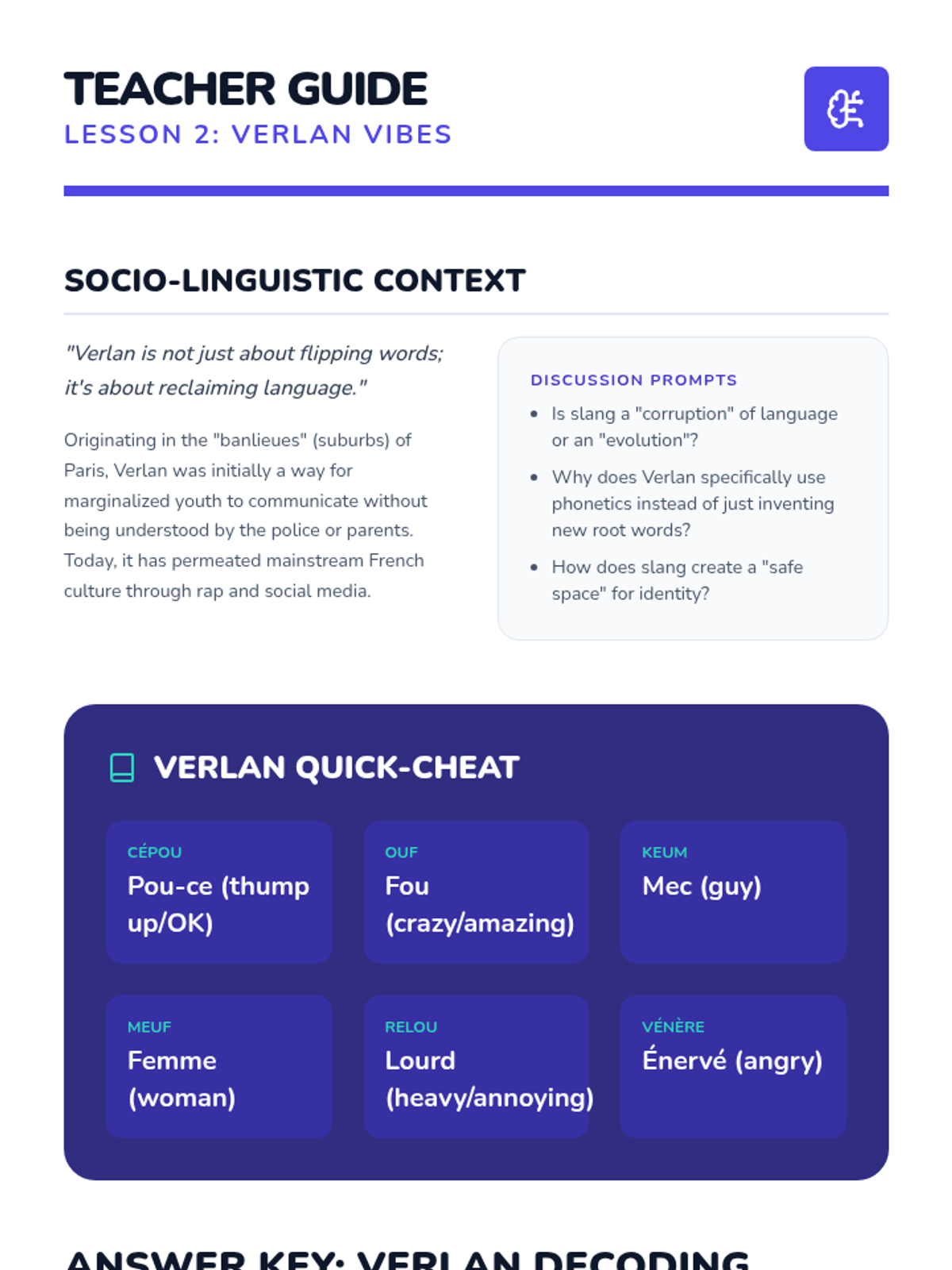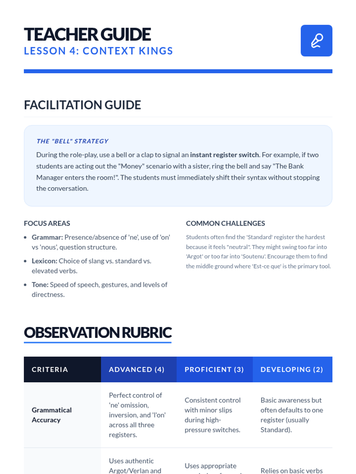 This advanced French sequence explores the sociolinguistic layers of the French language, from slang and Verlan to formal 'soutenu' register. Students develop the ability to navigate social contexts through grammatical precision and vocabulary choice, mastering the art of code-switching.