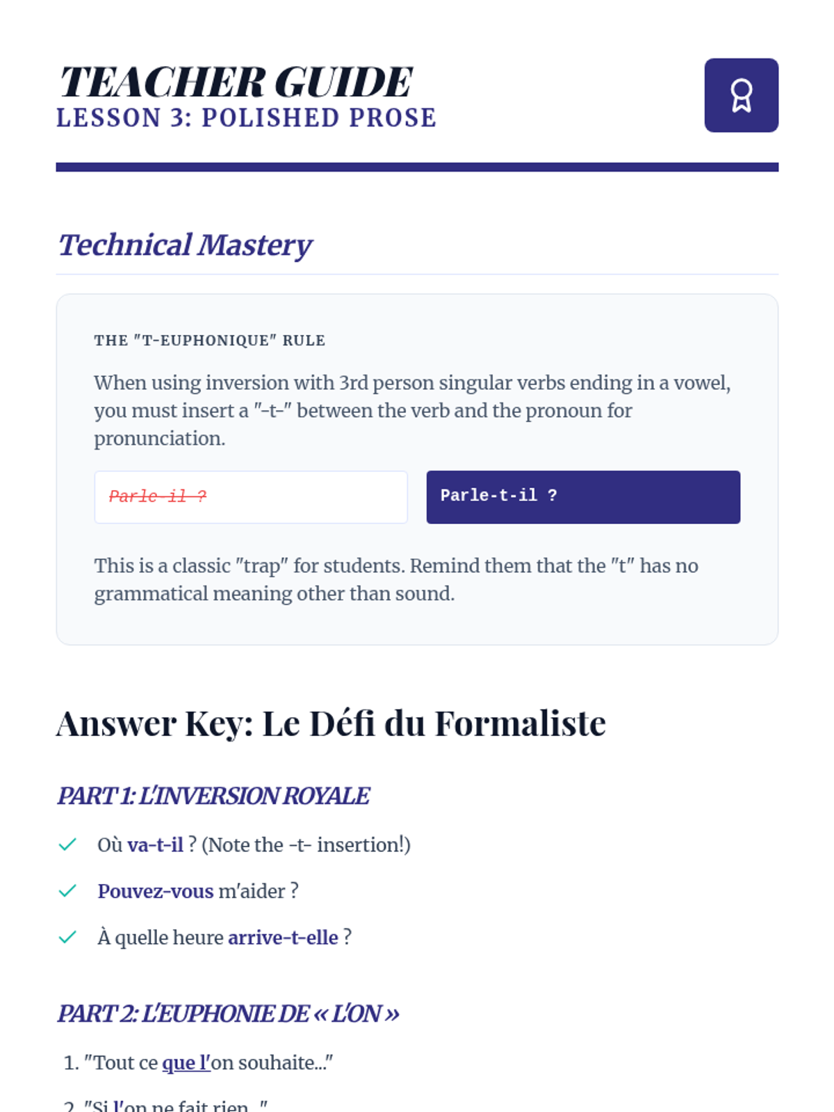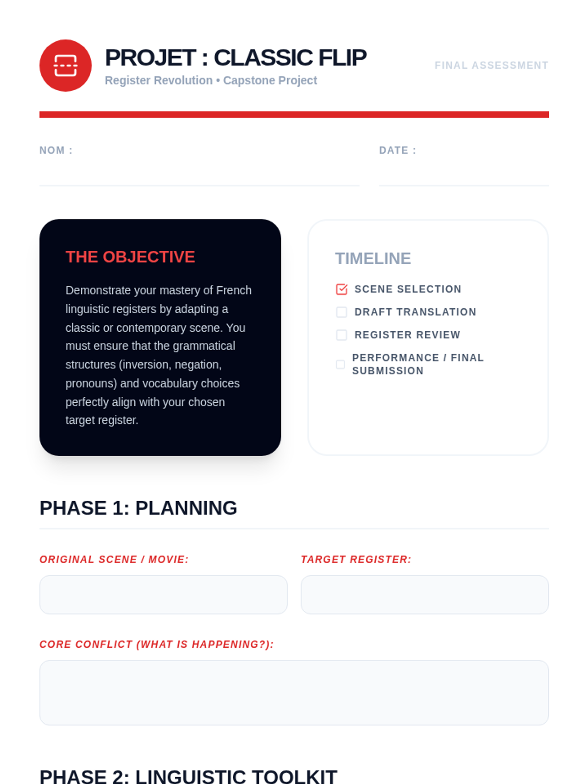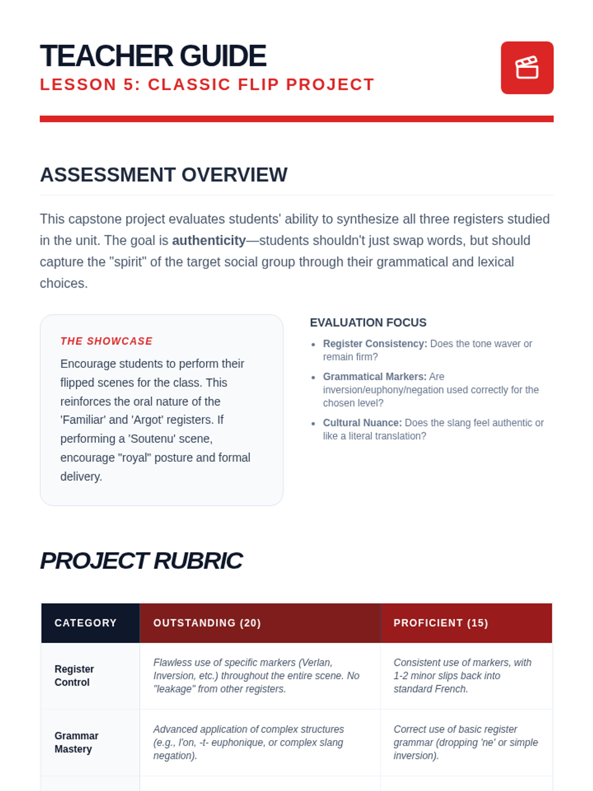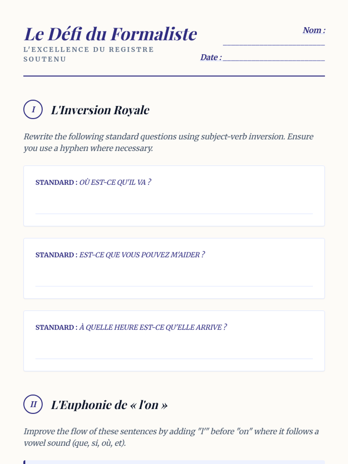 This advanced French sequence explores the sociolinguistic layers of the French language, from slang and Verlan to formal 'soutenu' register. Students develop the ability to navigate social contexts through grammatical precision and vocabulary choice, mastering the art of code-switching.