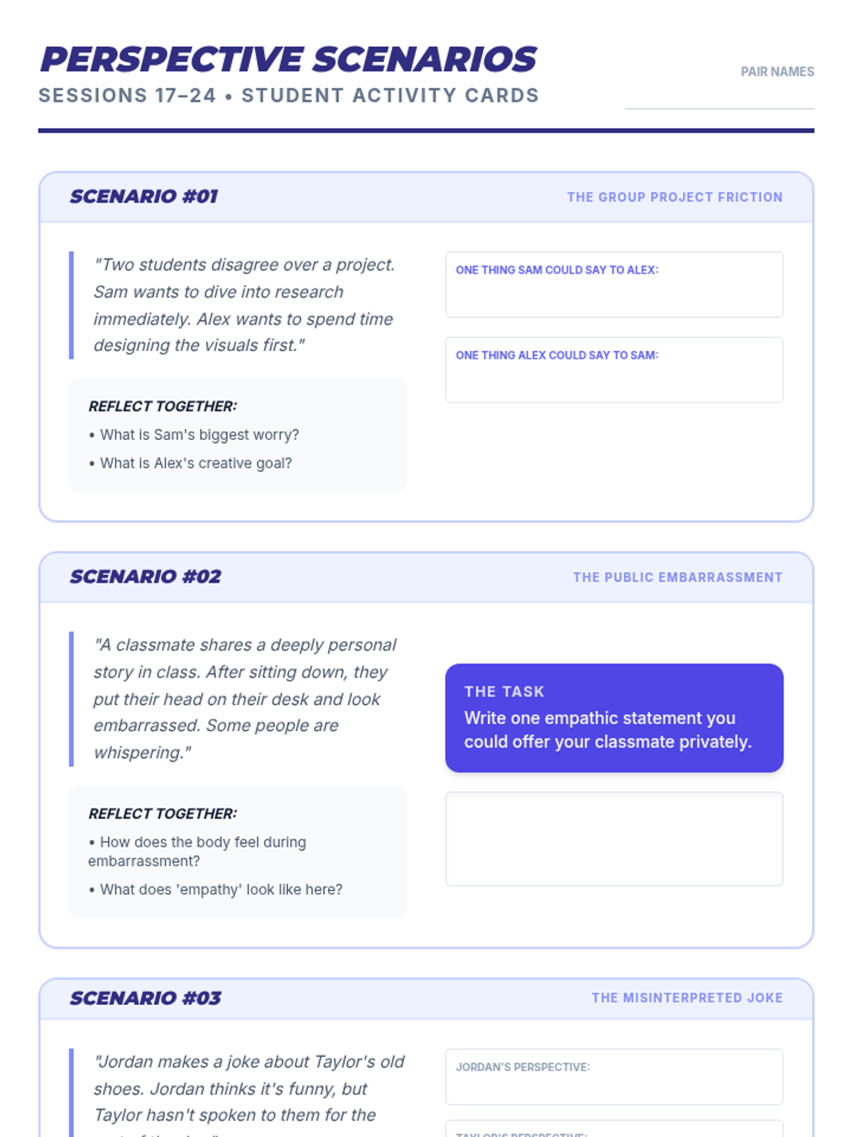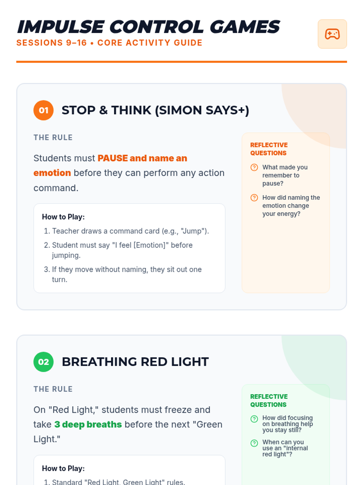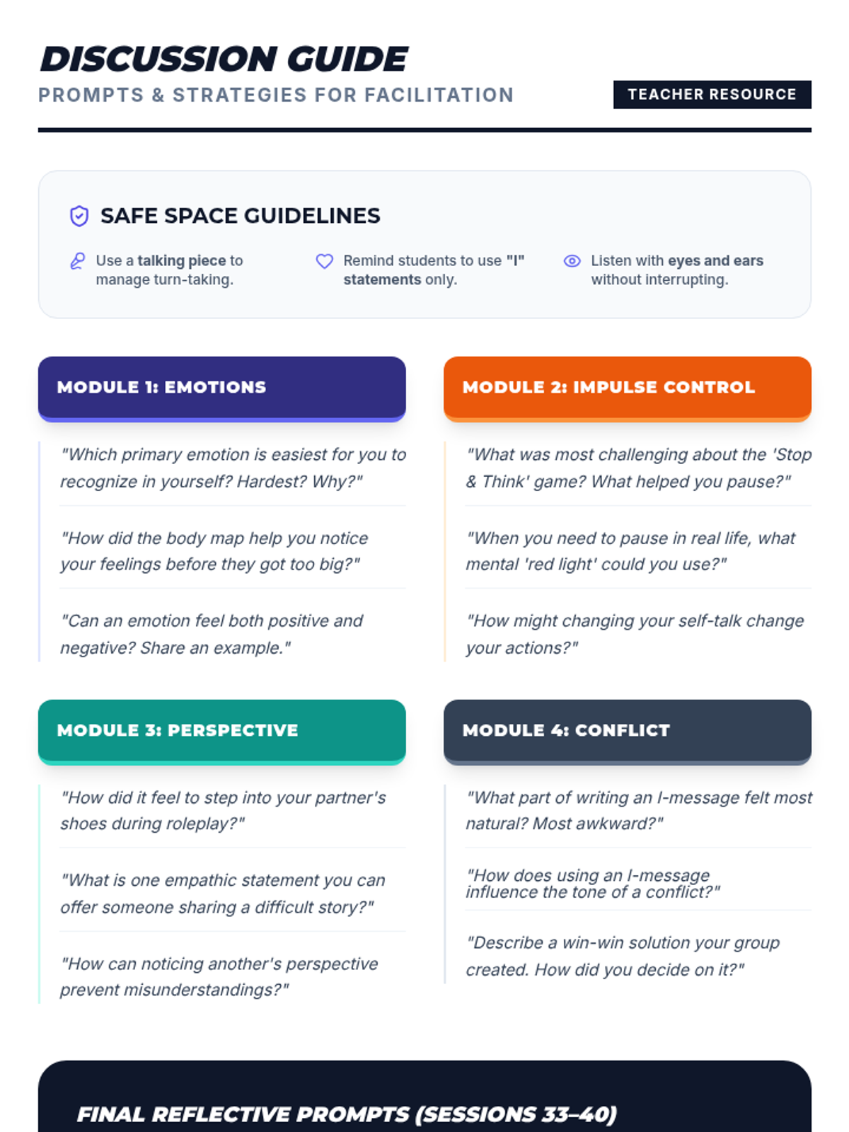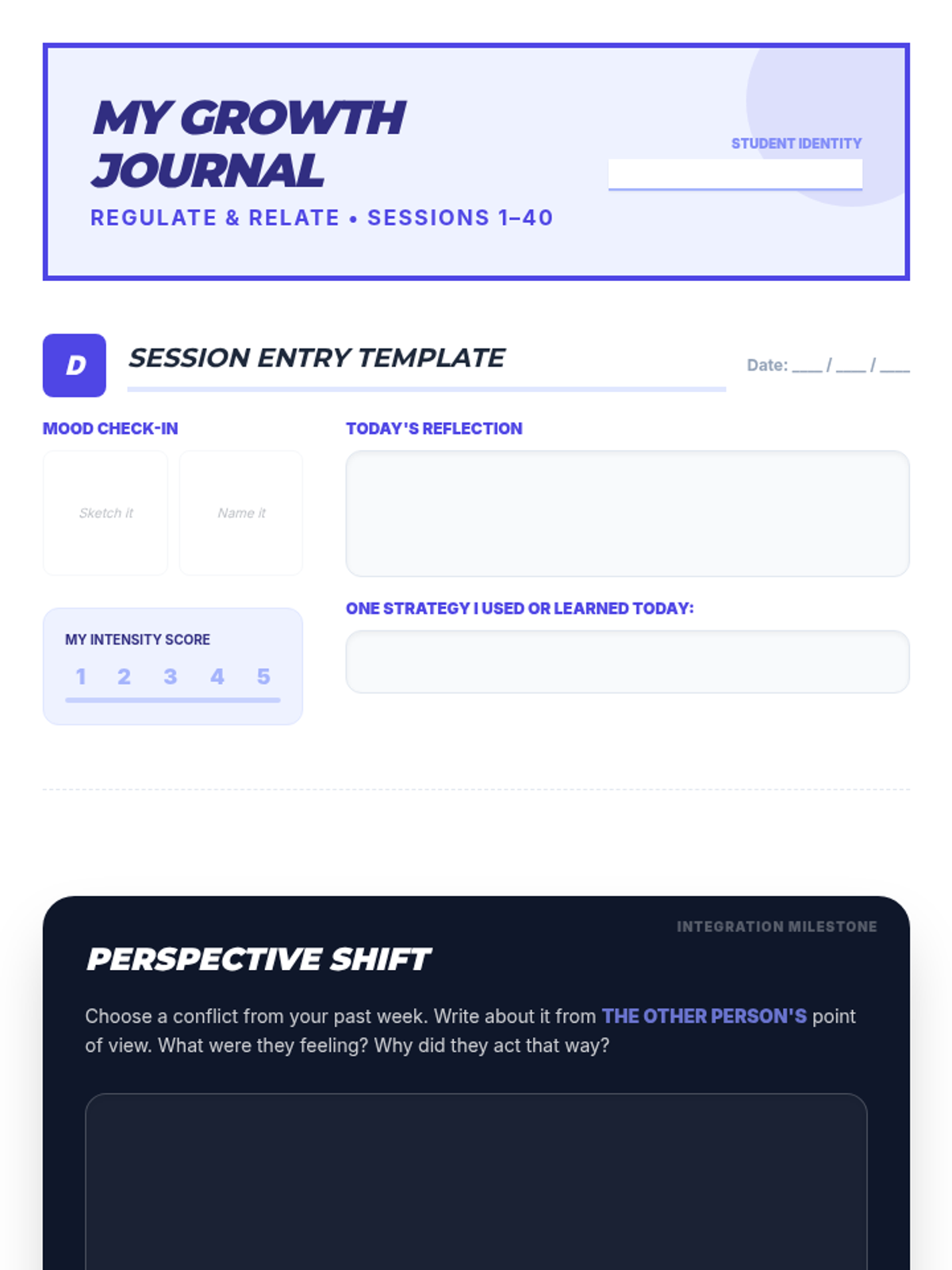 A comprehensive 40-session group series for 8th graders designed to improve self-regulation, emotional intelligence, and peer relationships through interactive practice and reflection.