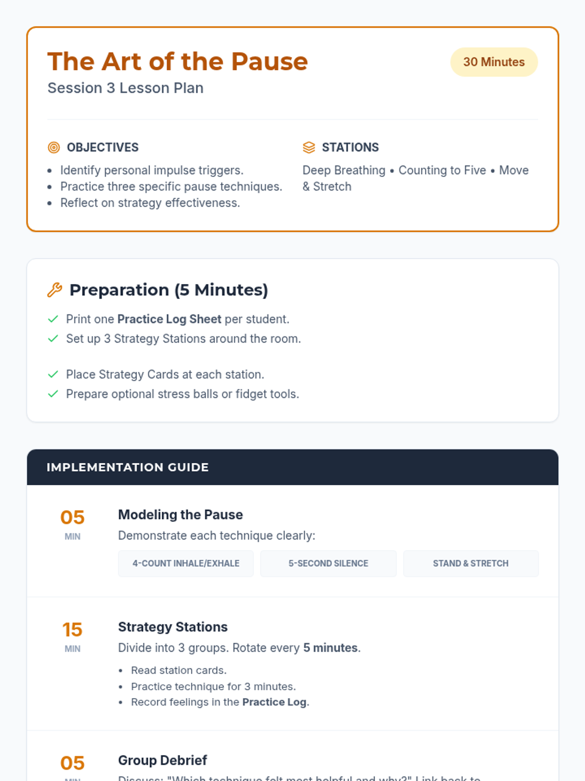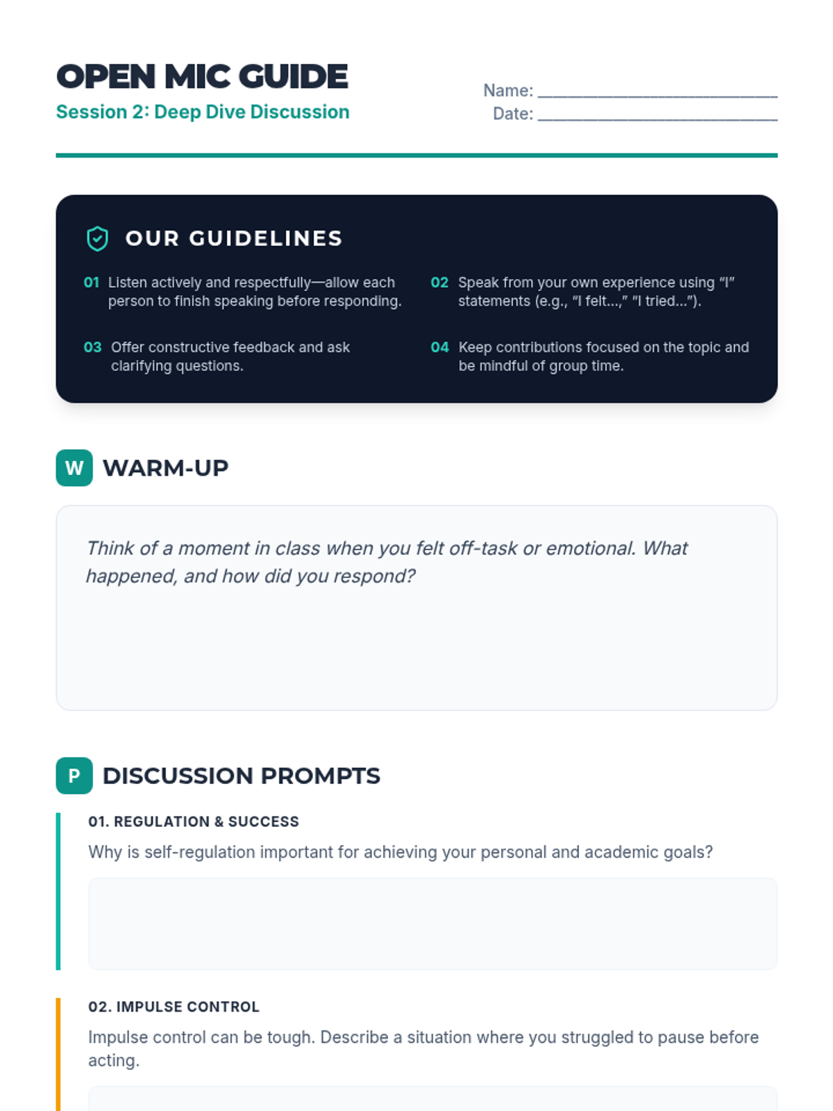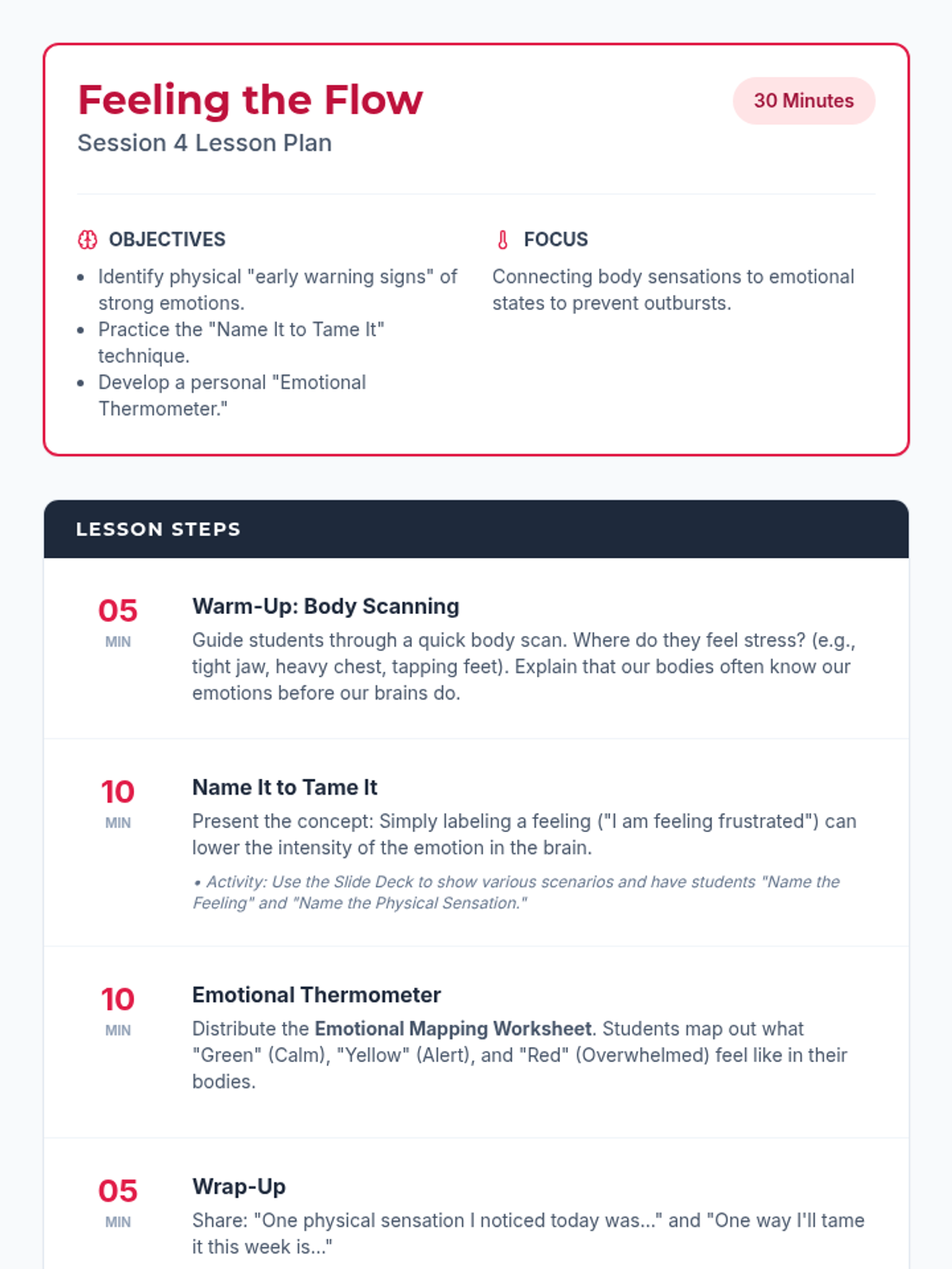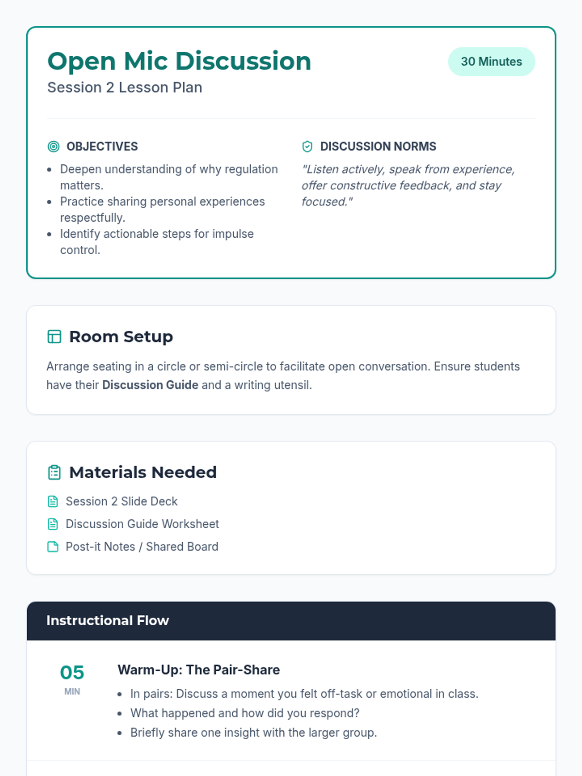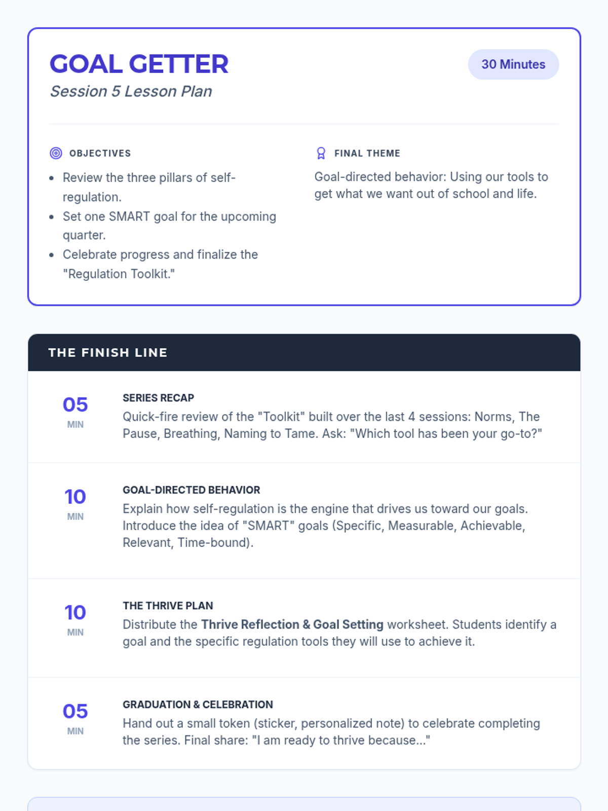 A five-session series for 9th-12th graders focused on building self-regulation skills for students with ADHD and emotional disabilities. The series covers foundational concepts, impulse control, emotional awareness, and goal-directed behavior through interactive activities and discussions.