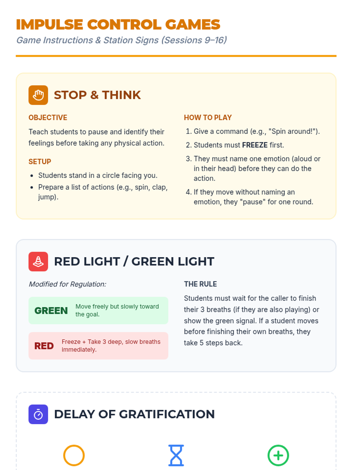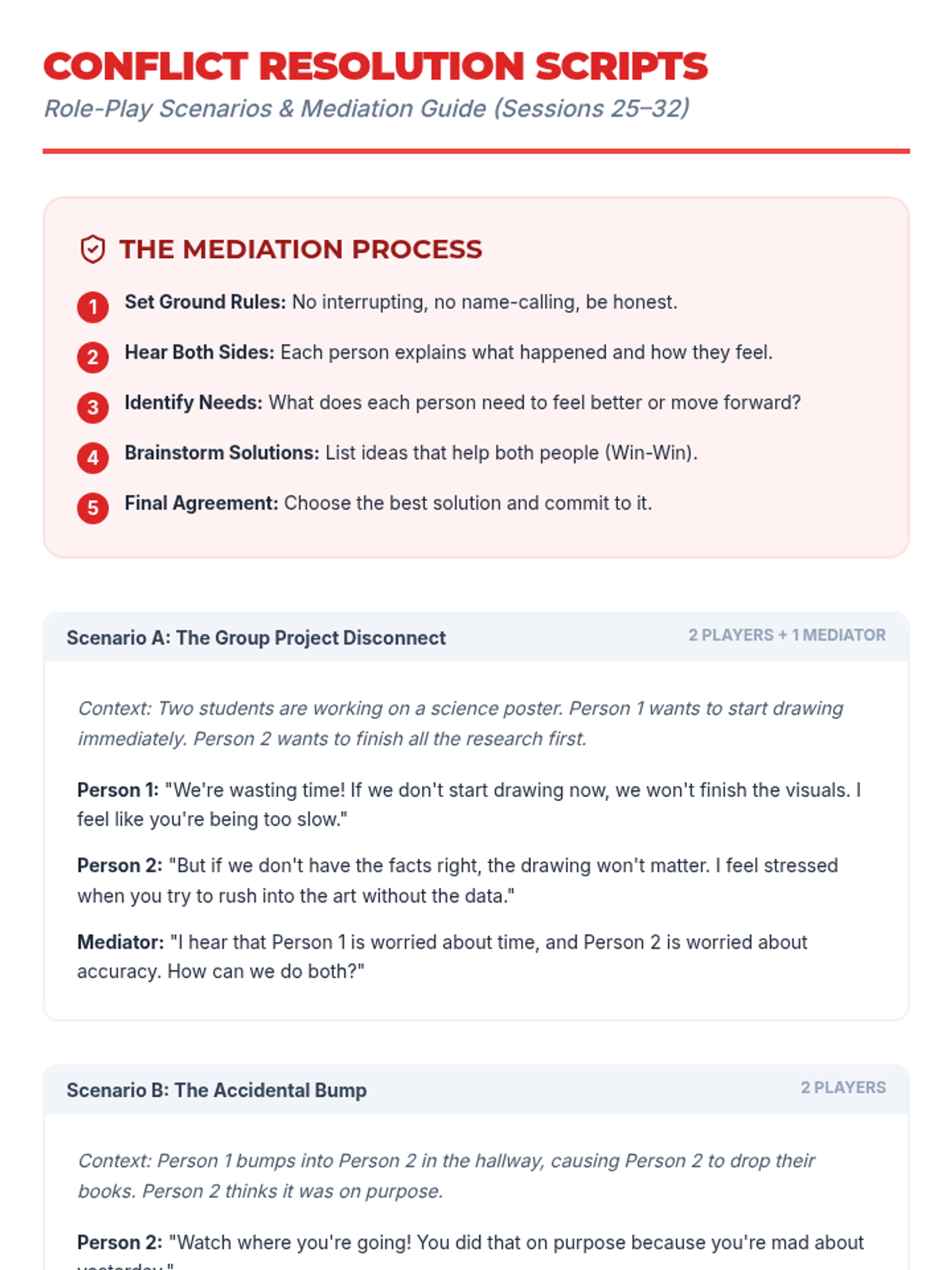 A 40-session group counseling series for 8th graders designed to build emotional intelligence, impulse control, and conflict resolution skills through short, daily 15-minute interactions.
