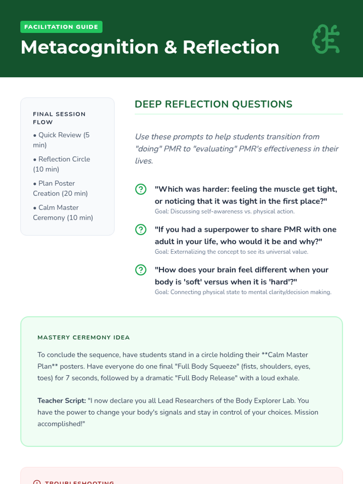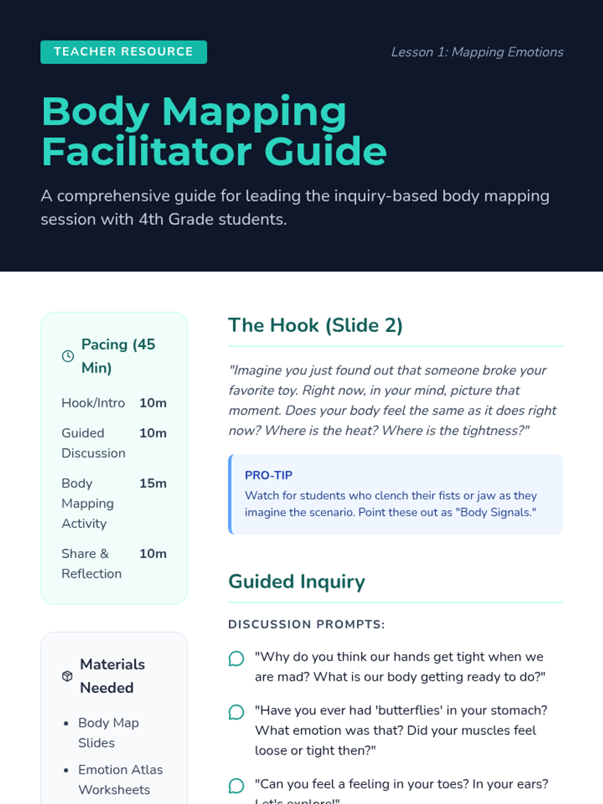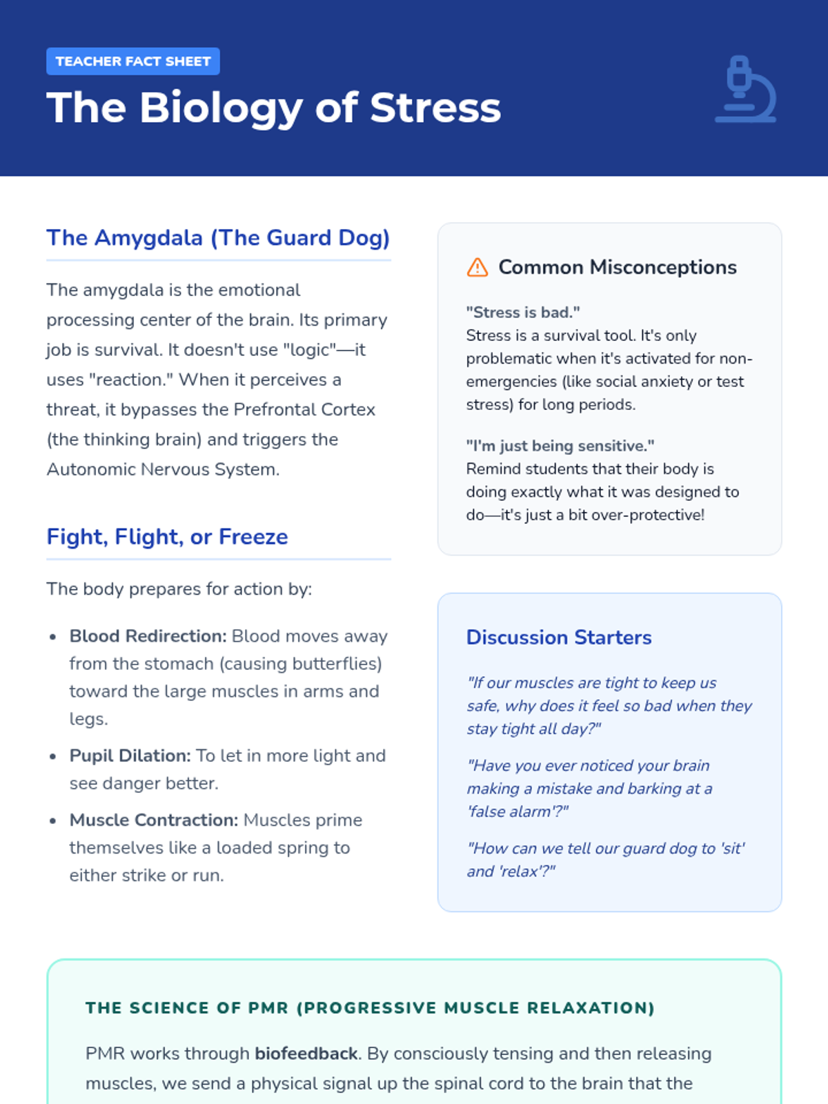 A 5-lesson sequence for 4th graders exploring the link between emotional stress and physical tension, using Progressive Muscle Relaxation (PMR) as a primary regulation tool. Students map emotions in the body, learn the science of stress, and practice PMR in simulated real-world scenarios like tests and playground conflicts.