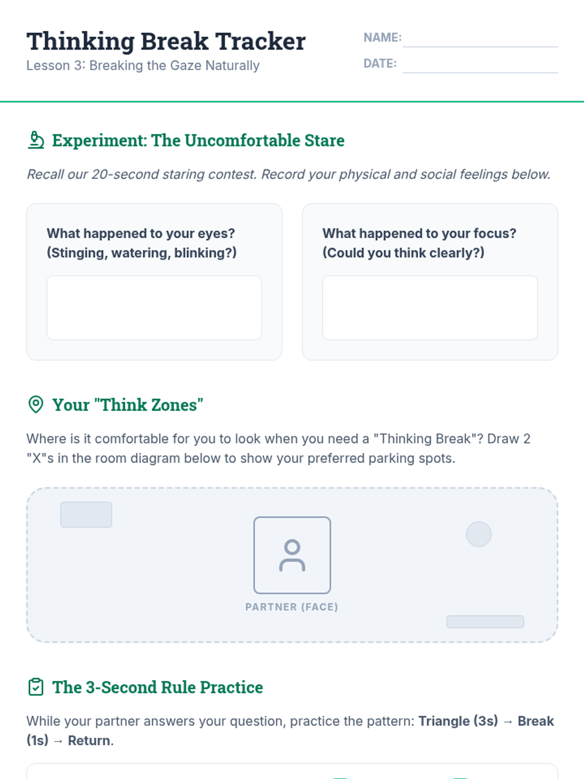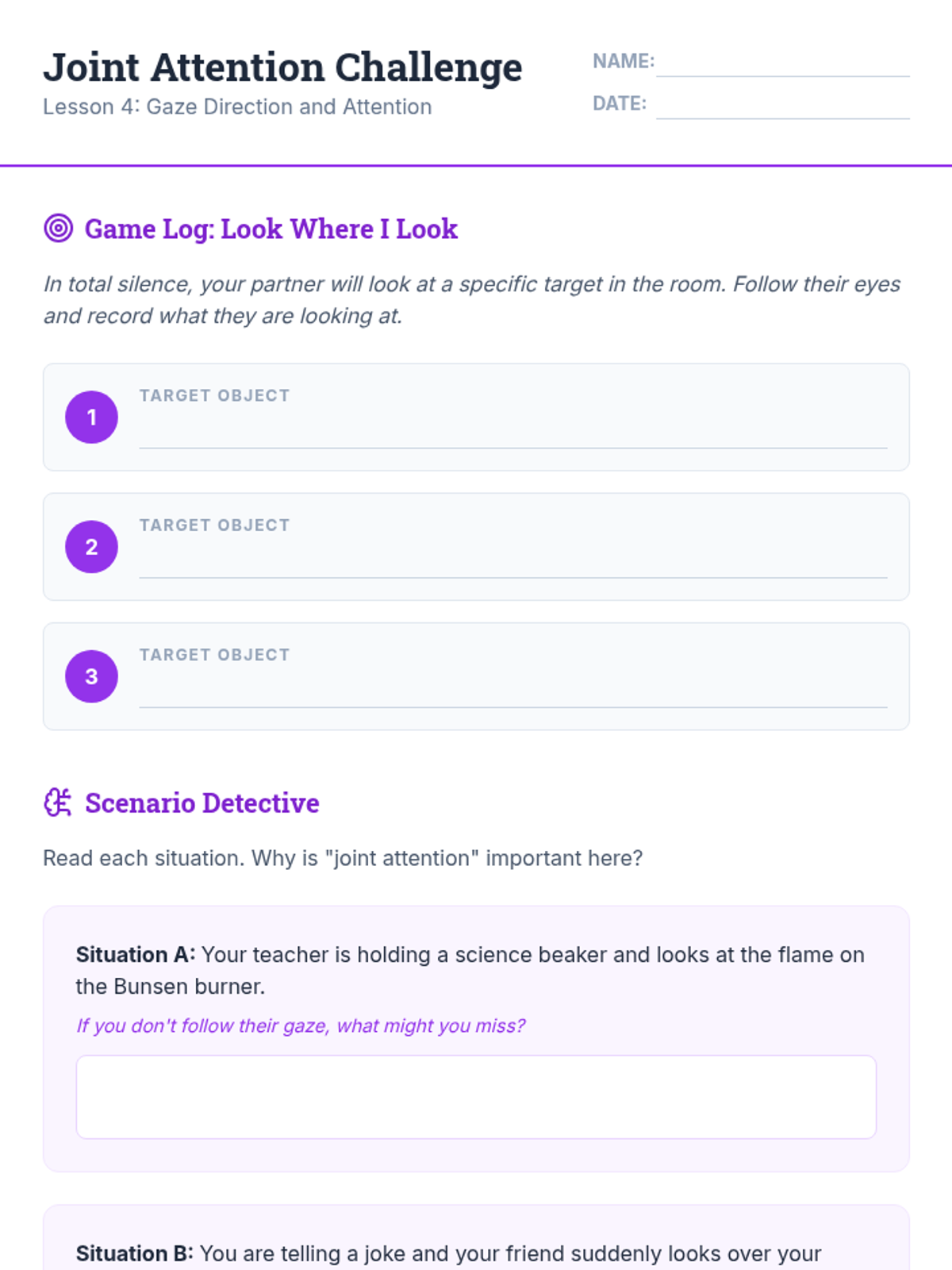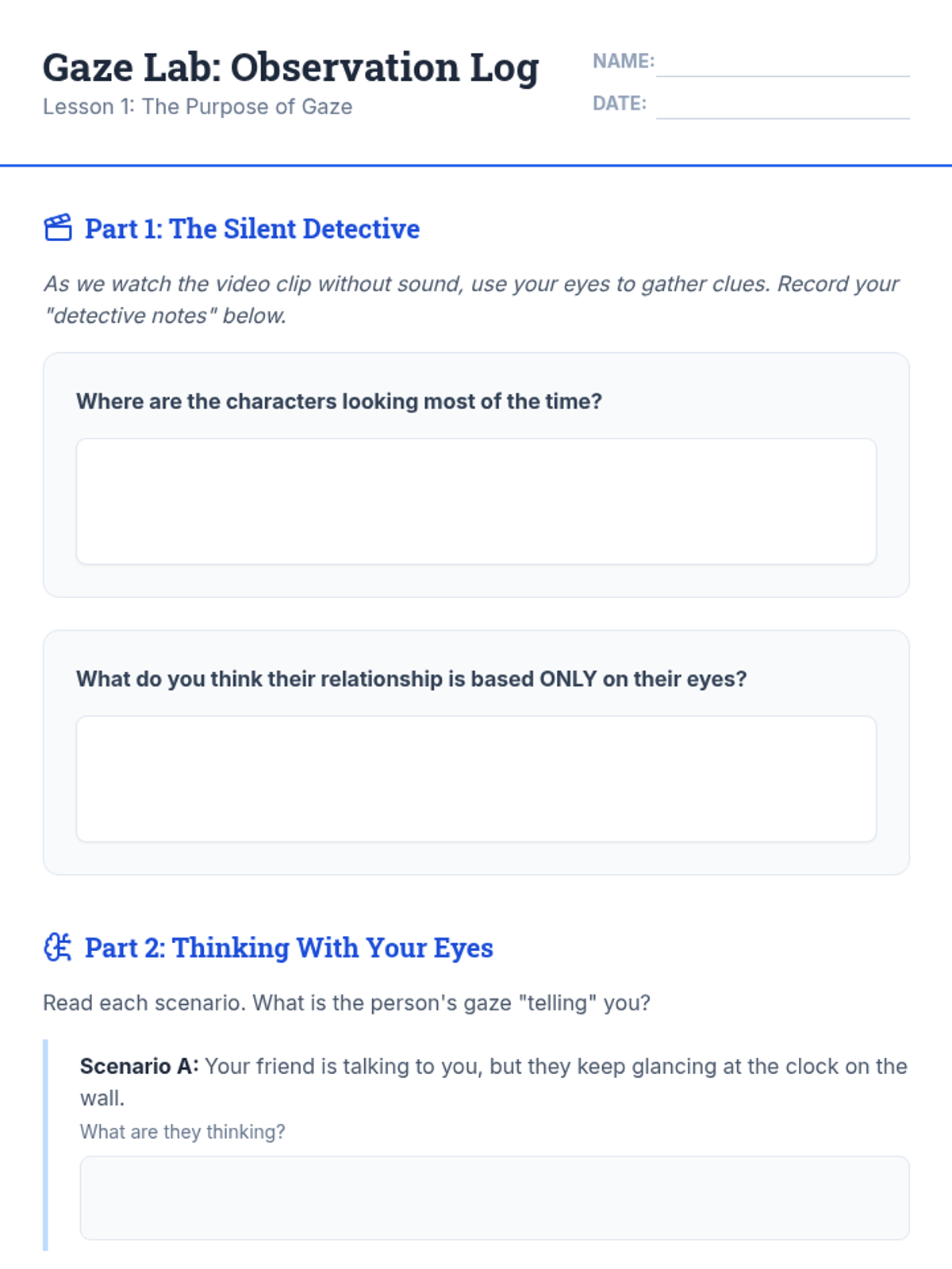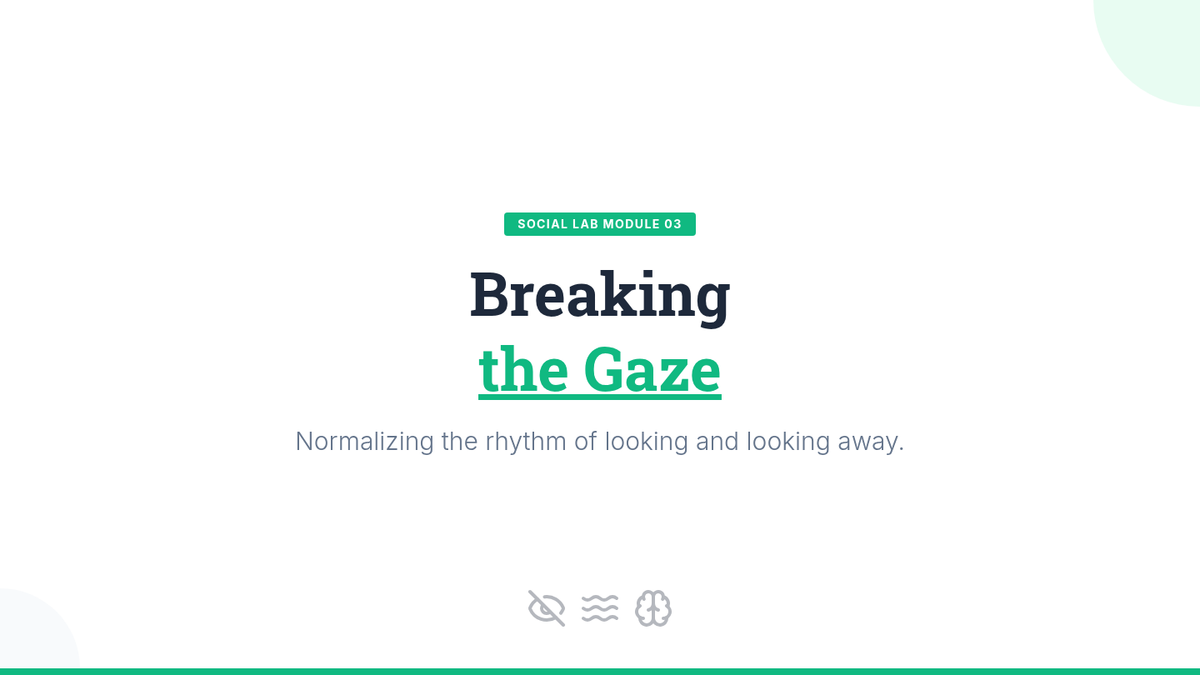 A comprehensive 5-lesson sequence for 8th-grade social communication, focusing on the nuances of gaze modulation, reducing anxiety through specific techniques, and understanding the social purpose of eye contact.