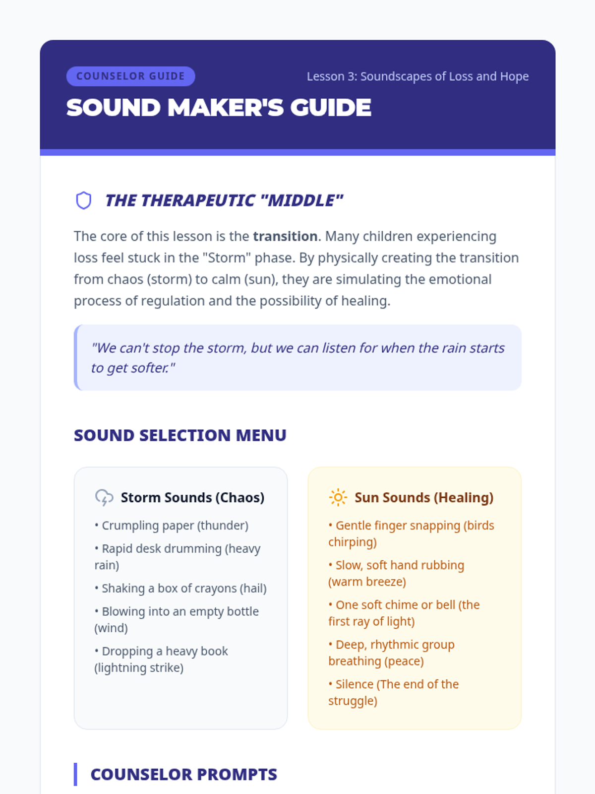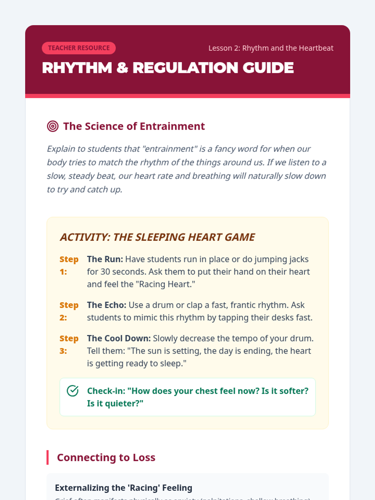 This sequence explores the connection between sound, music, and mood regulation for students experiencing loss. Students learn to identify how different tempos and tones mirror internal states and discover how to use sound to soothe themselves and express difficult feelings.