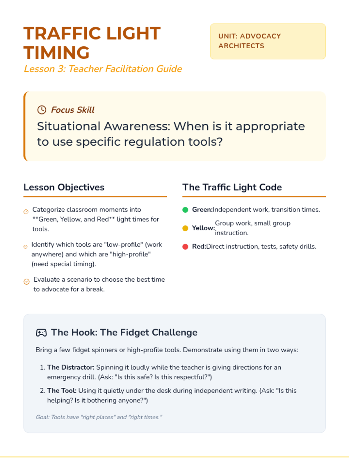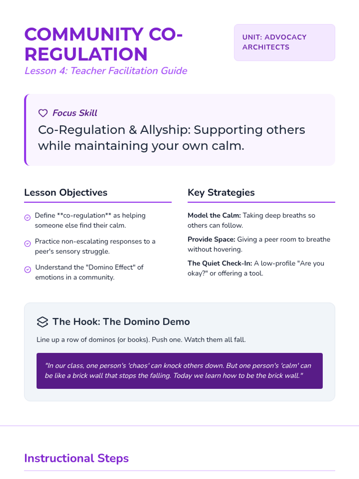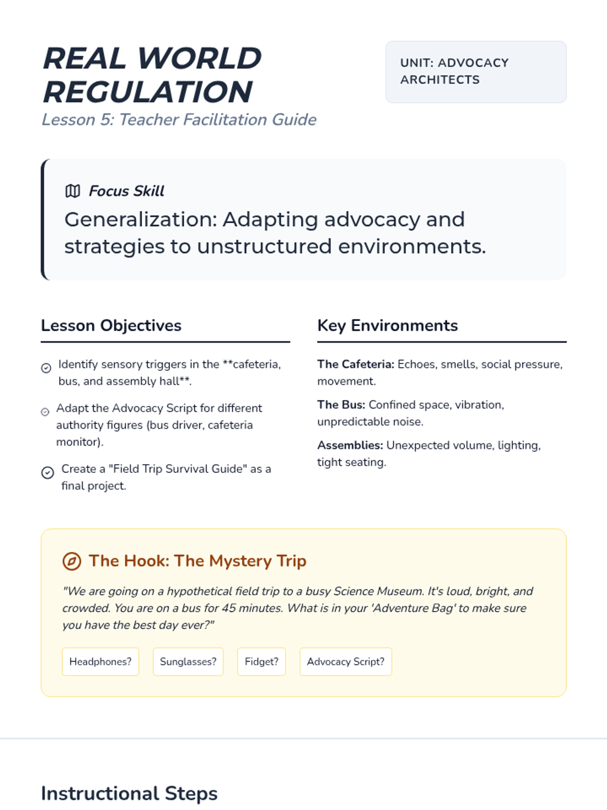 A 5-lesson sequence for 5th graders focused on applying sensory regulation strategies and practicing self-advocacy within a community. Students move from understanding diverse needs to mastering respectful communication and adapting their routines to real-world scenarios.