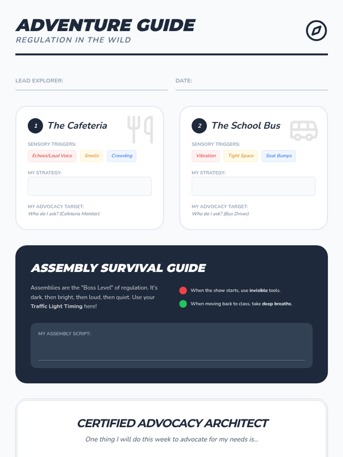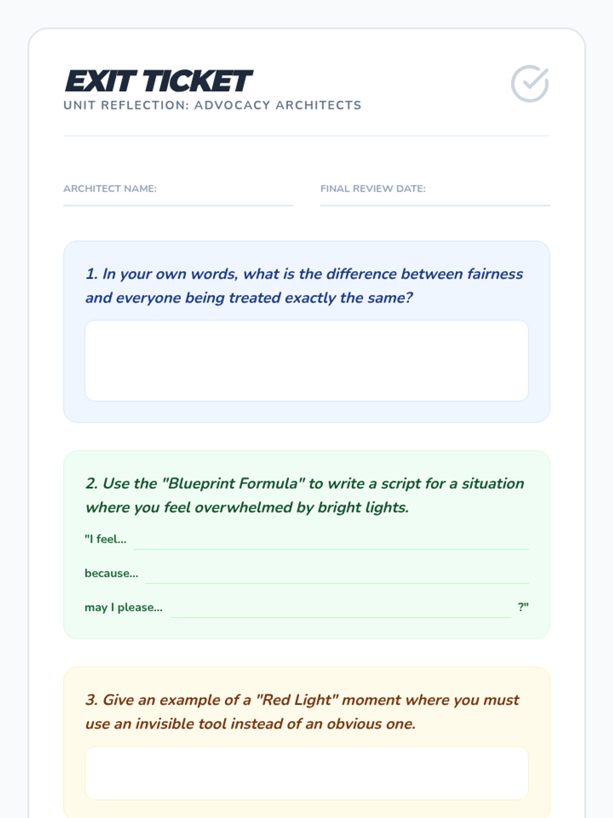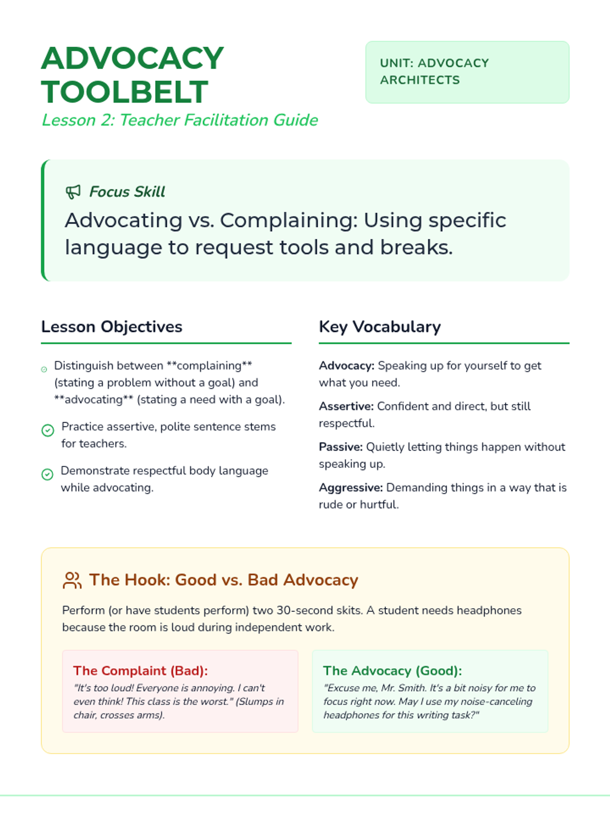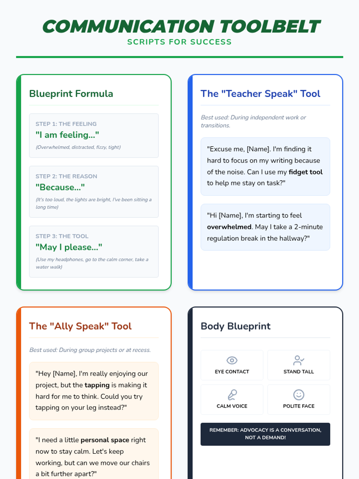 A 5-lesson sequence for 5th graders focused on applying sensory regulation strategies and practicing self-advocacy within a community. Students move from understanding diverse needs to mastering respectful communication and adapting their routines to real-world scenarios.