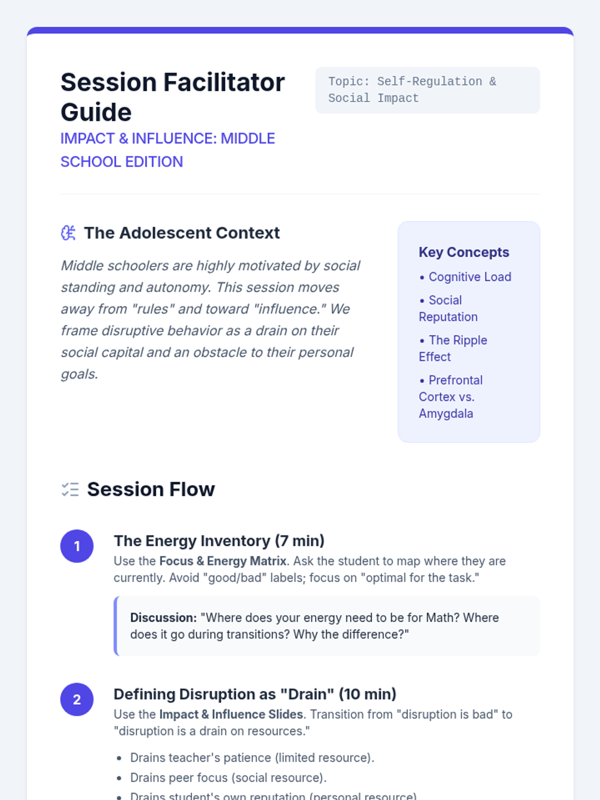 A 6-week social-emotional learning program designed specifically for 6th-grade boys. The sequence focuses on transitioning to middle school, emotional regulation, healthy friendships, communication, conflict resolution, and positive self-identity through a 'survival guide' lens.