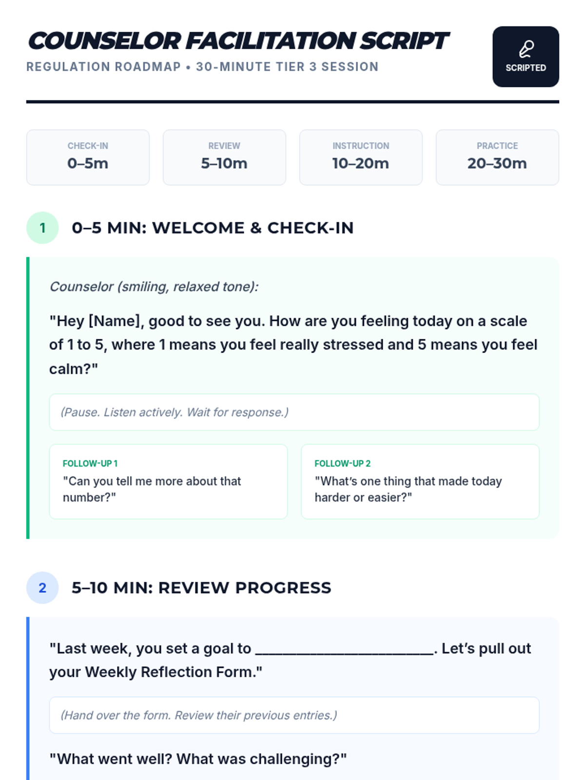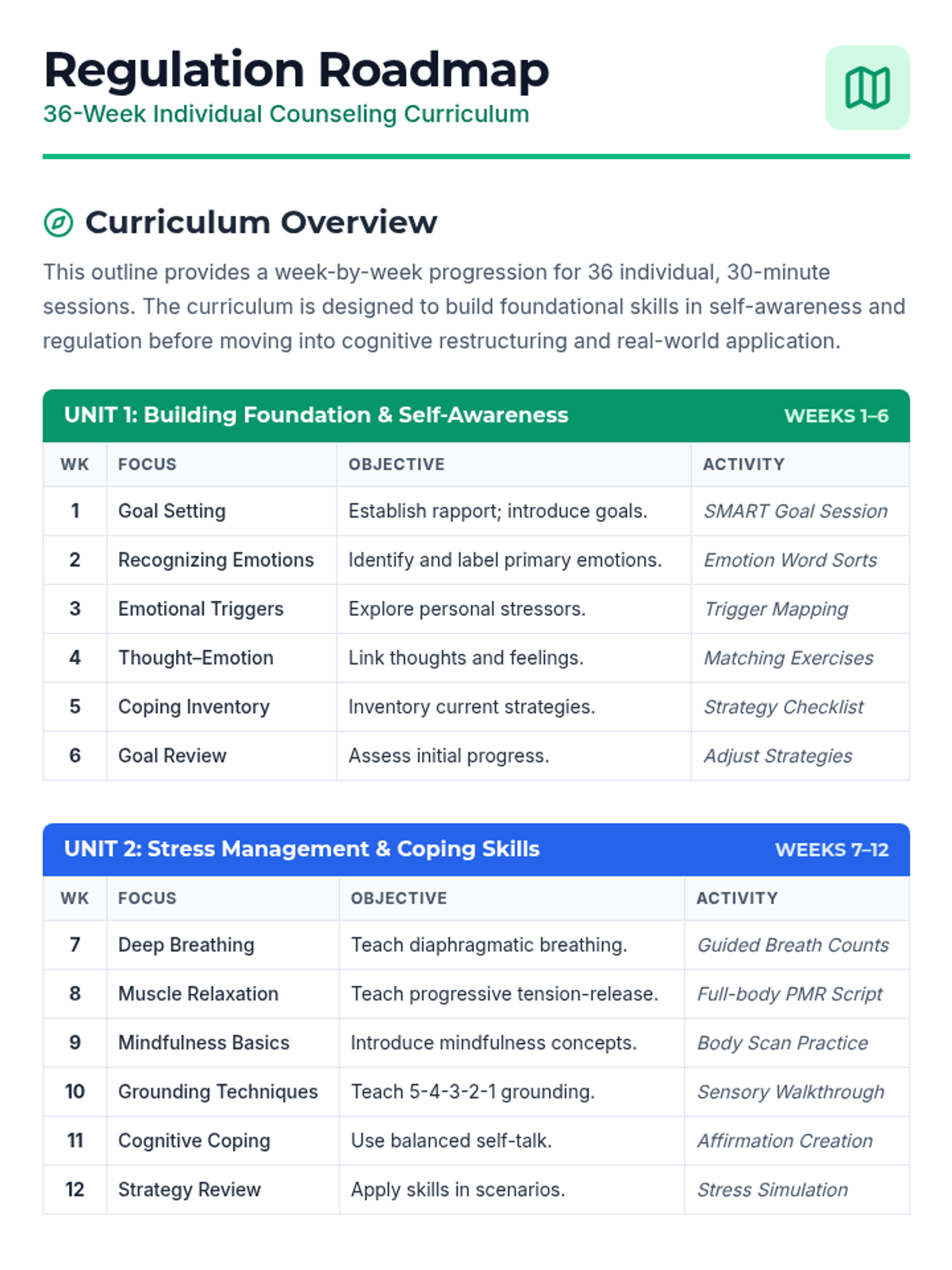 A comprehensive 36-week individual counseling curriculum designed for 9th-grade students needing Tier 3 behavioral and emotional support. The program focuses on self-awareness, stress management, cognitive restructuring, and long-term resilience through structured 30-minute sessions.