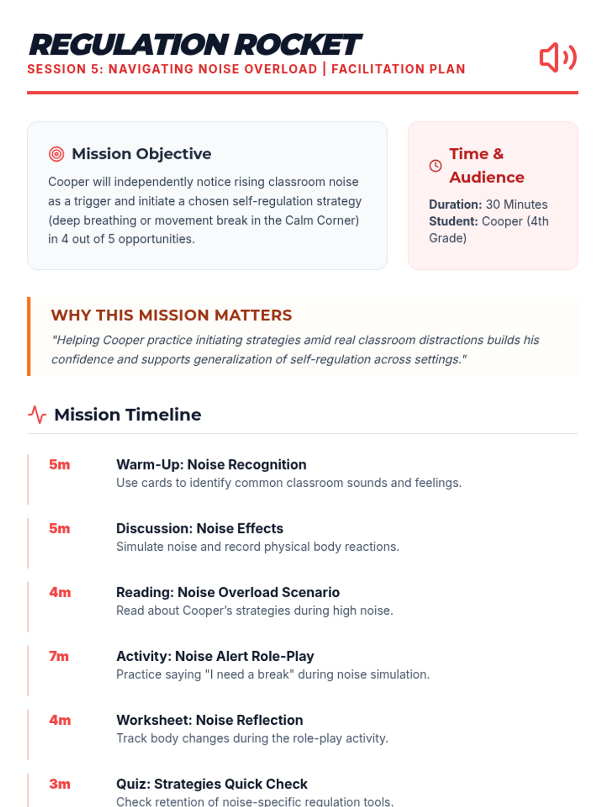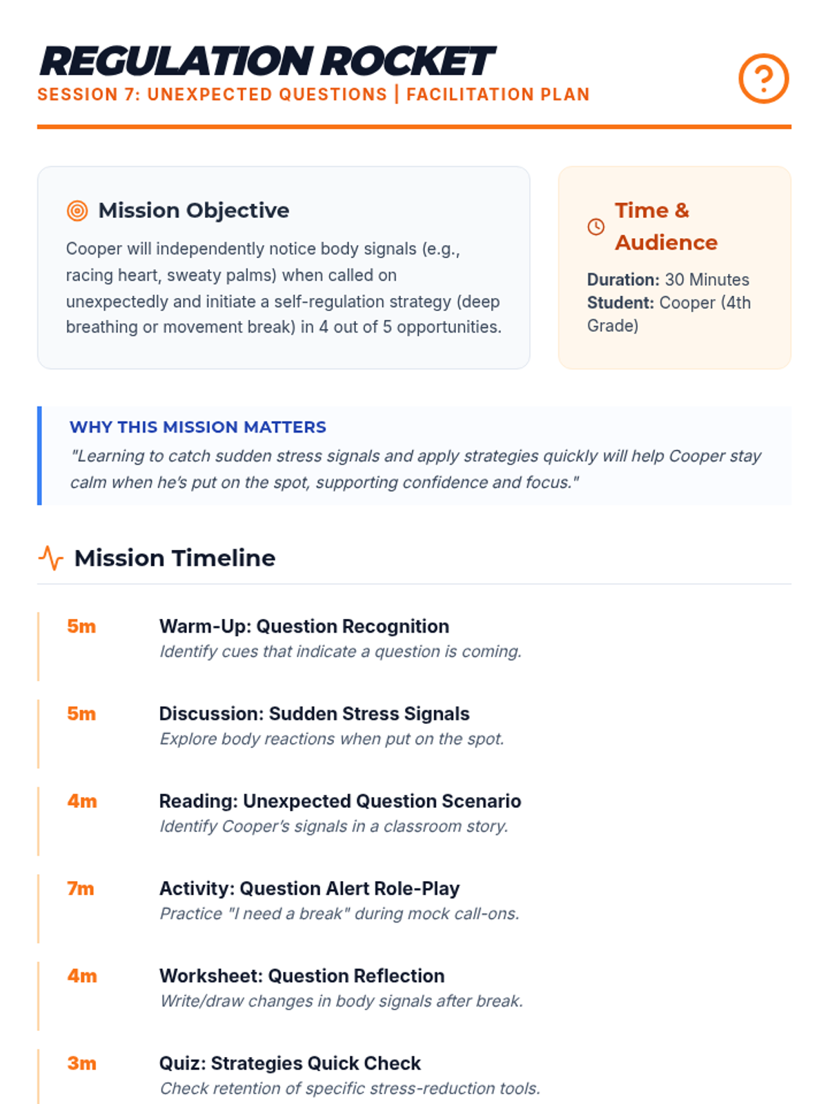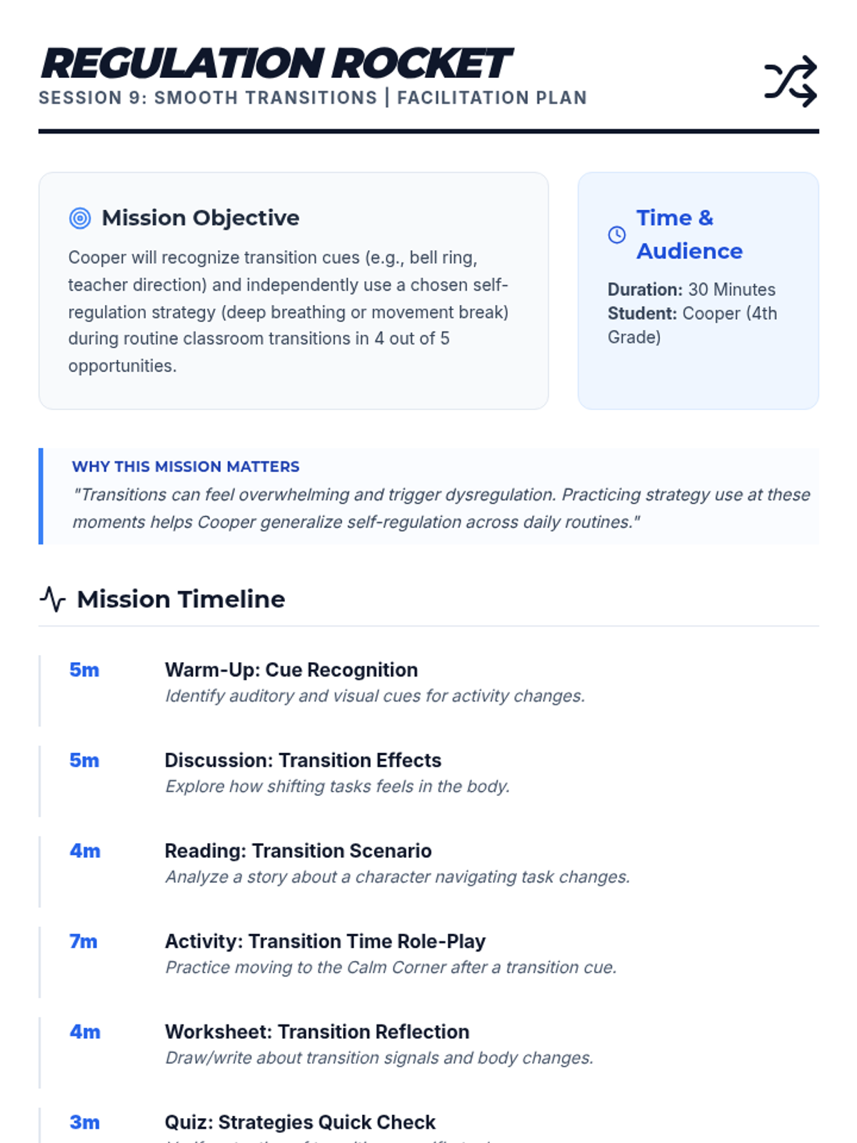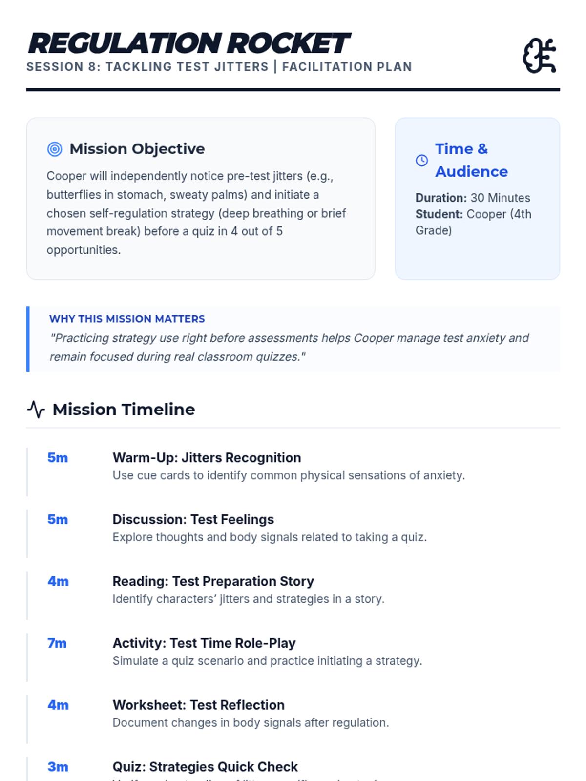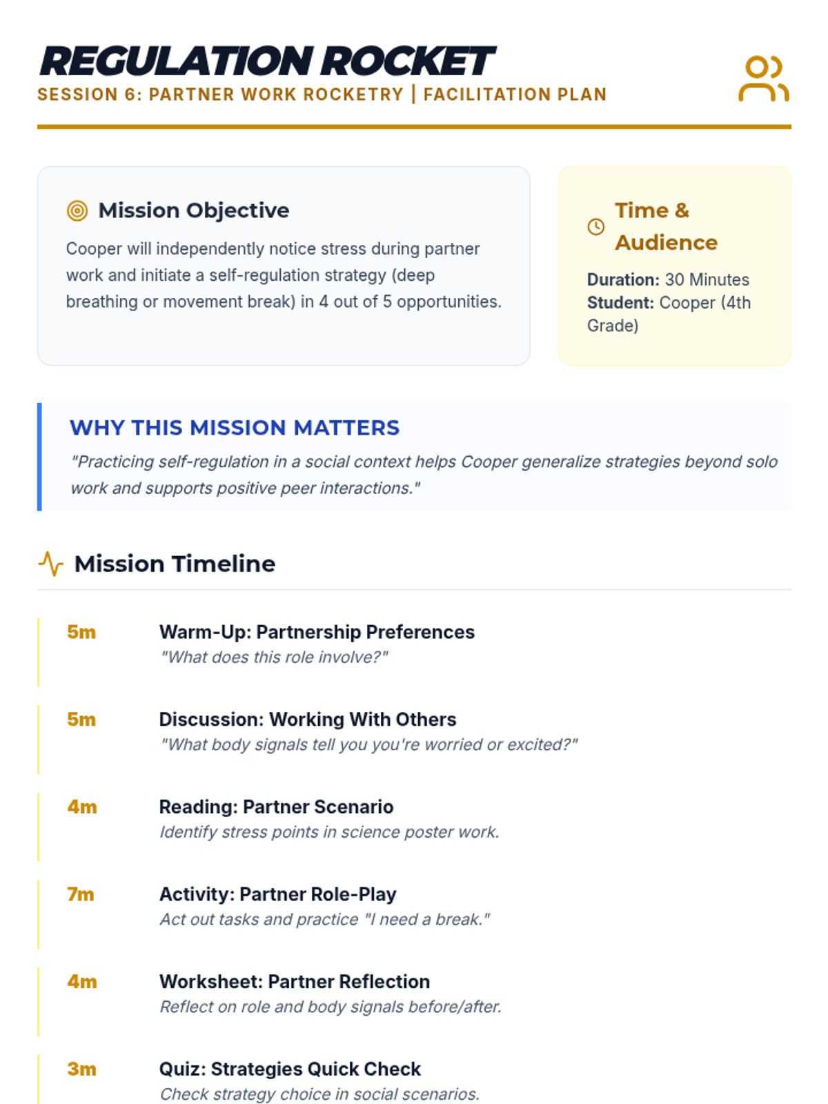 A 10-session social-emotional learning unit for an individual 4th grade student with ASD to master identifying emotions, recognizing dysregulation, and applying self-regulation strategies independently. The unit follows a "Regulation Rocket" mission theme to build self-awareness and coping skills.