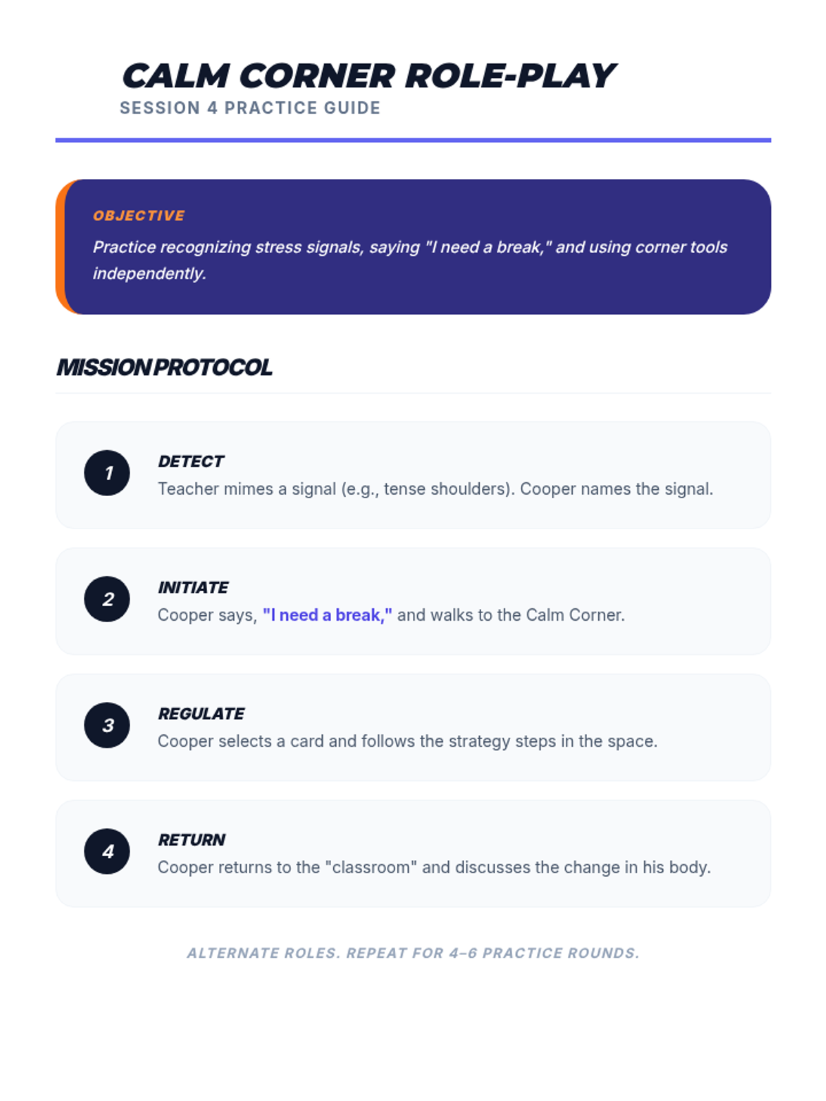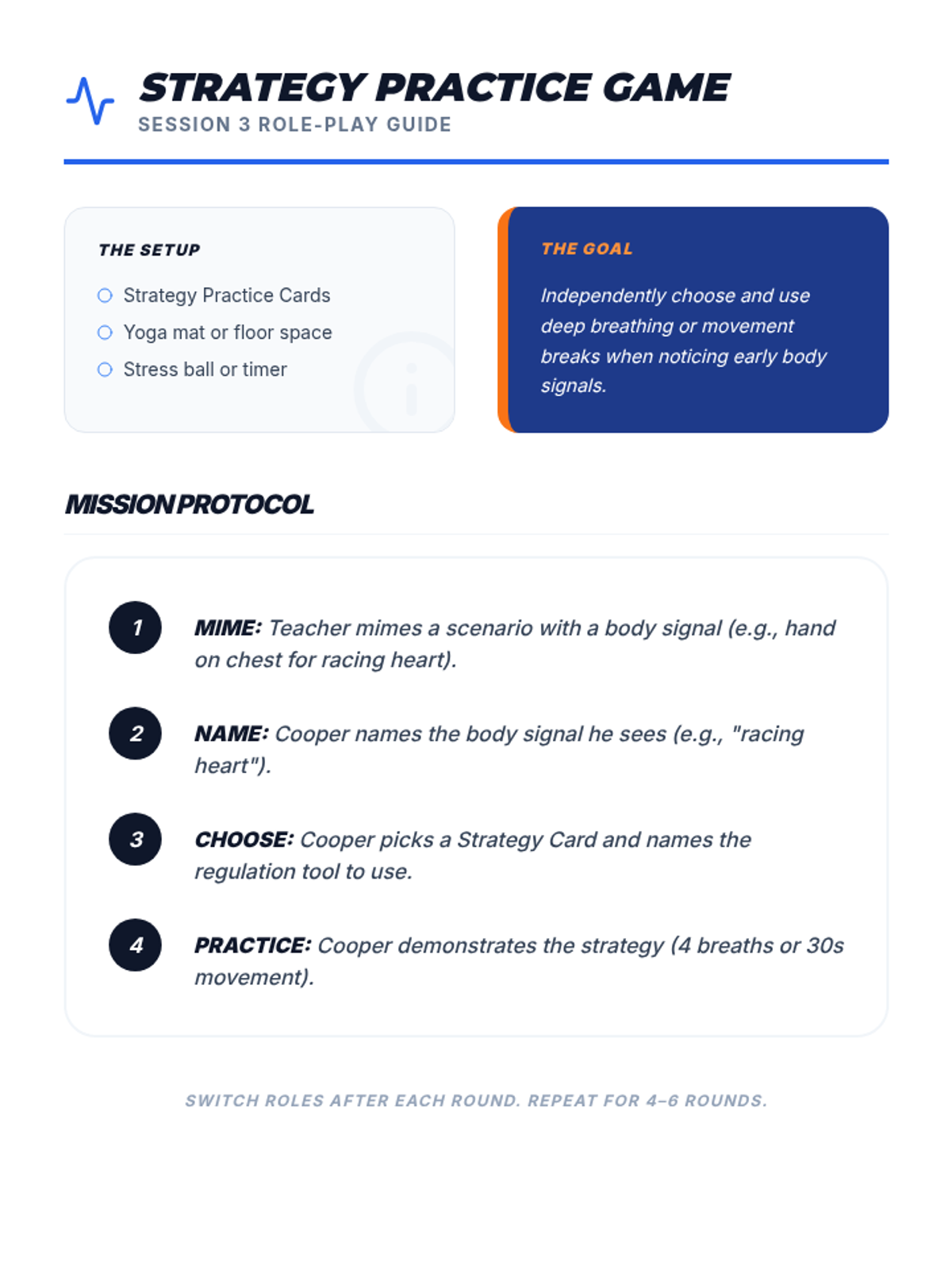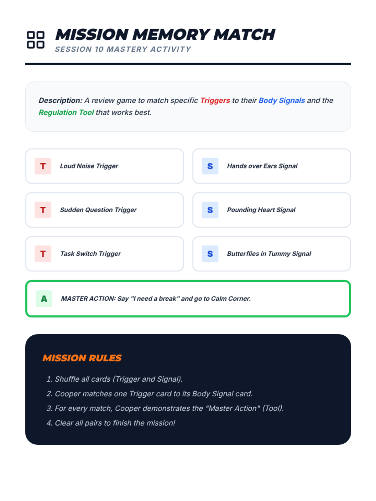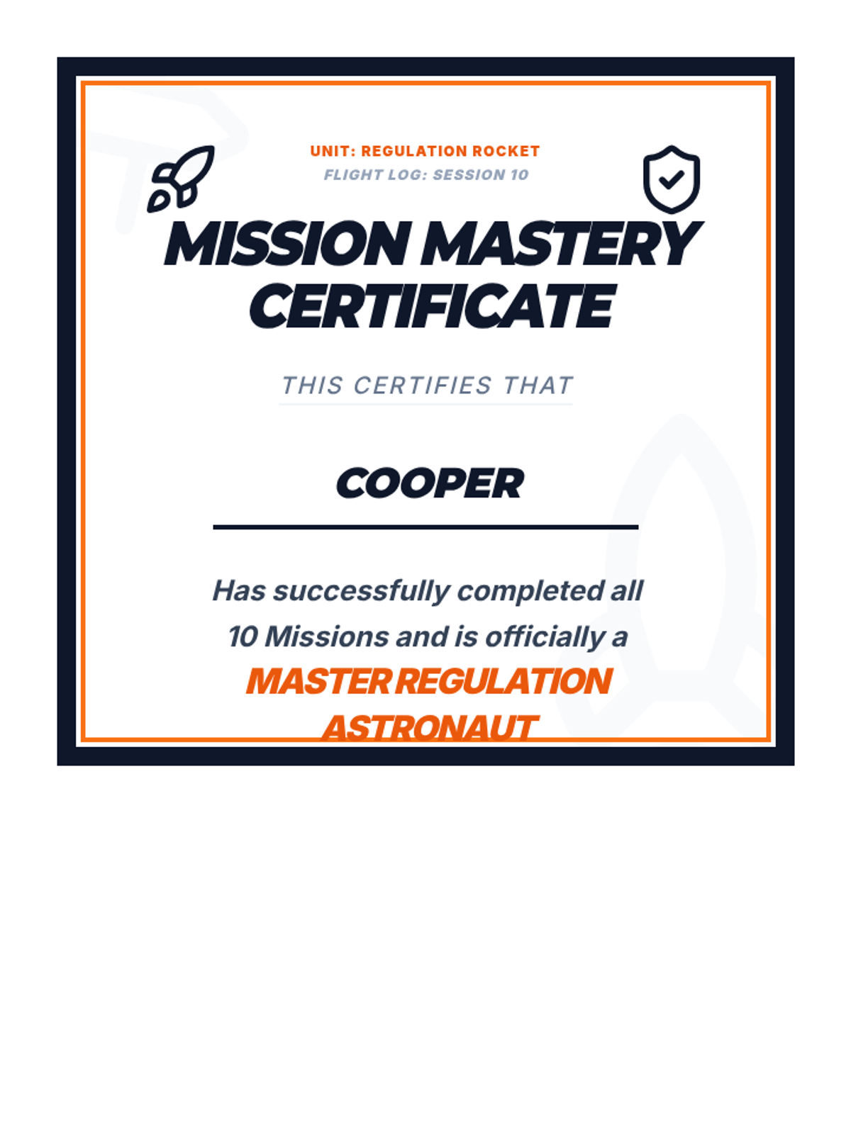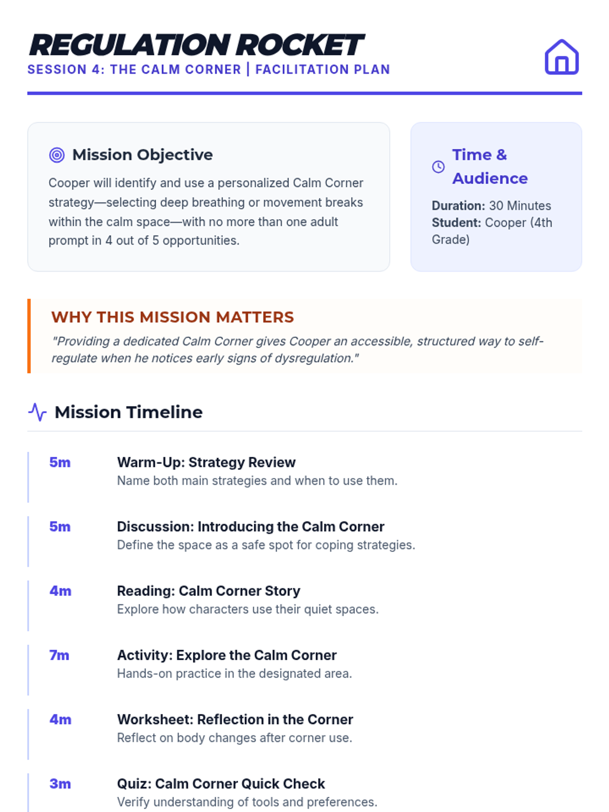 A 10-session social-emotional learning unit for an individual 4th grade student with ASD to master identifying emotions, recognizing dysregulation, and applying self-regulation strategies independently. The unit follows a "Regulation Rocket" mission theme to build self-awareness and coping skills.