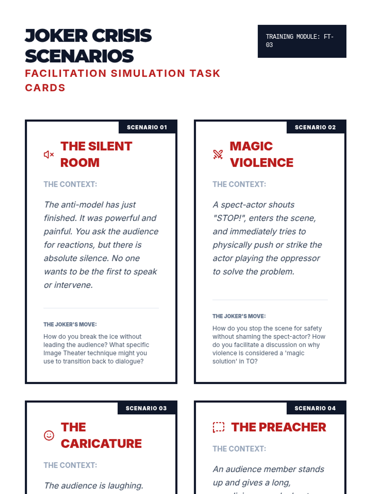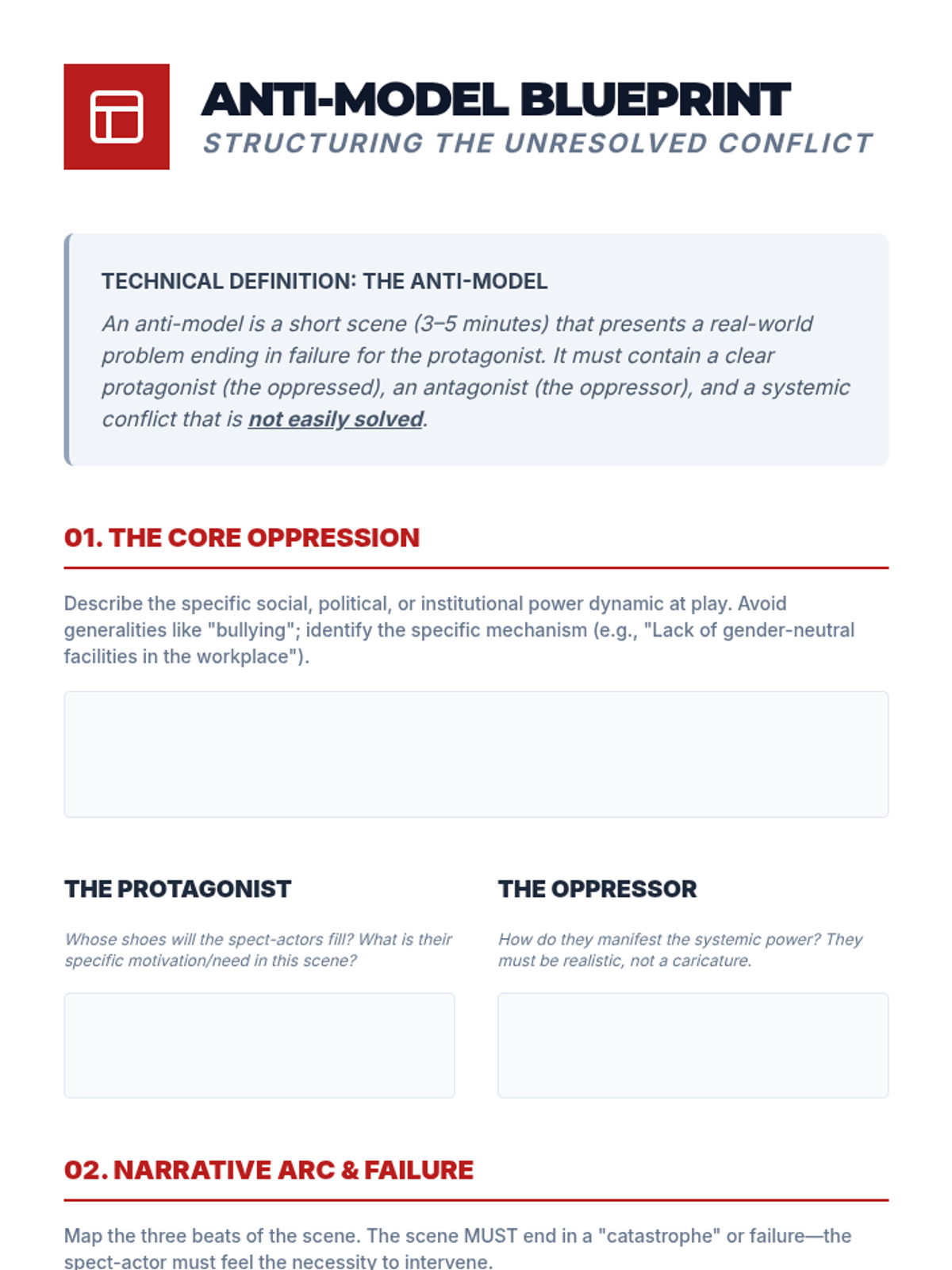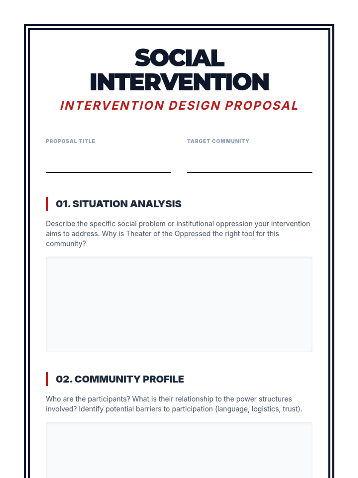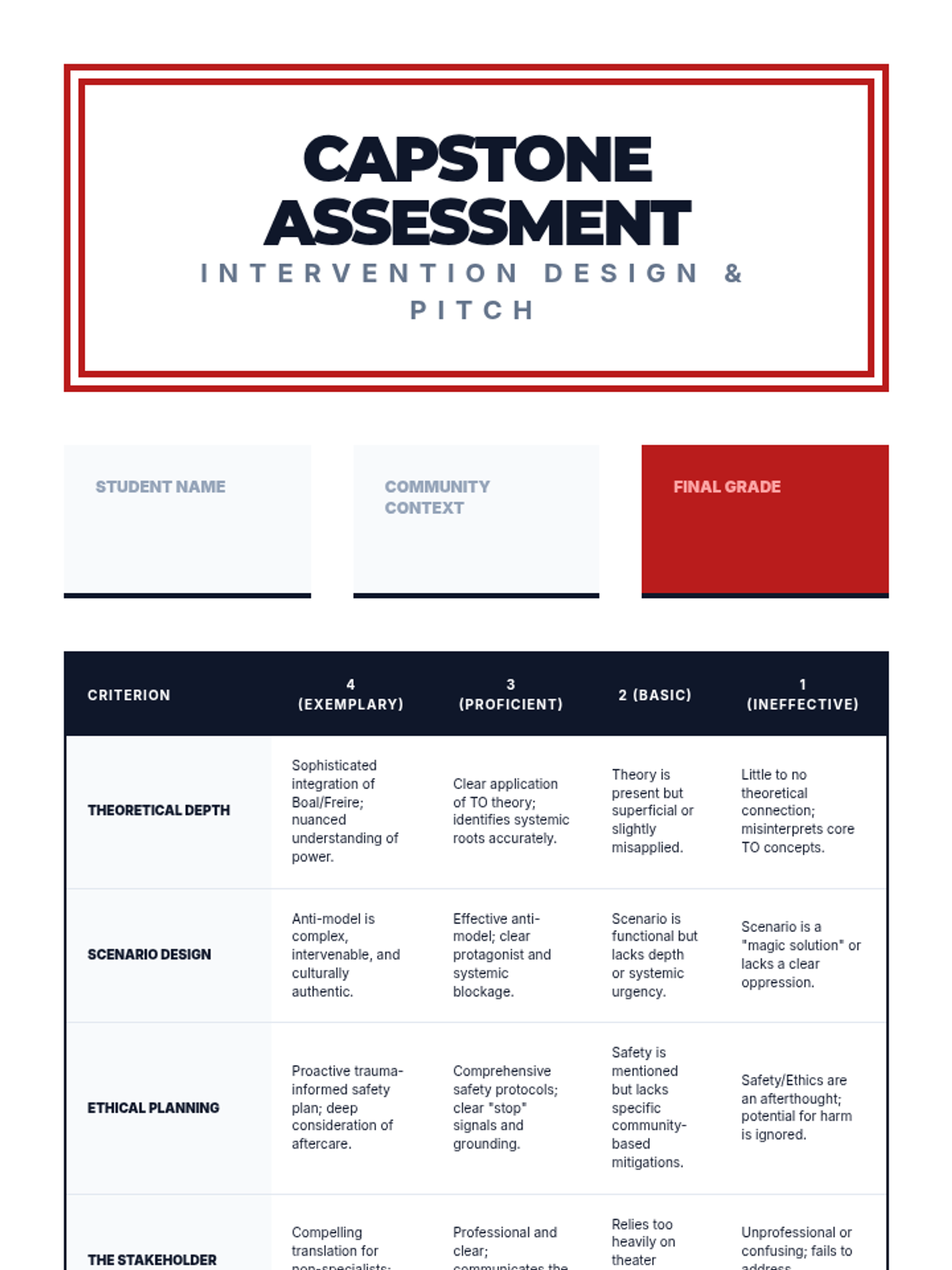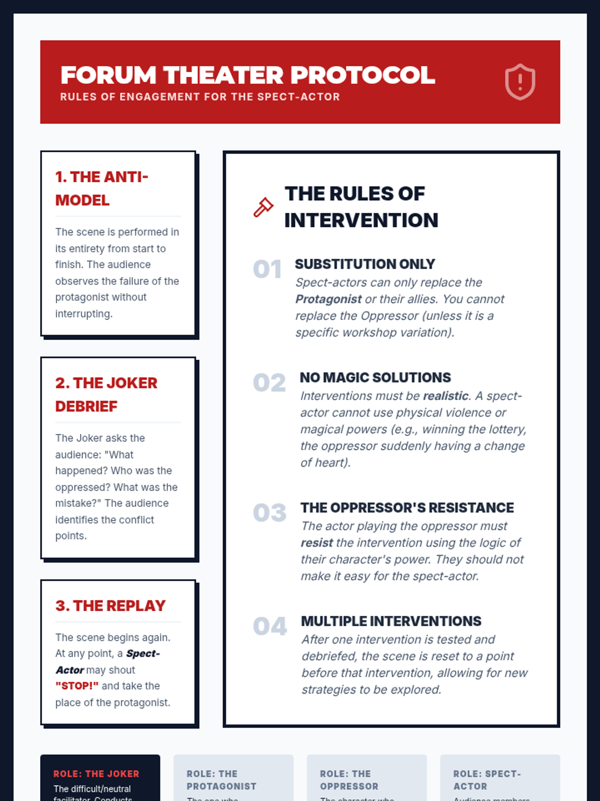 This graduate sequence explores Augusto Boal's Theater of the Oppressed, training students in the theoretical, physical, and ethical skills required to facilitate social change through dramatic play.