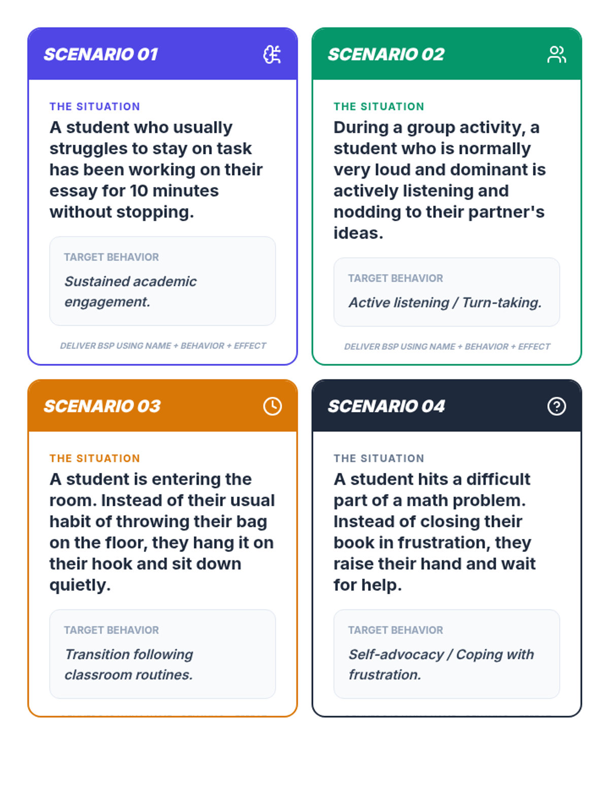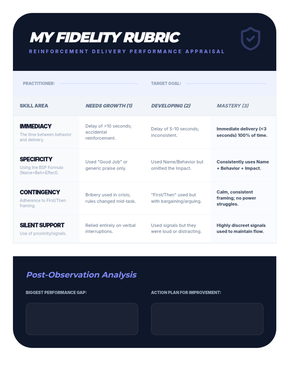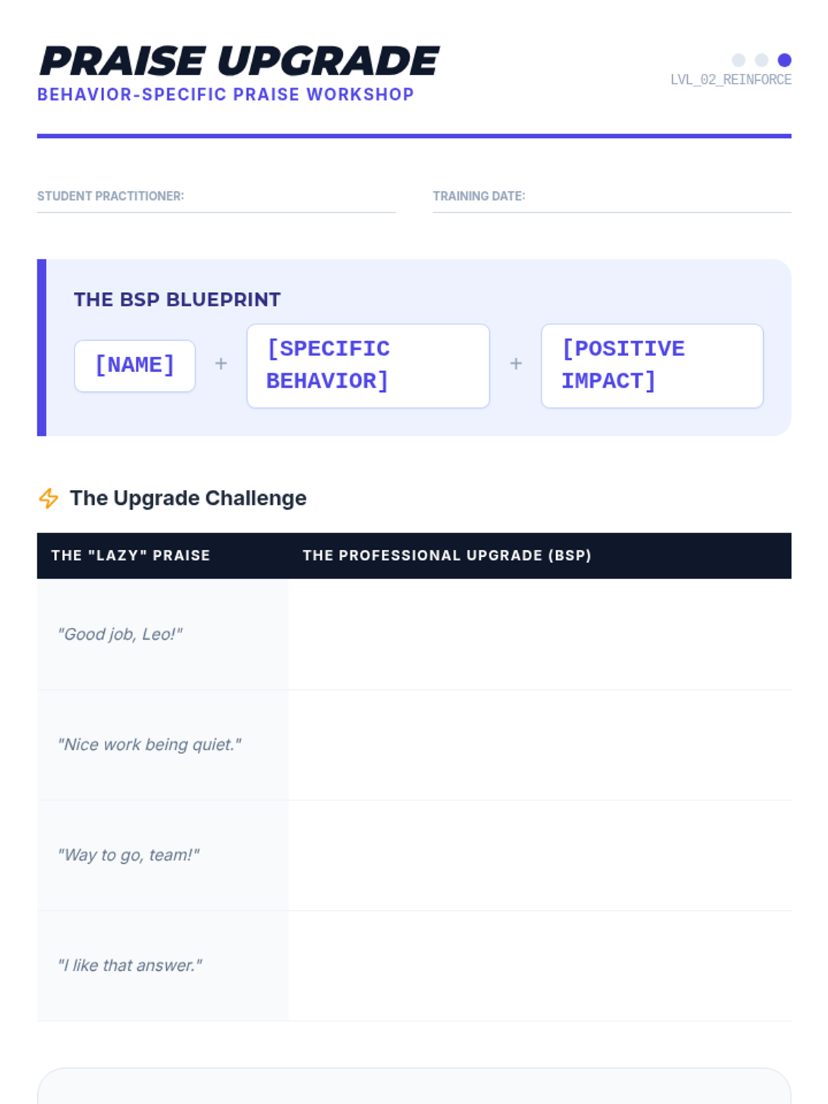 A comprehensive sequence for 12th graders focused on the precise mechanics of reinforcement delivery, including immediacy, behavior-specific praise, contingency framing, and non-verbal cues. Students move from theory to high-fidelity simulation and self-monitoring.