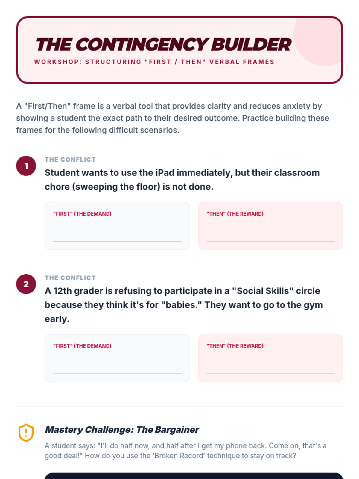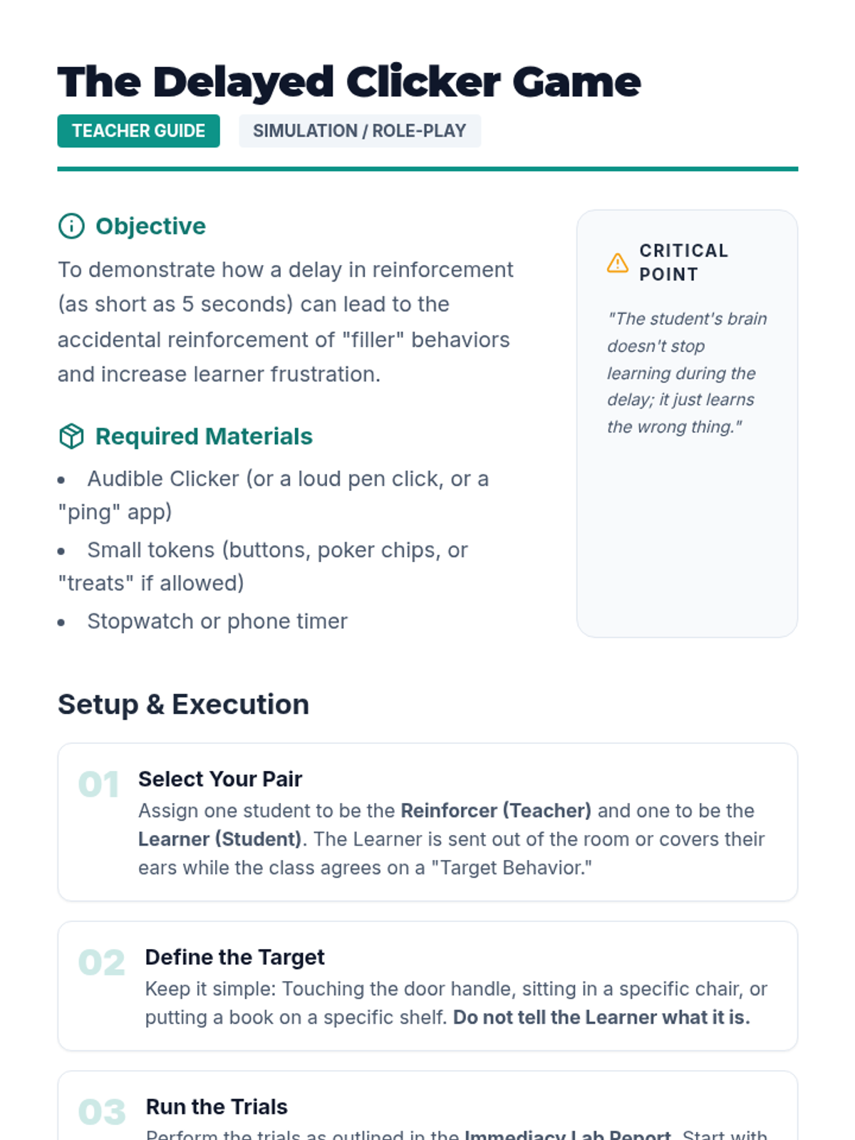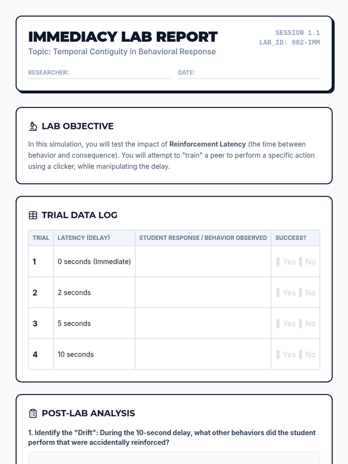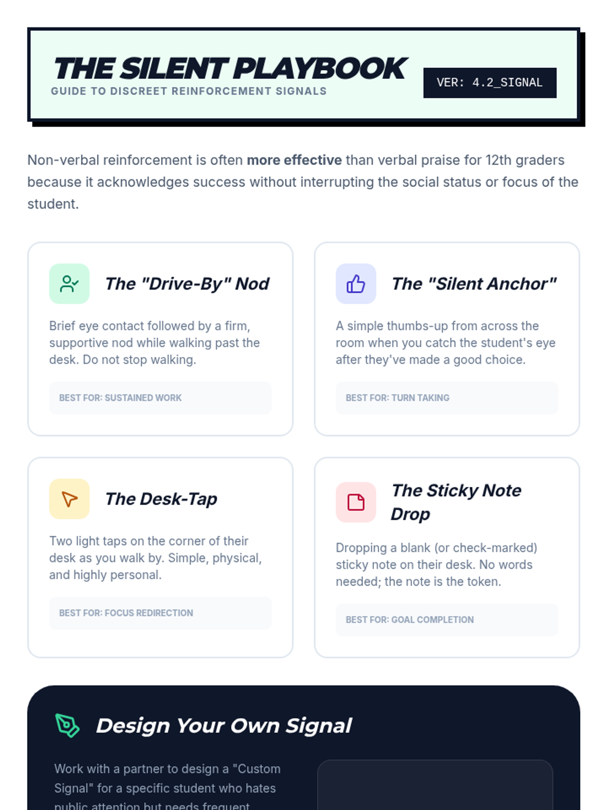 A comprehensive sequence for 12th graders focused on the precise mechanics of reinforcement delivery, including immediacy, behavior-specific praise, contingency framing, and non-verbal cues. Students move from theory to high-fidelity simulation and self-monitoring.