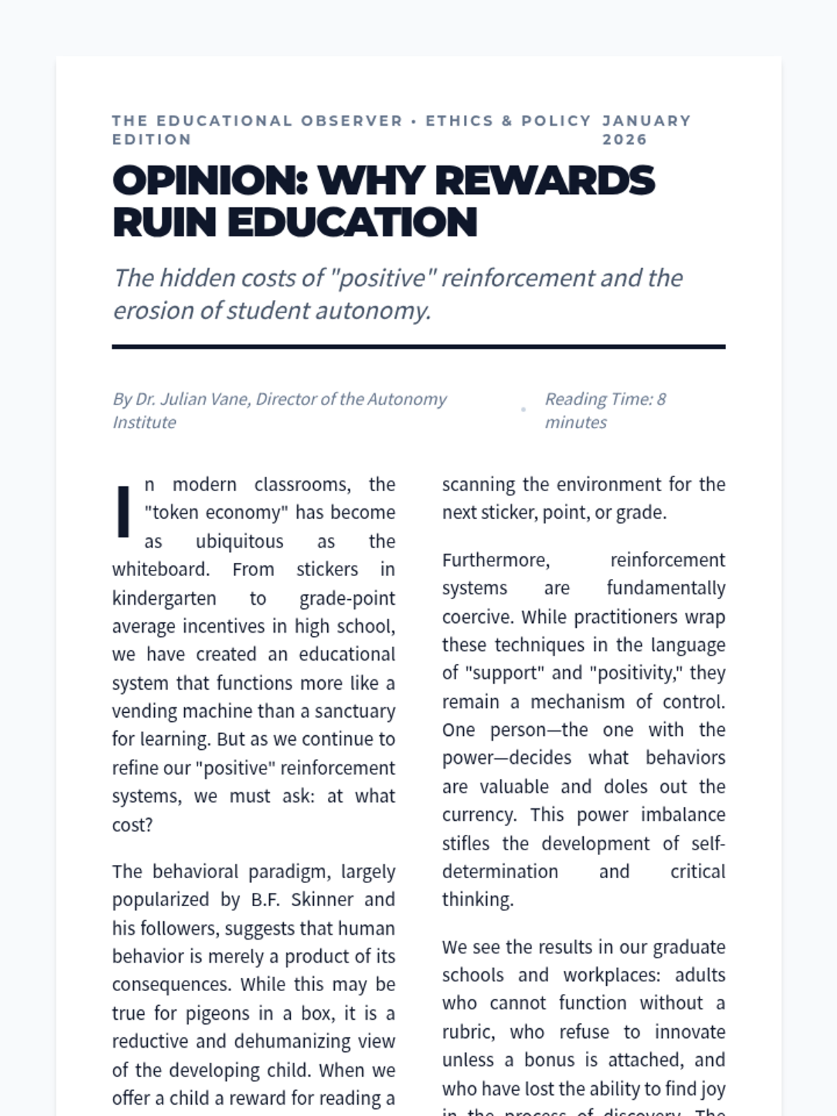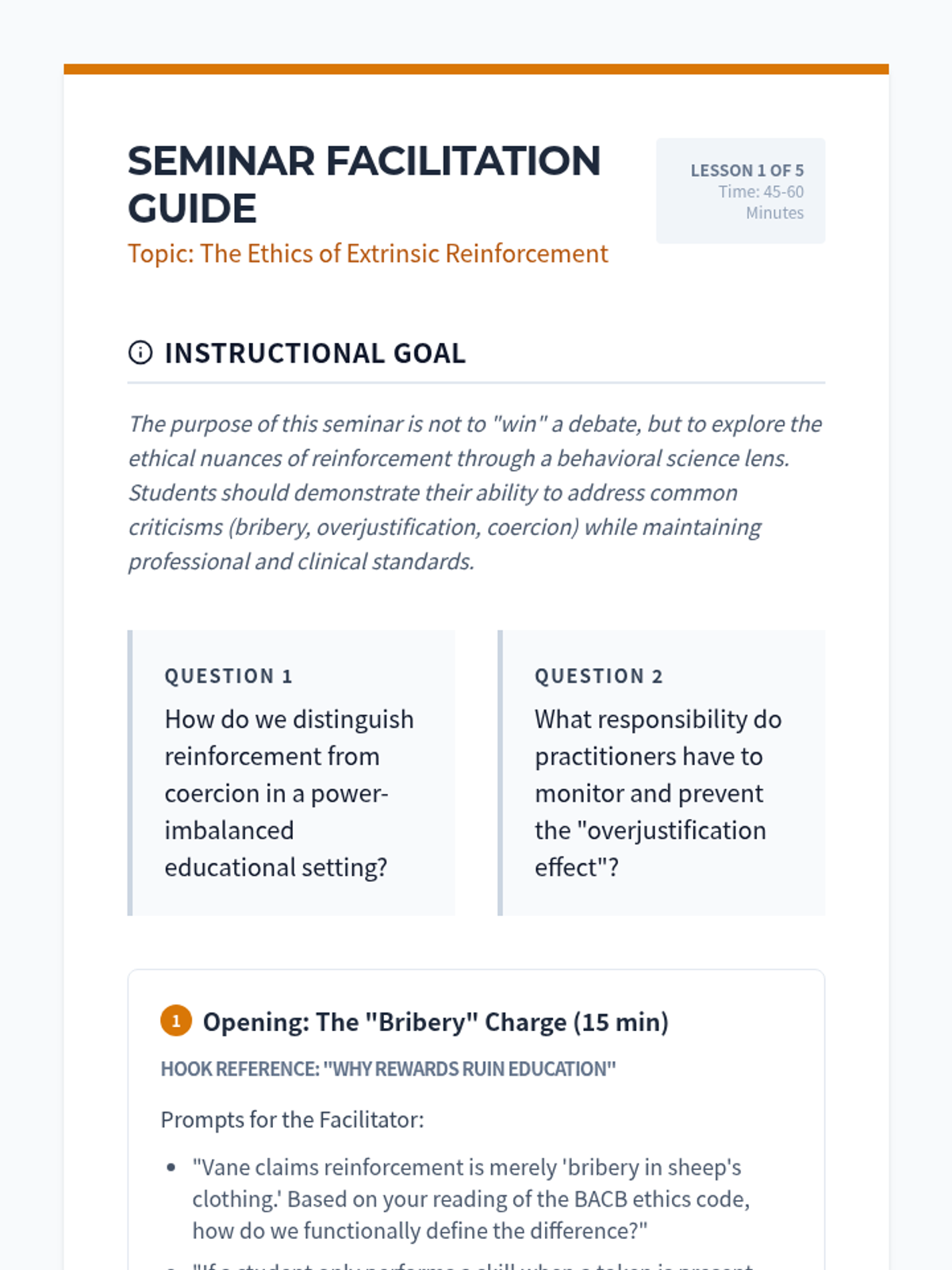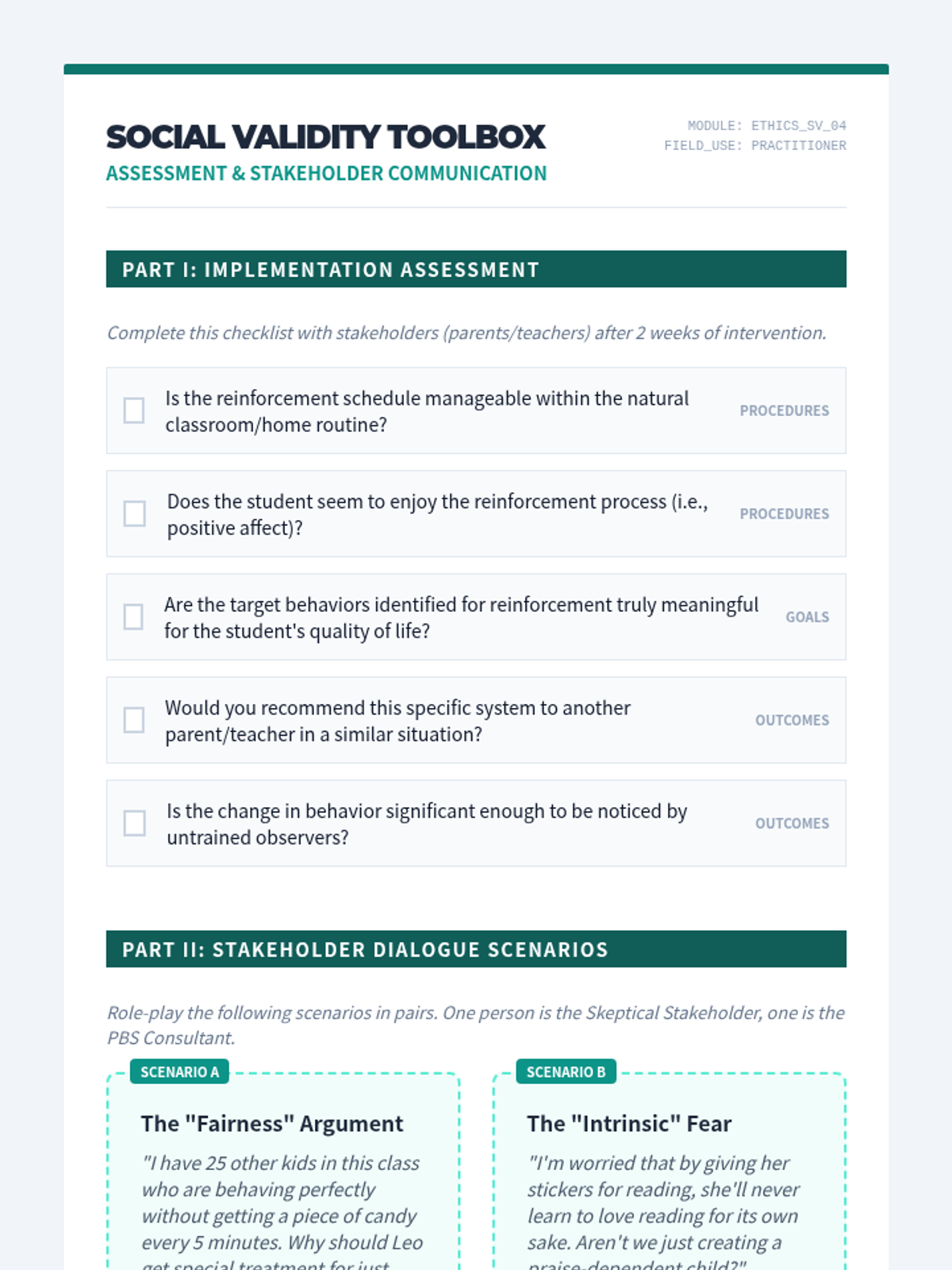 A seminar-style sequence for graduate students focusing on the ethical implementation, data-driven adjustment, and social validity of reinforcement systems in Positive Behavior Support. Students explore the 'bribery vs. reinforcement' debate, master visual analysis of single-subject data, and design transitions toward student independence.