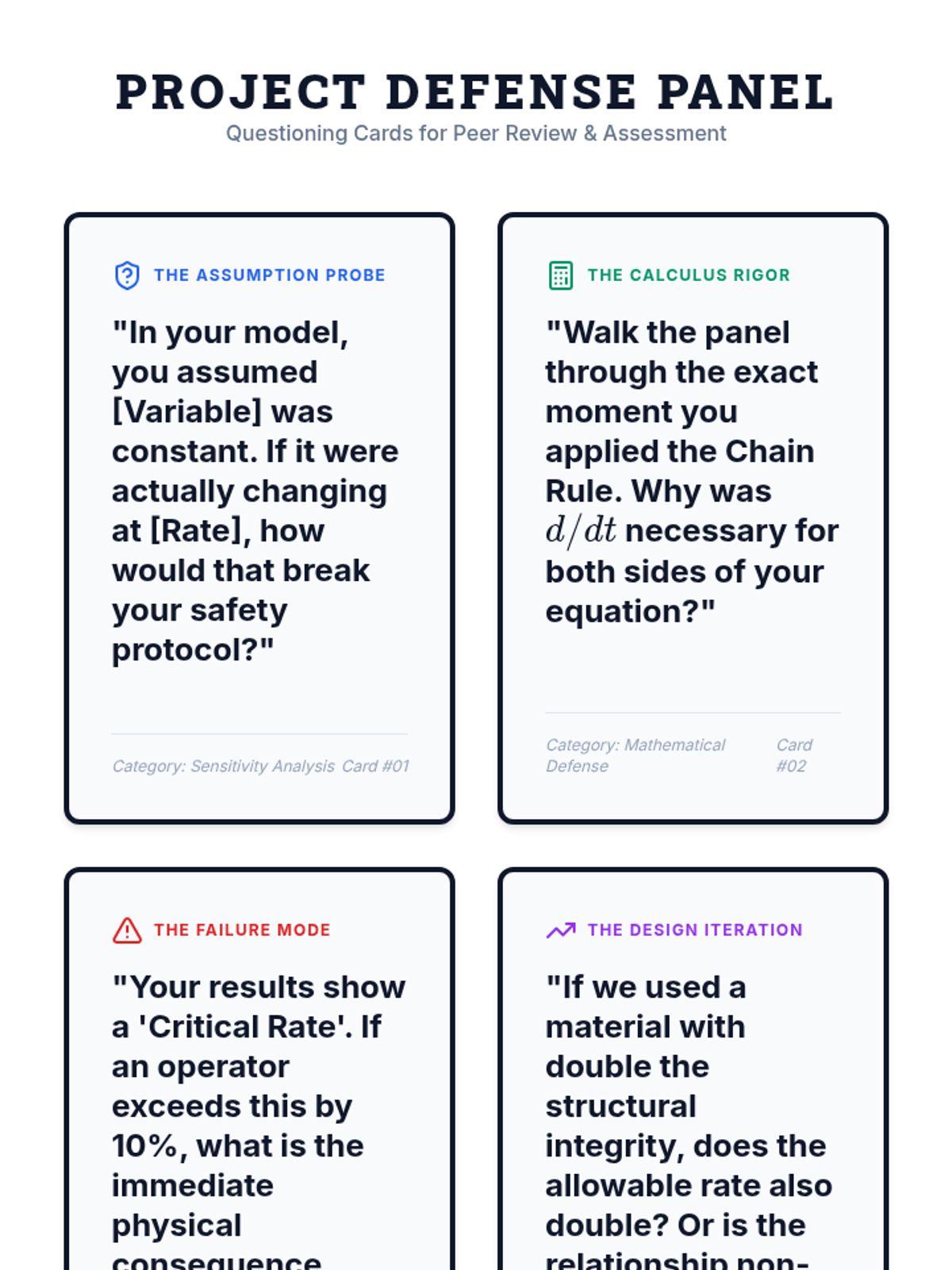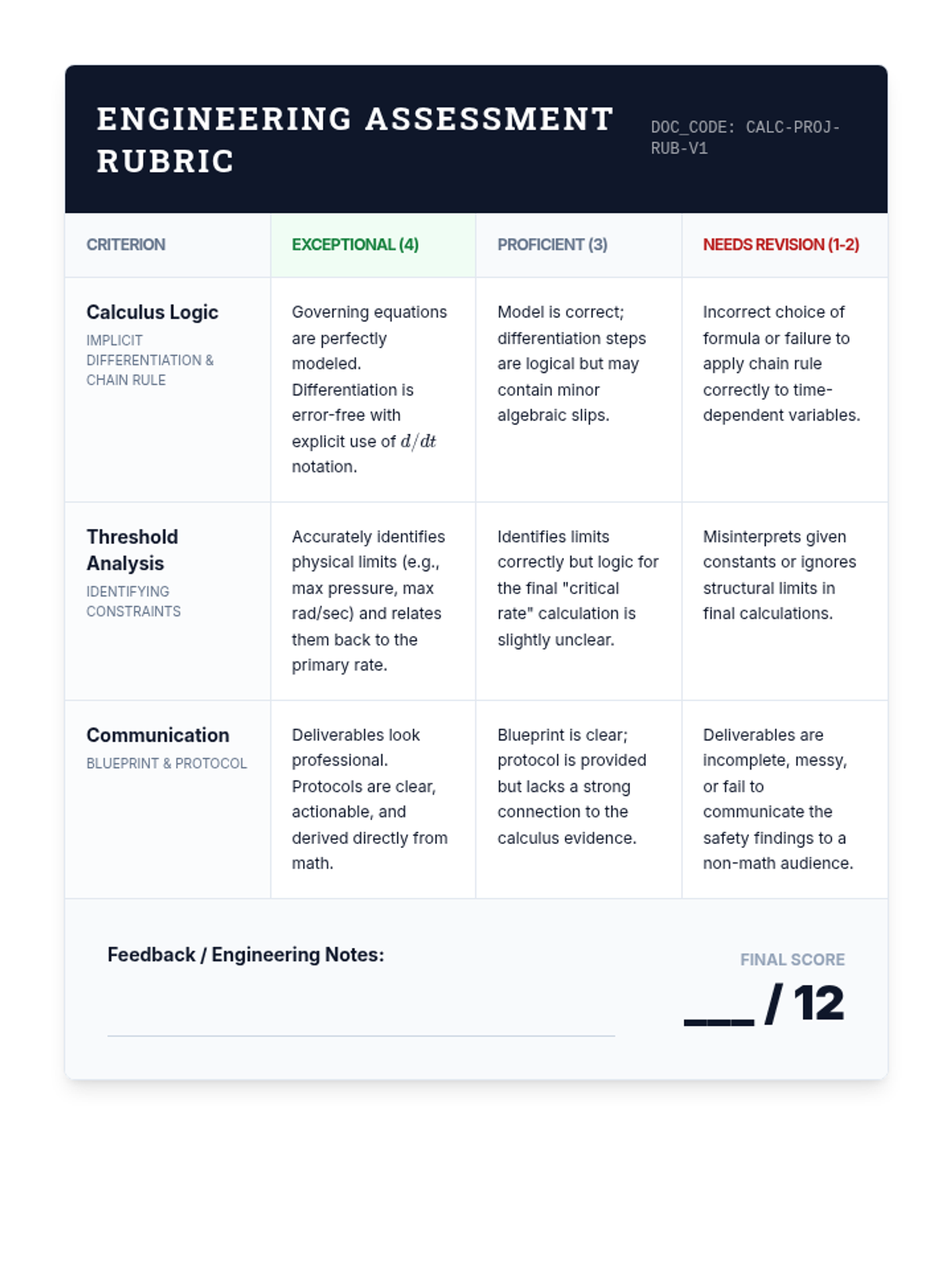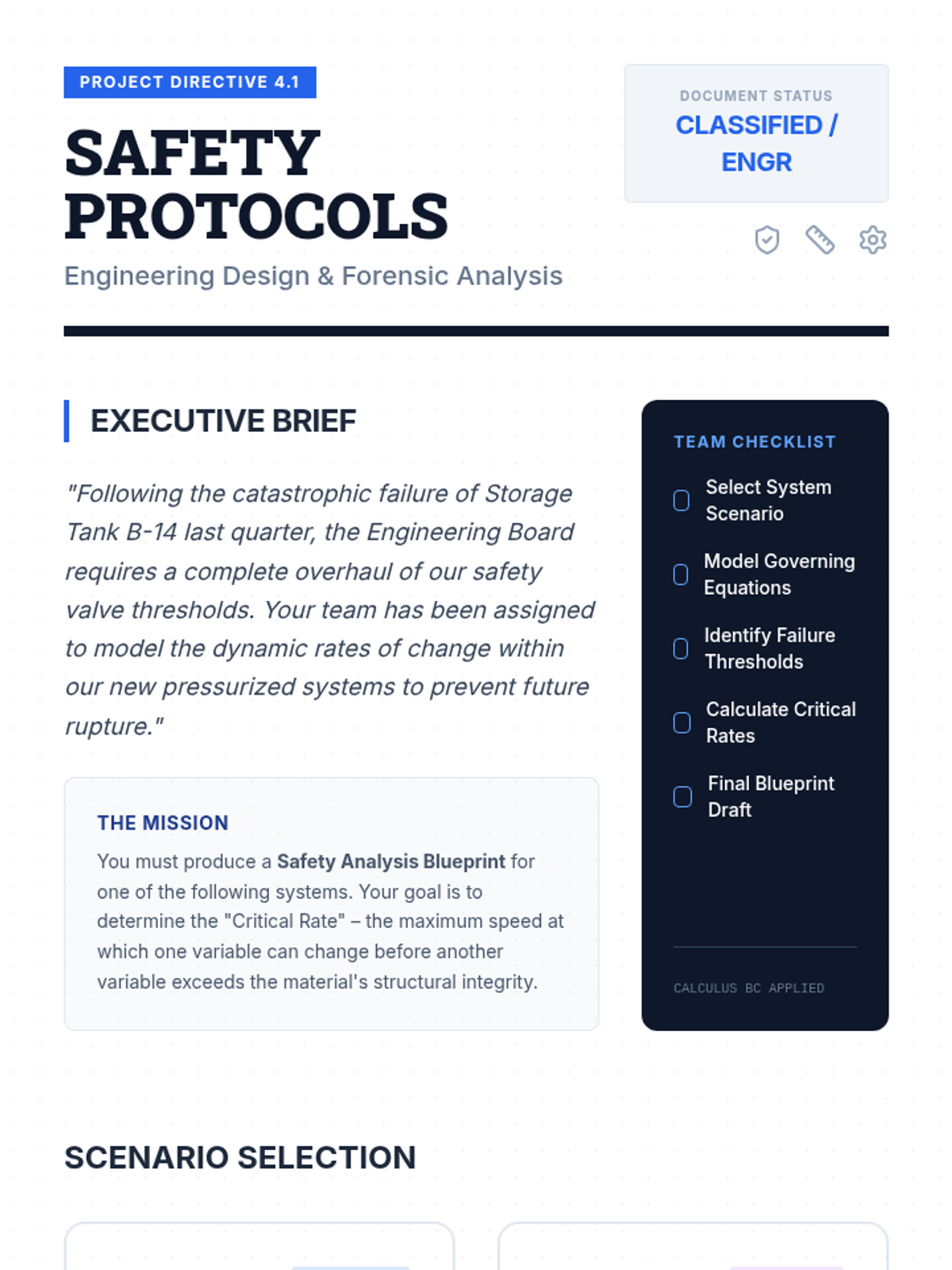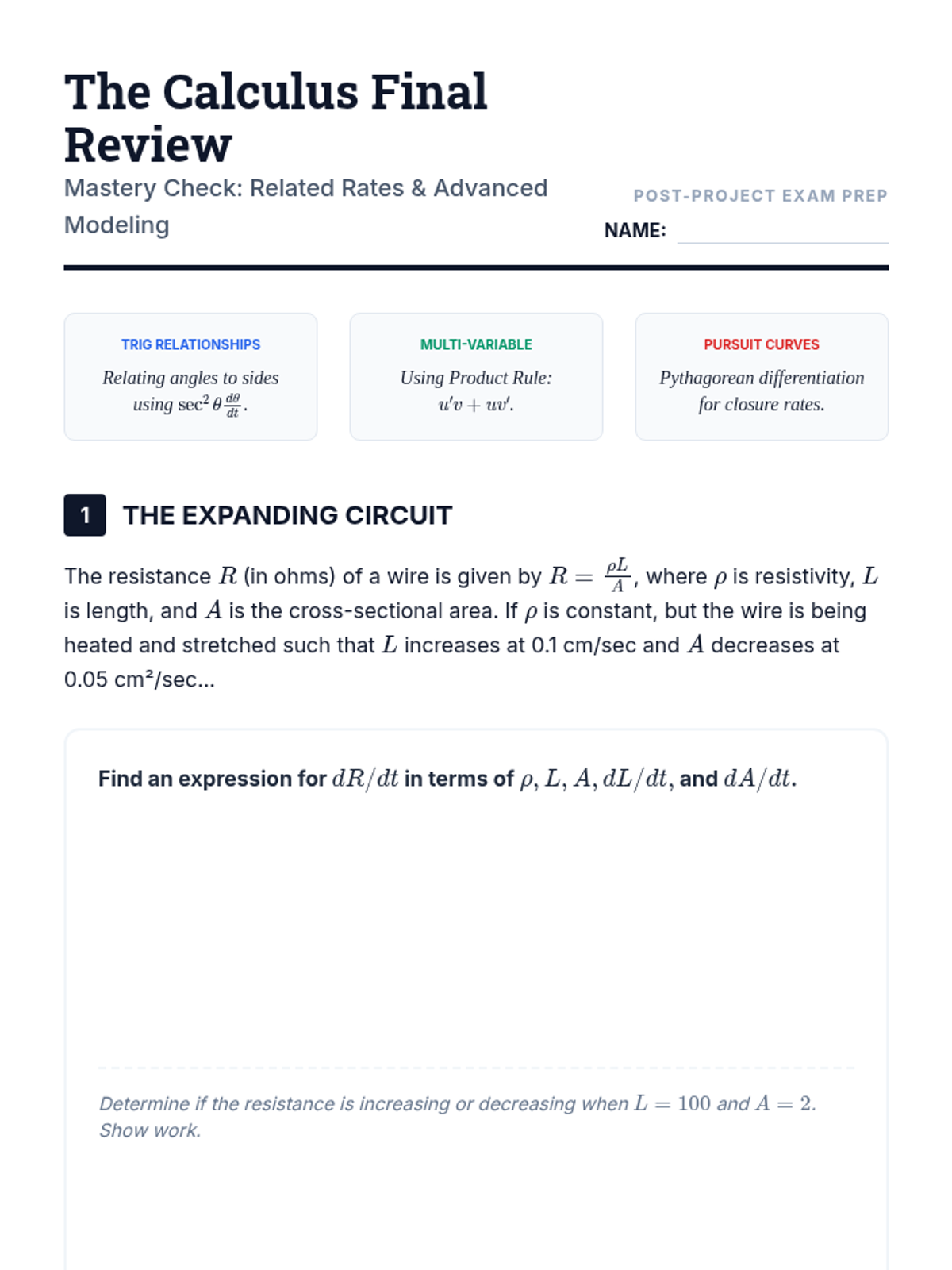 A high-level calculus sequence for 12th-grade students focused on related rates in complex physical and engineering contexts. Students explore trigonometric rates, multi-variable dependencies like the Ideal Gas Law, relative motion, and conclude with an engineering design project focused on safety protocols.