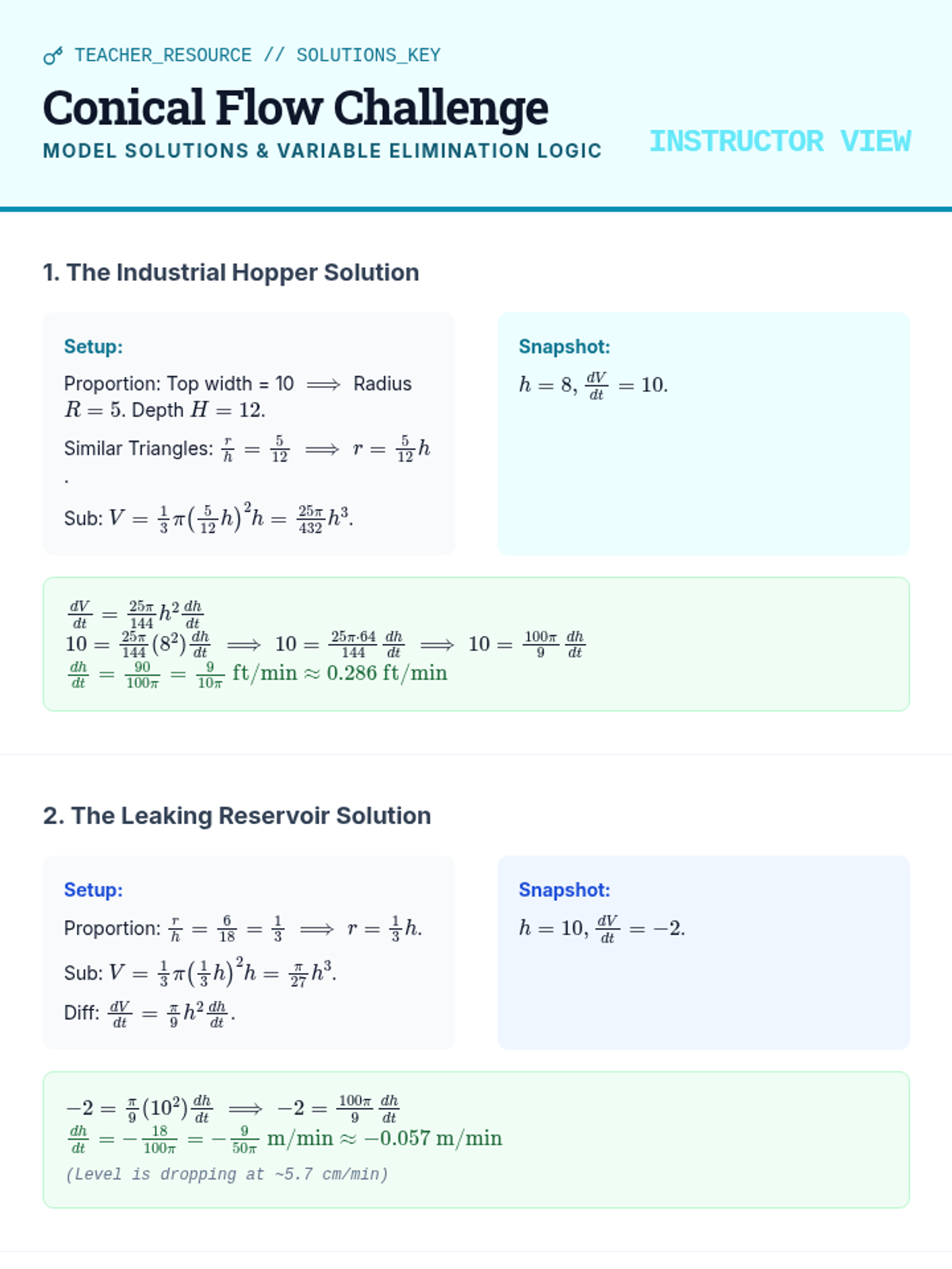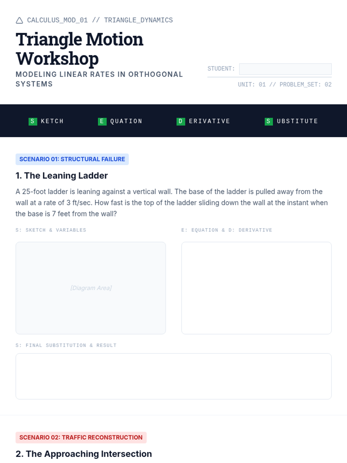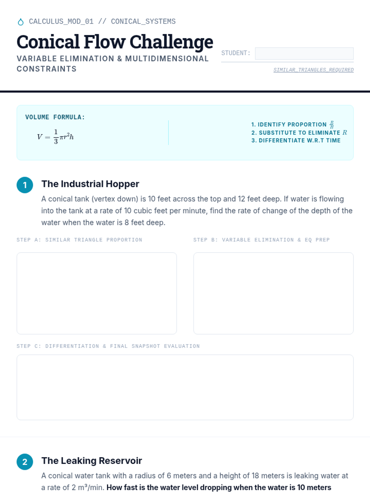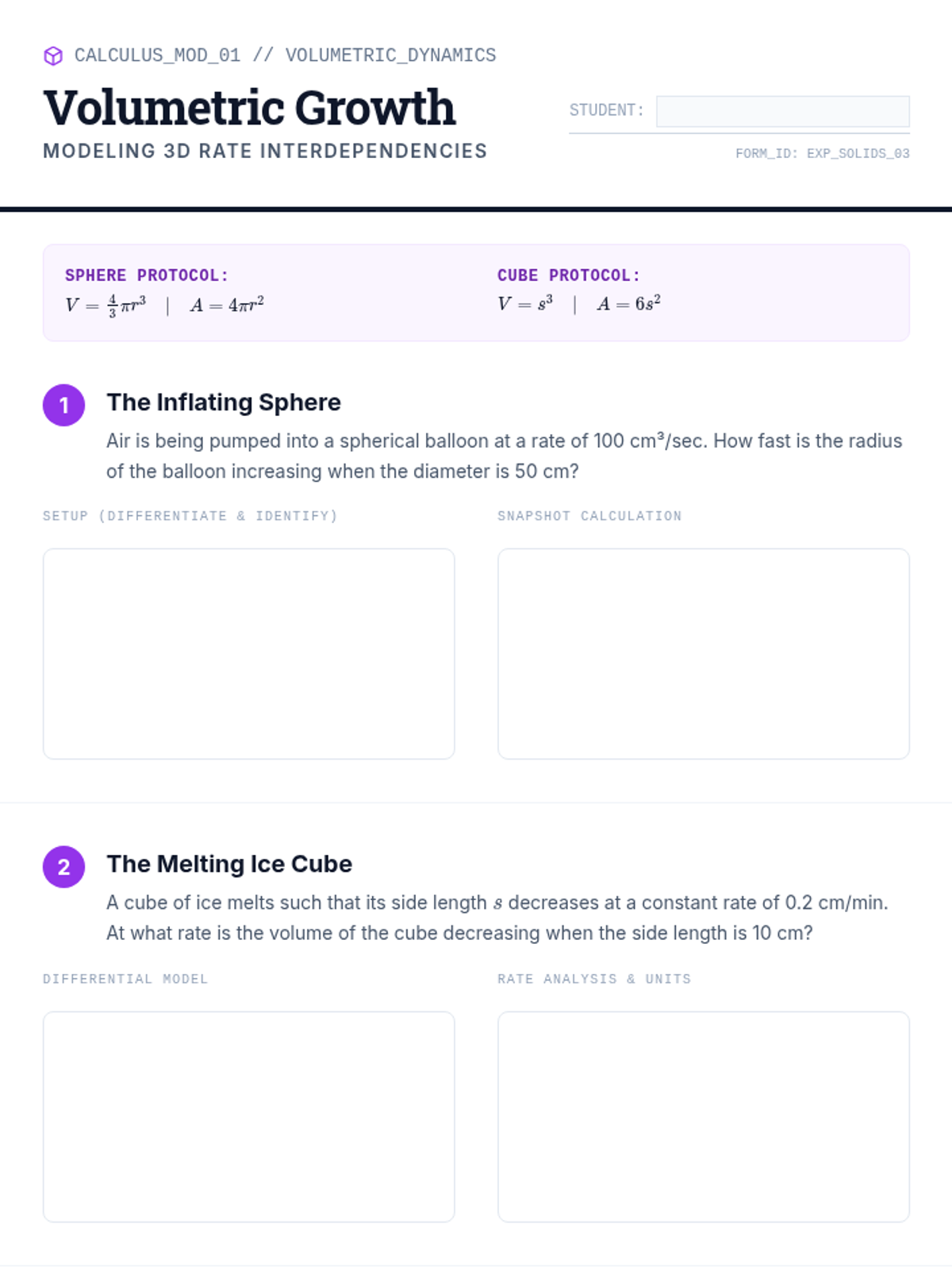 This sequence guides undergraduate students through the modeling and solution of related rates problems, bridging the gap between static algebraic formulas and dynamic calculus concepts. Students will master implicit differentiation with respect to time and apply it to linear motion, geometric expansion, angular velocity, and fluid dynamics.
