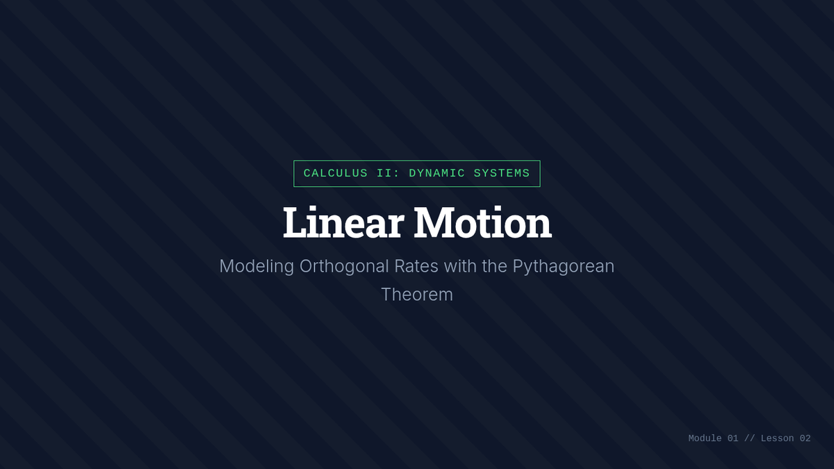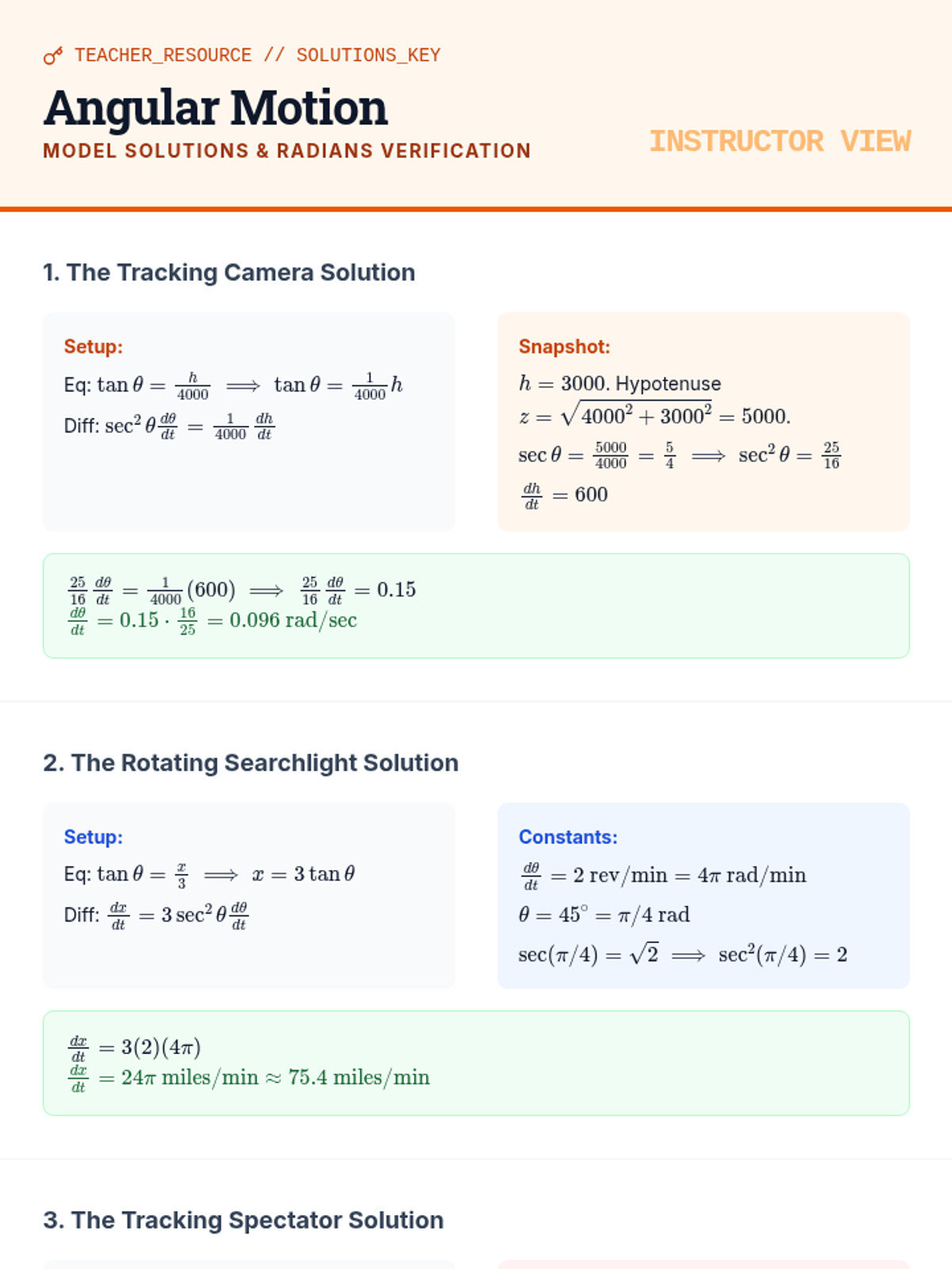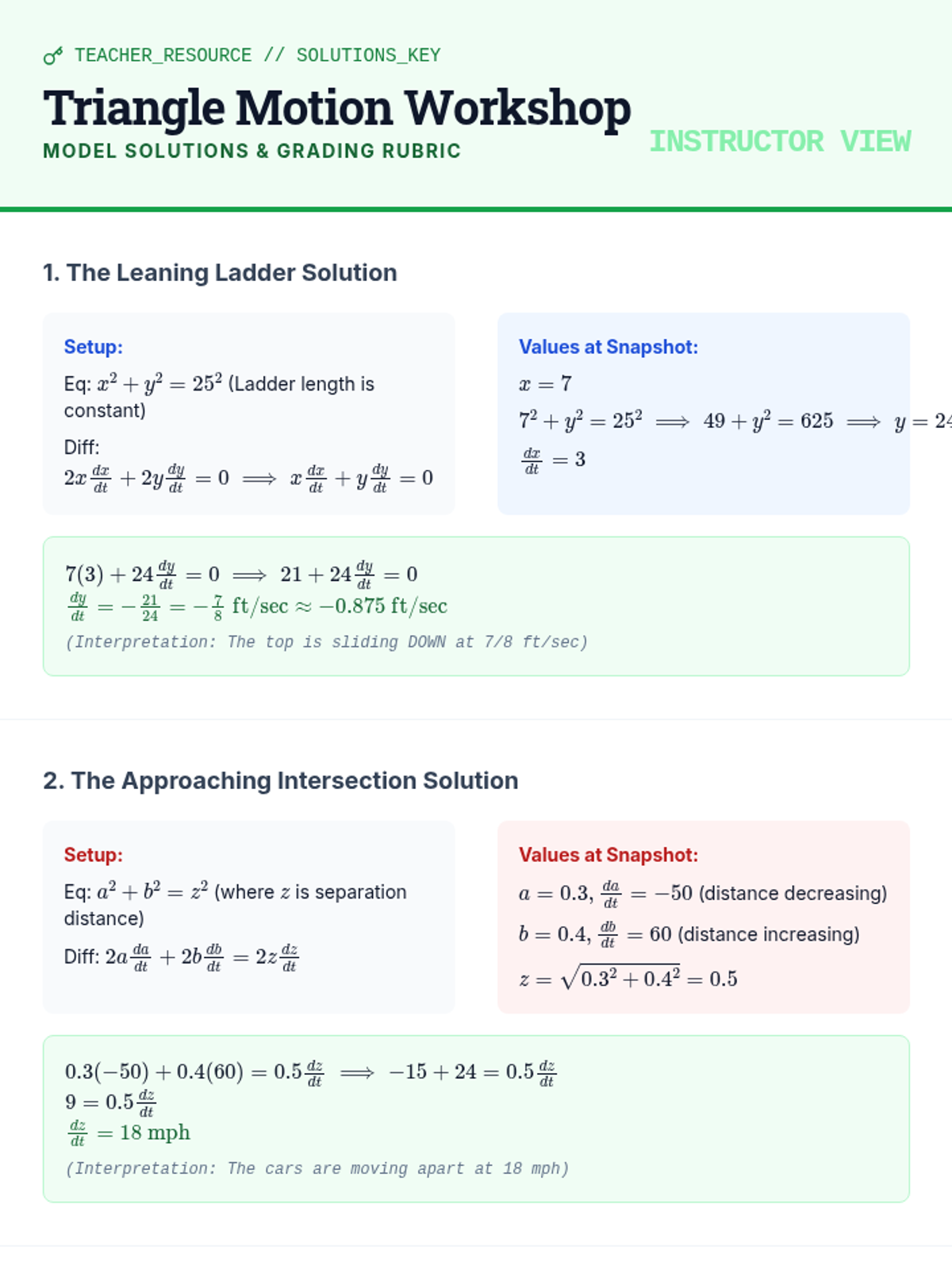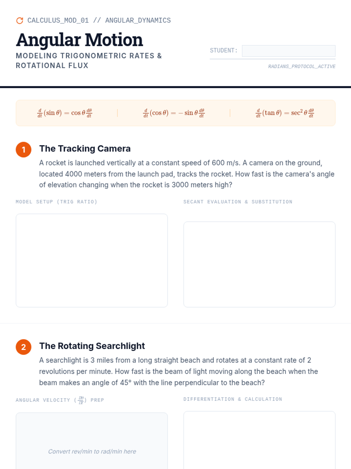 This sequence guides undergraduate students through the modeling and solution of related rates problems, bridging the gap between static algebraic formulas and dynamic calculus concepts. Students will master implicit differentiation with respect to time and apply it to linear motion, geometric expansion, angular velocity, and fluid dynamics.
